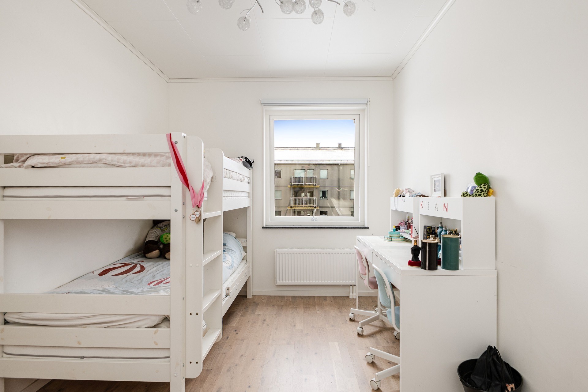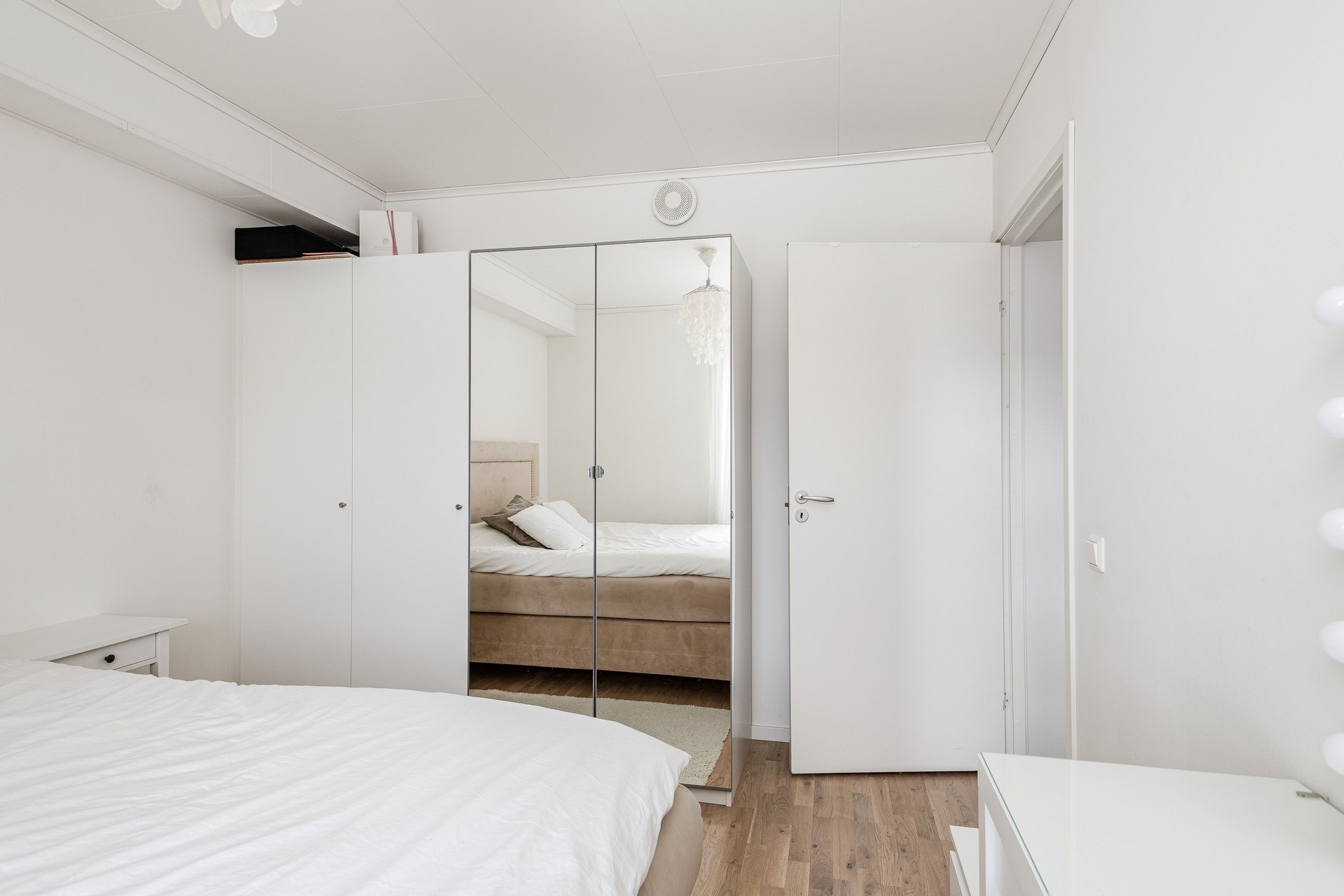 Rogivande och mysigt sovrum med målade väggar och parkettgolv. Gott om plats för säng, sängbord och skrivbord. Förvaring i garderober.
