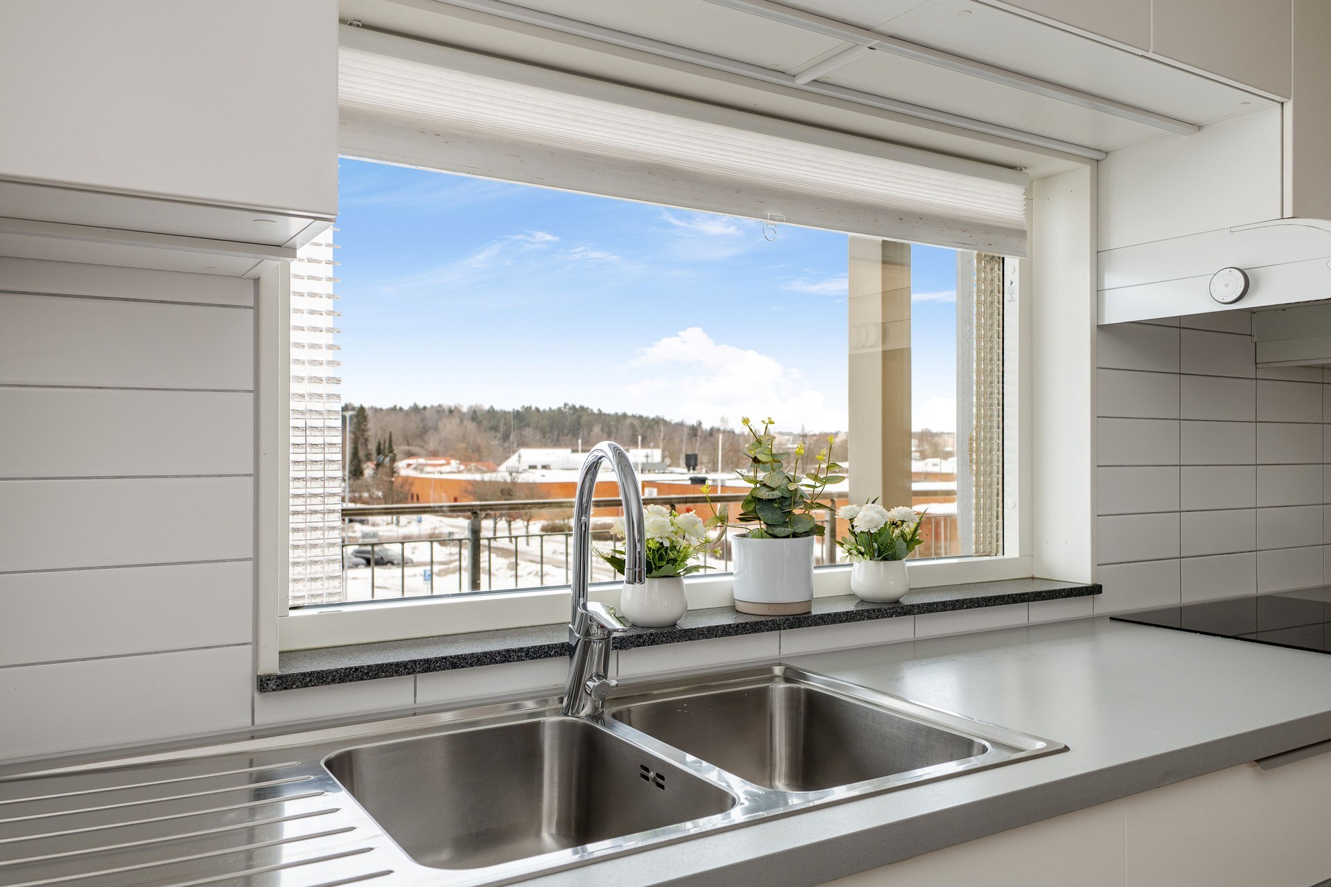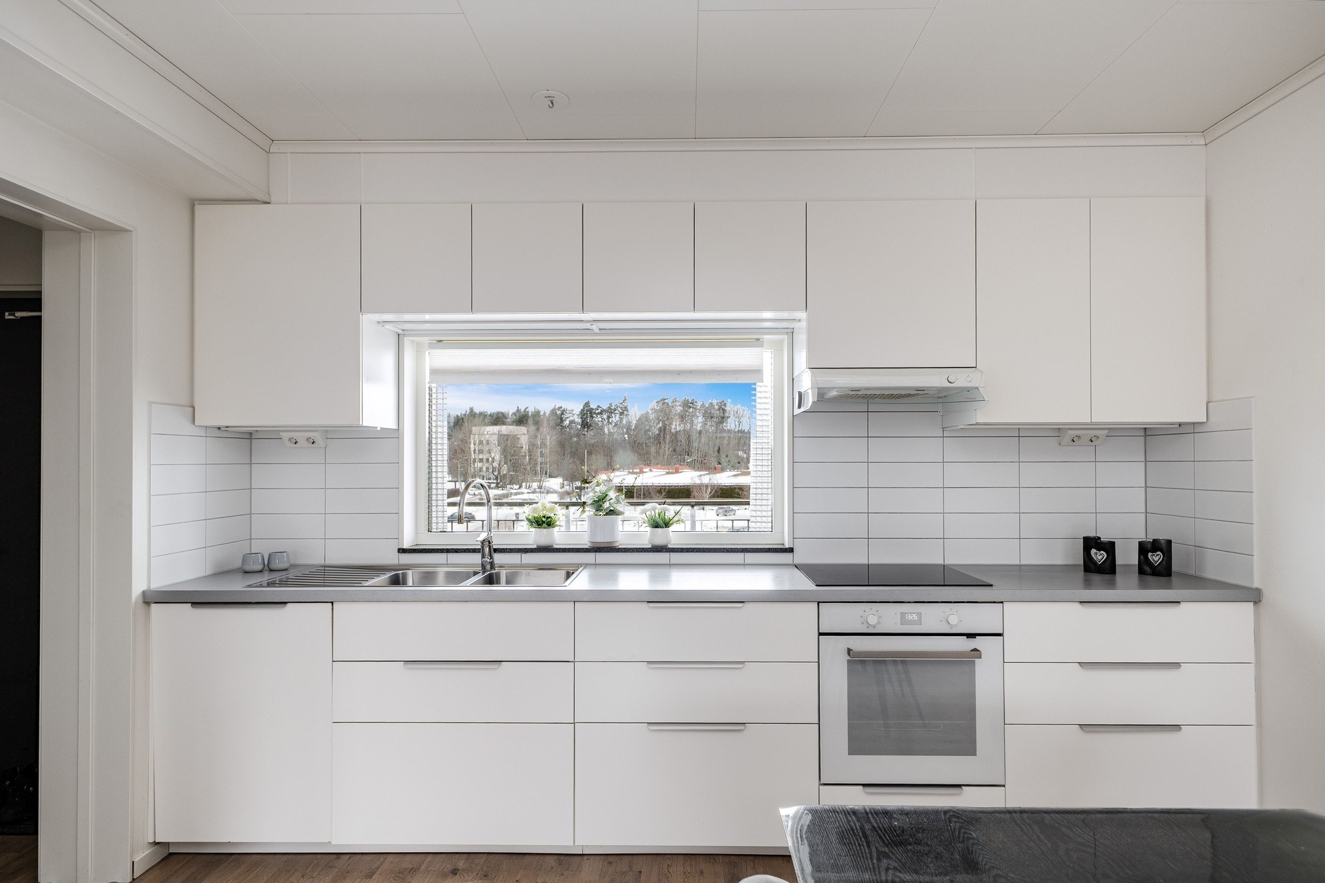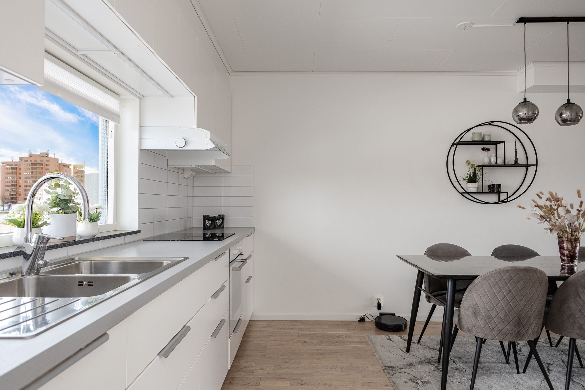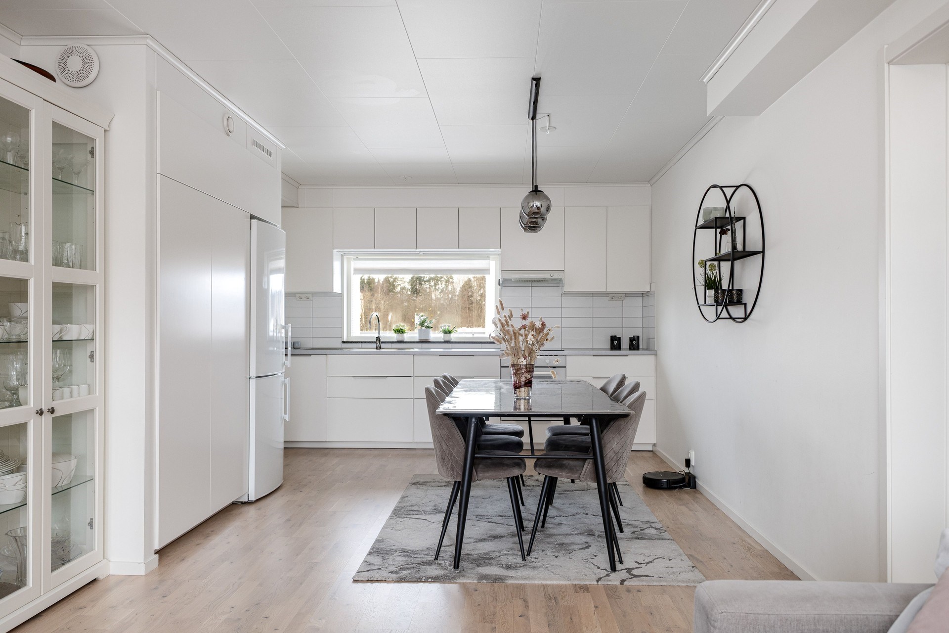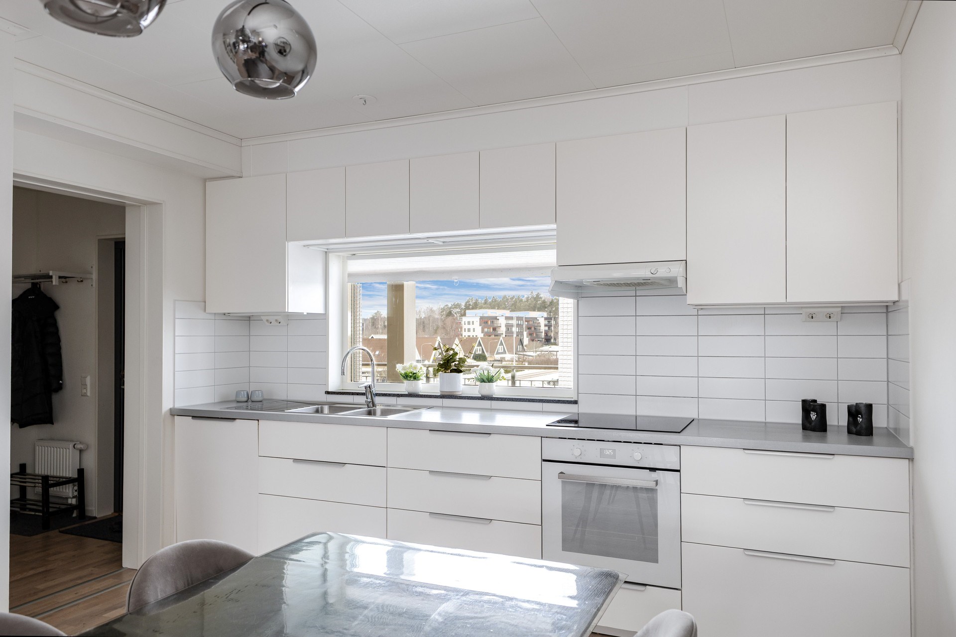 Modernt och lättarbetat kök. Kök med ljusa stilrena köksluckor som kombineras med ett vitt kakel ovan arbetsyta. Den maskinella utrustningen består av kyl, frys, ugn, spishäll, micro och diskmaskin. Väggarna är målade och golvet belagt med parkettgolv. Fönster vid diskoho med fri utsikt.