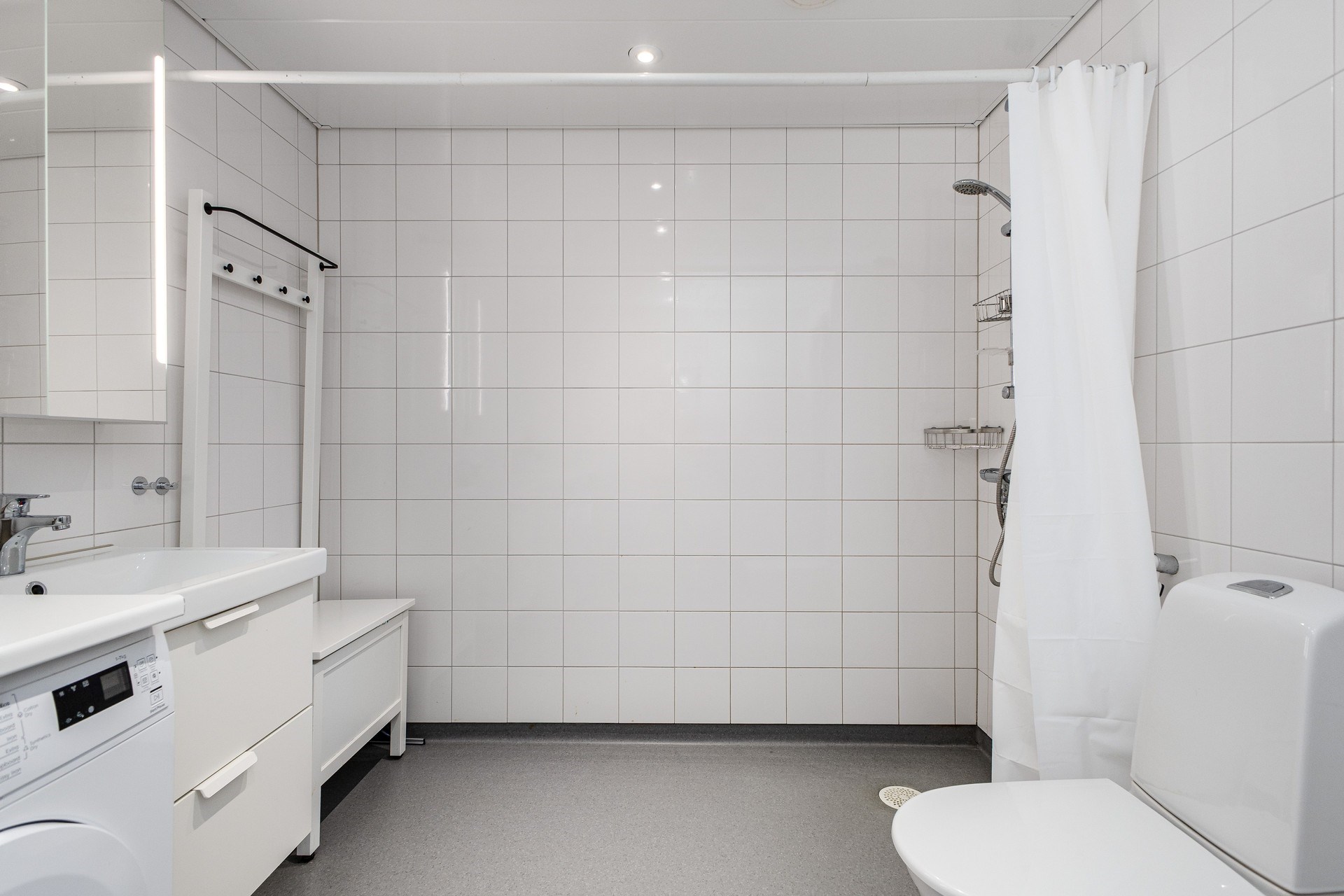 Helkaklat badrum med ljust kakel på väggarna och plastmatta på golv. Badrummet är utrustat med WC, kommod, spegel, tvättmaskin, torktumlare, handdukstork och dusch.