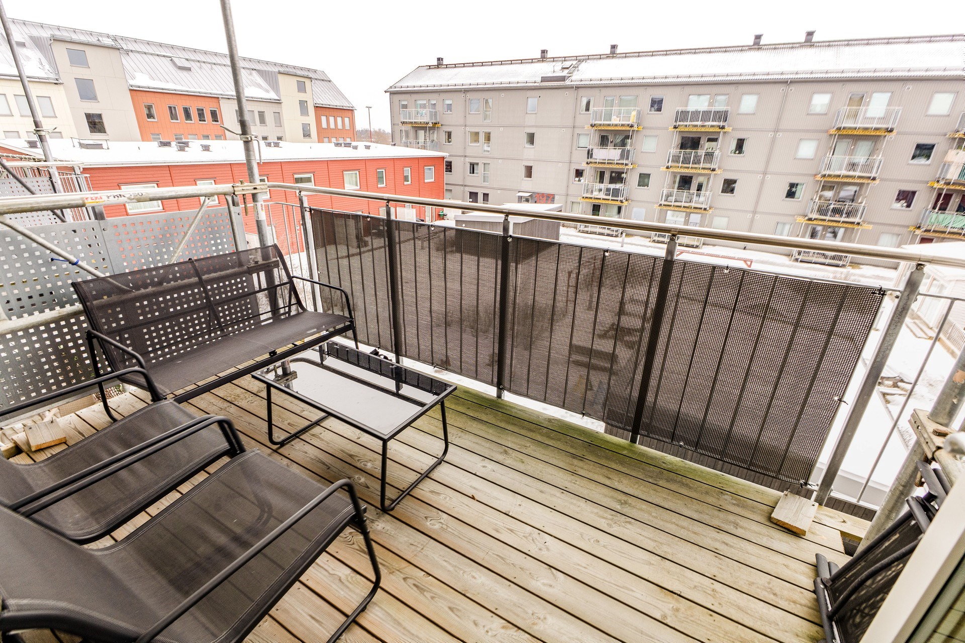 Bostaden erbjuder en öppen och social planlösning mellan kök och vardagsrum, vilket skapar en luftig känsla och fina ytor för både vardag och umgänge. Från vardagsrummet nås den generösa balkongen i söderläge, belägen mot lugn innergård – en perfekt plats för morgonkaffet och fina sommardagar Gott om plats till möblering med bord och stolar.