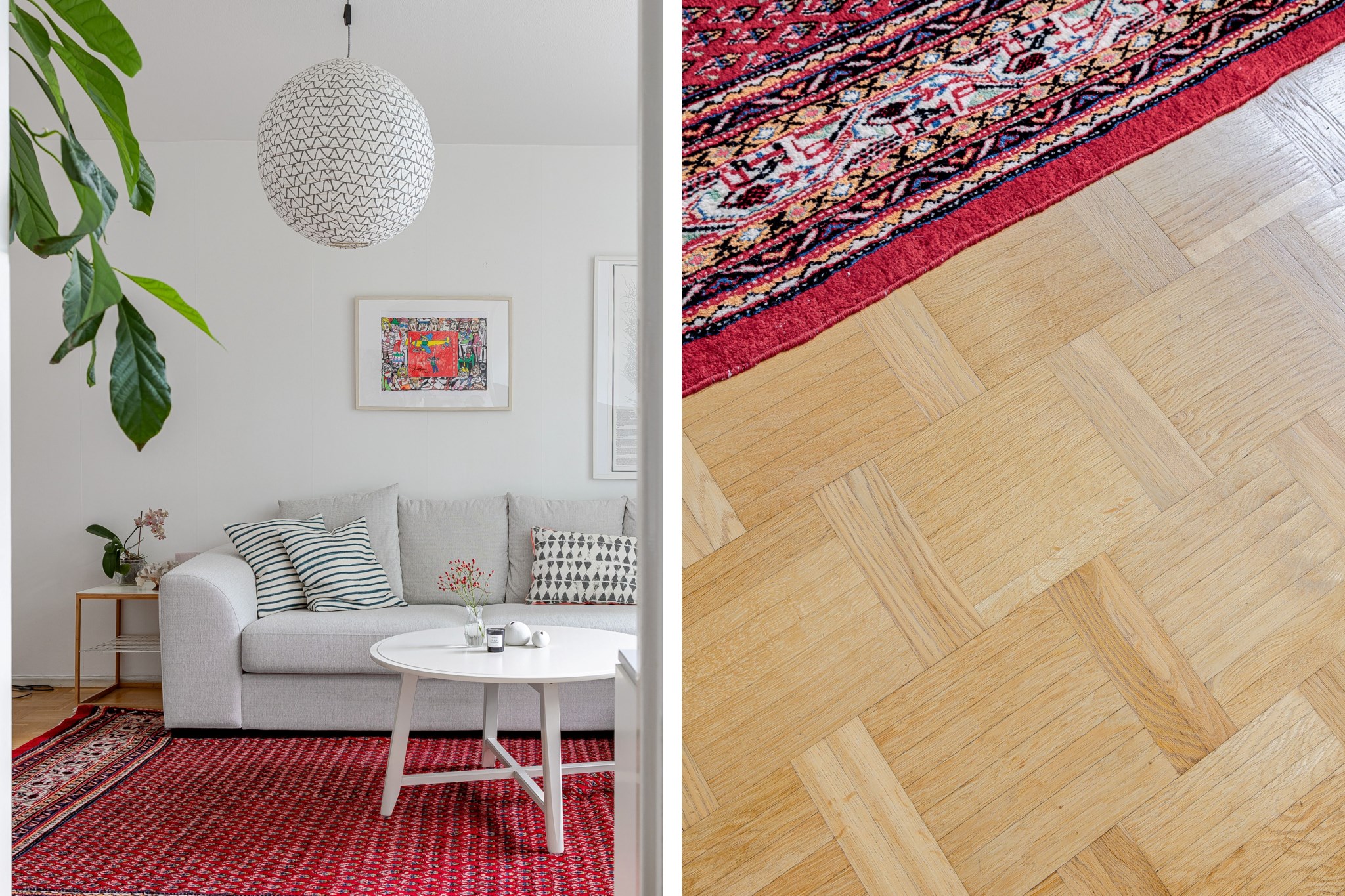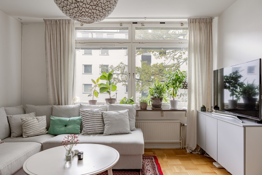 Trevligt vardagsrum med stora fönsterpartier som ger ett härligt ljusinsläpp. Plats för soffa, matbord och annan personlig inredning. Ljusmålade ytskikt och parkettgolv.