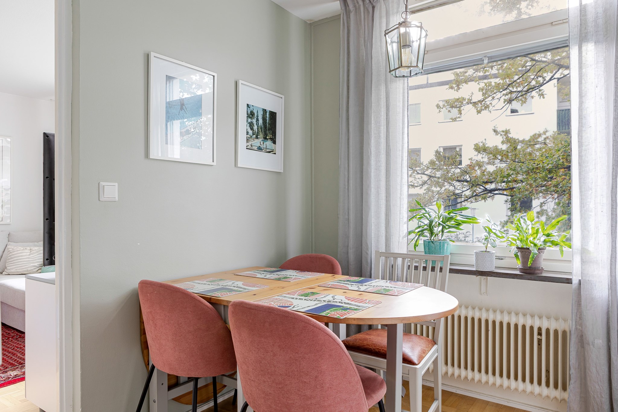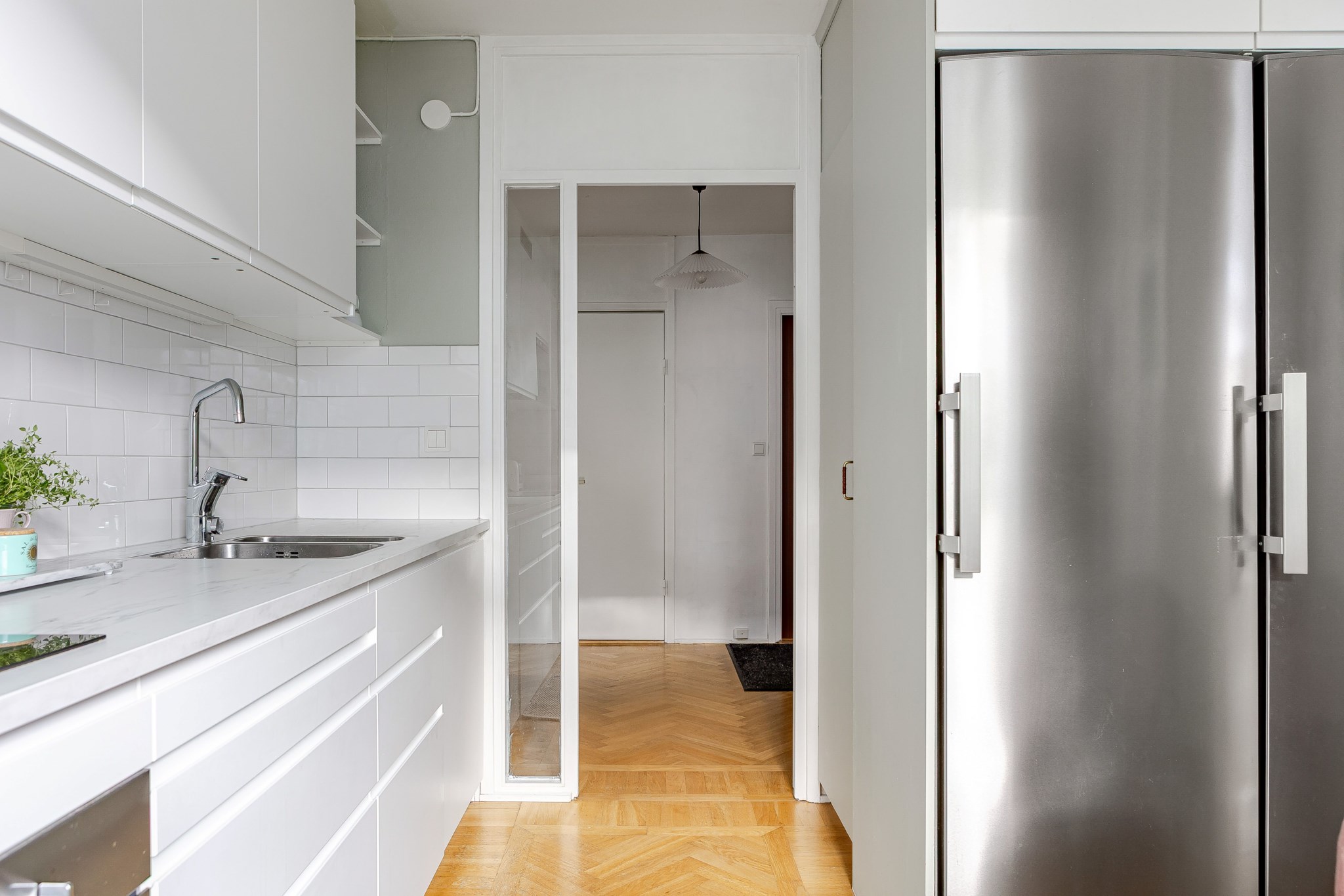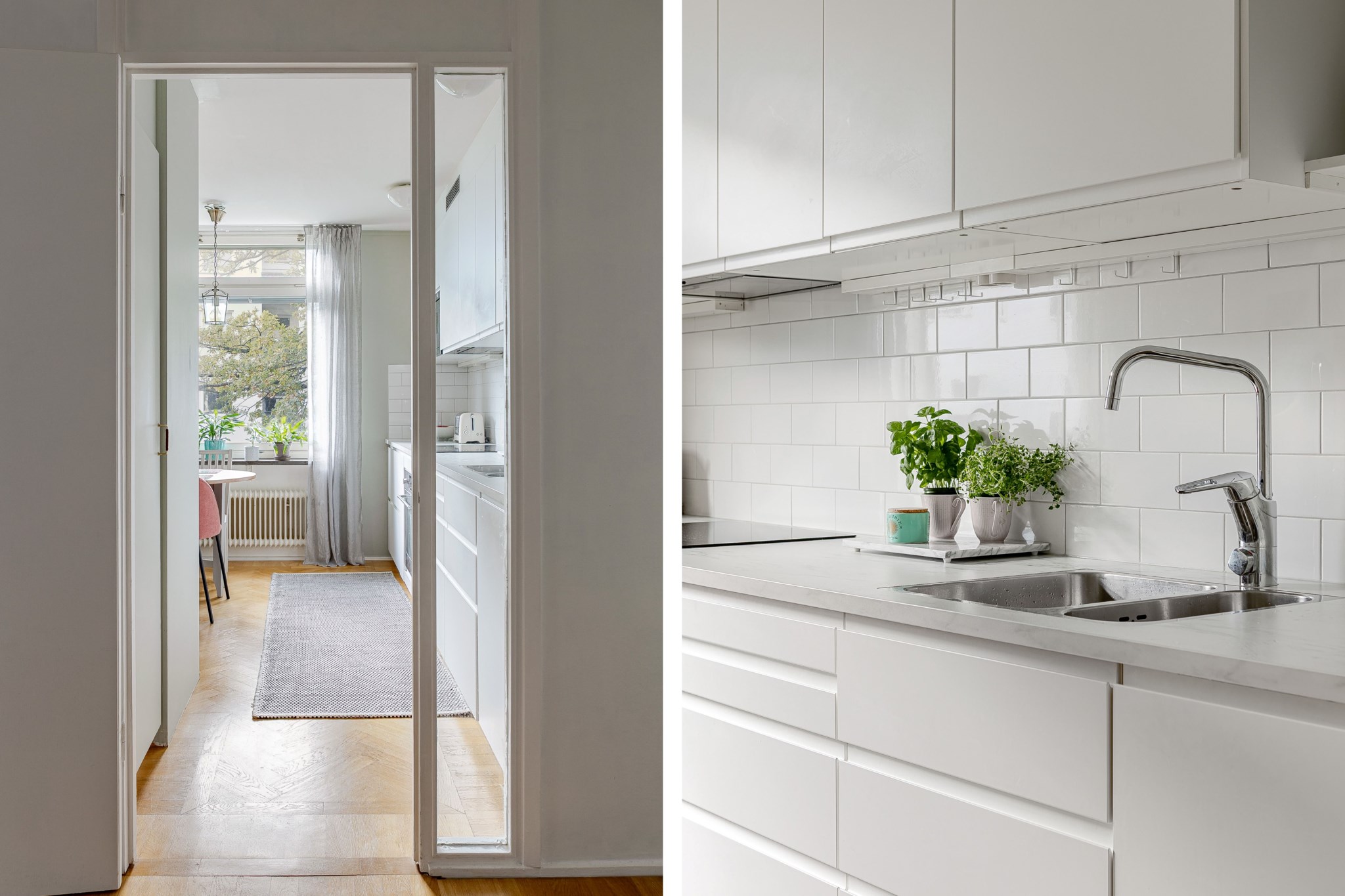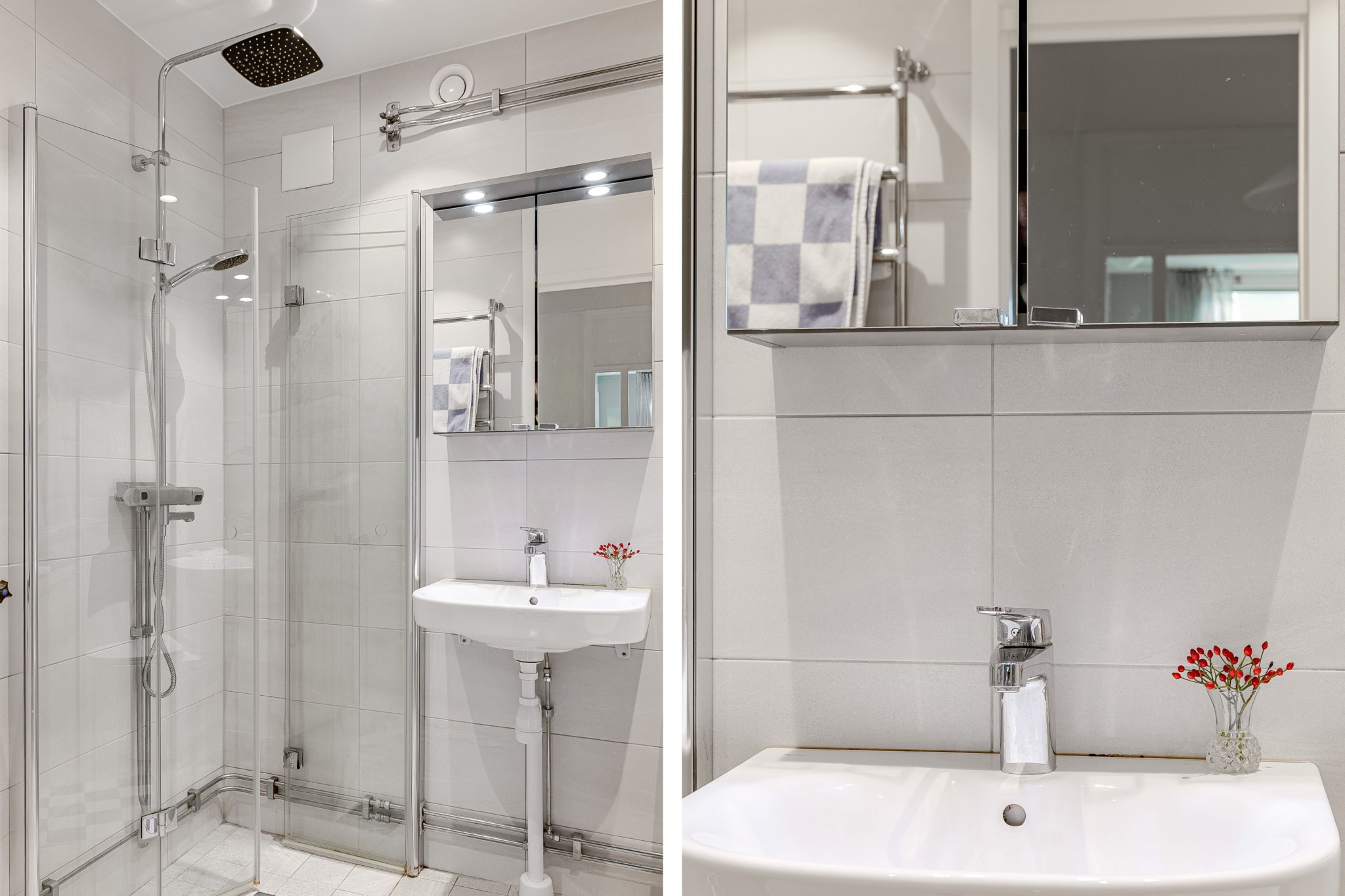 Det nyrenoverade badrummet från stambytet 2017/2018 är både stilrent och praktiskt, med förberedelse för tvättmaskin. Köket är funktionellt och inbjudande - en perfekt plats att samlas vid såväl vardagsmiddag som helgbrunch.
