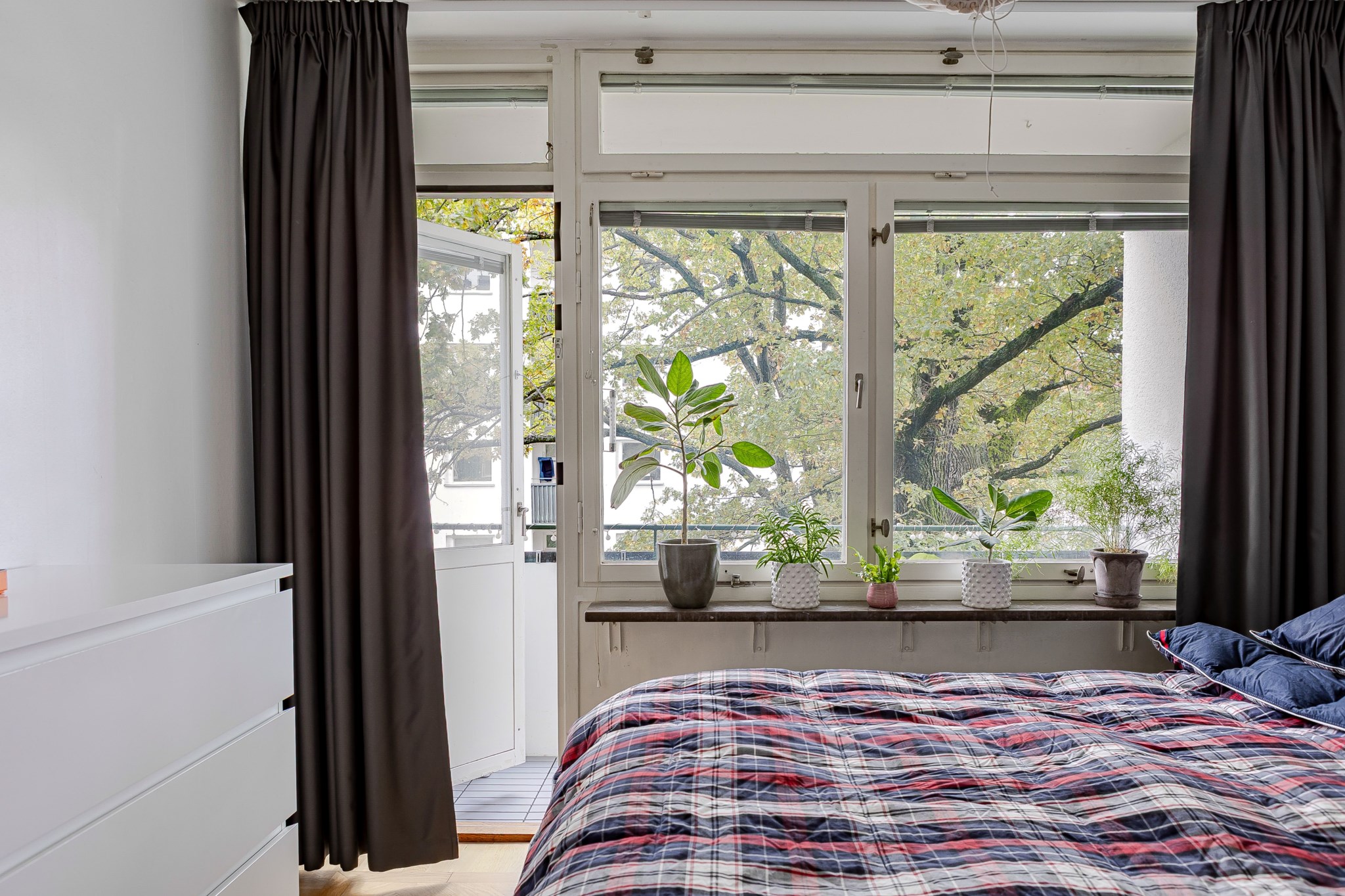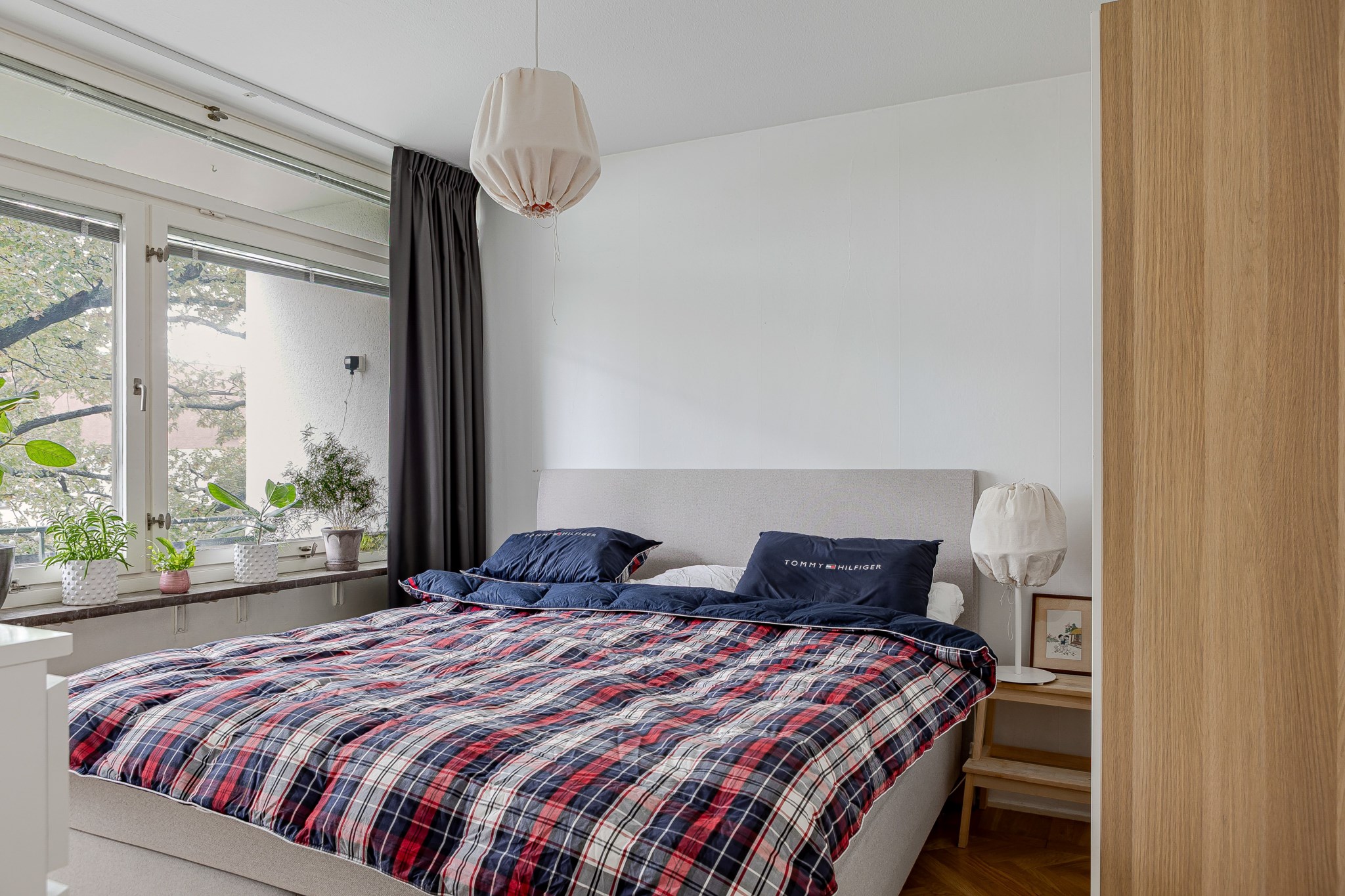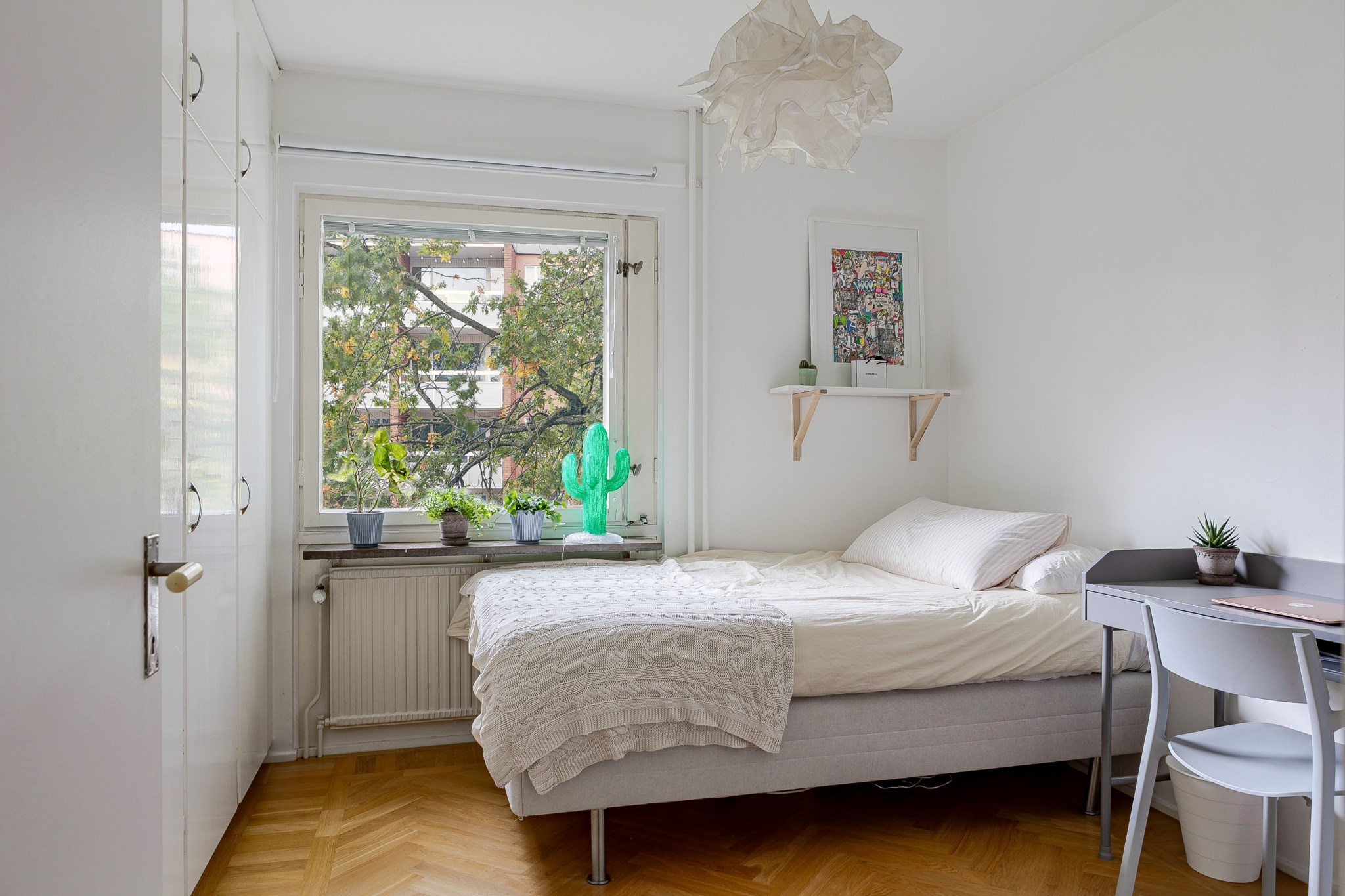 Rogivande sovrum med stort fönsterparti och balkongöppning som leder ut till bostadens balkong. Här finns plats för säng med tillhörande sängbord samt goda förvaringsmöjligheter i garderob. Ljusa ytskikt och ljust golv.