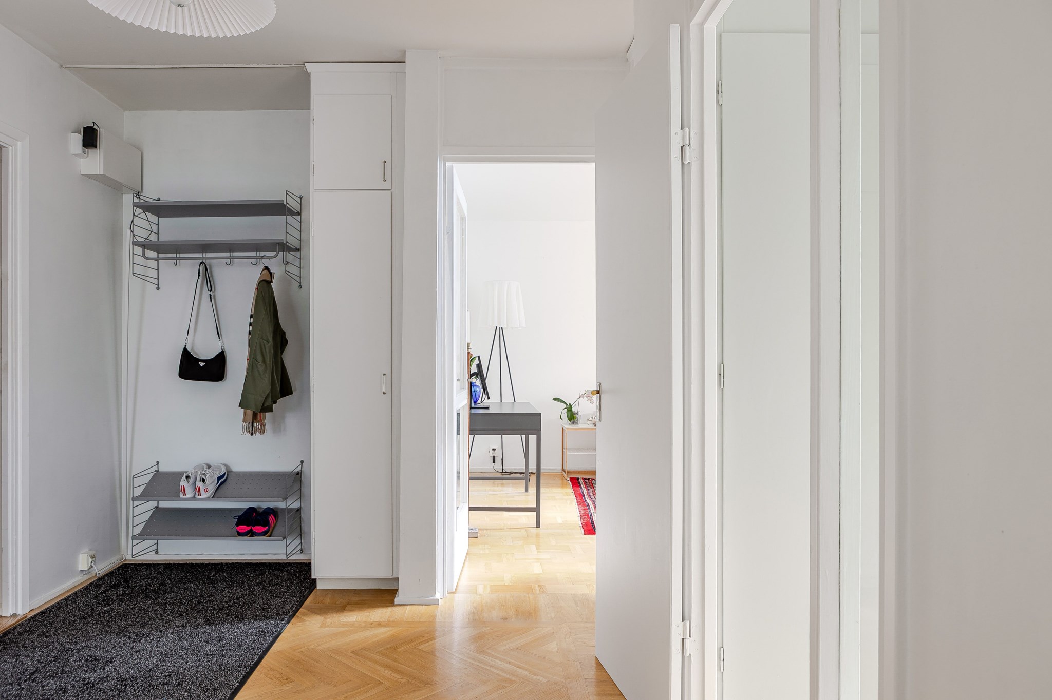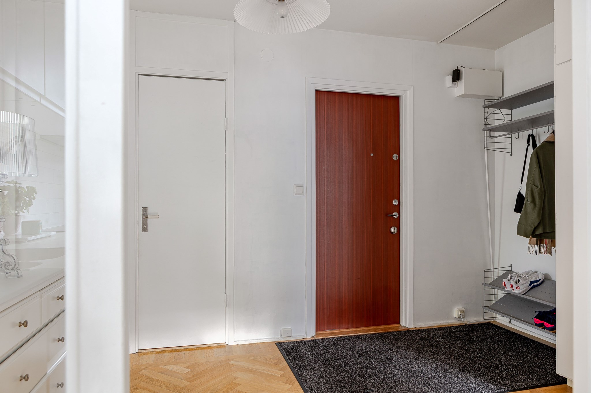 Välkomnande hall med plats för hatthylla för praktisk avhängning av ytterkläder och skor direkt intill ytterdörren. Ytterligare förvaring finns i en mindre garderob och det finns även möjlighet att komplettera med annan förvaringsmöbel vid behov. Ljusmålade ytskikt och golv i elegant fiskbensmönster.