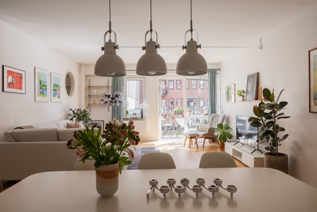 Bostaden erbjuder ett fantastiskt ljusinsläpp tack vare stora fönsterpartier och en social, öppen planlösning där vardagsrum, kök och matplats samspelar på ett naturligt sätt. Det stilrena köket är välutrustat och erbjuder god förvaring i både skåp och lådor.