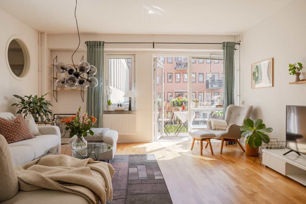 Från vardagsrummet nås bostadens balkong – en given favoritplats med fin utsikt och utrymme för både avkoppling och umgänge.