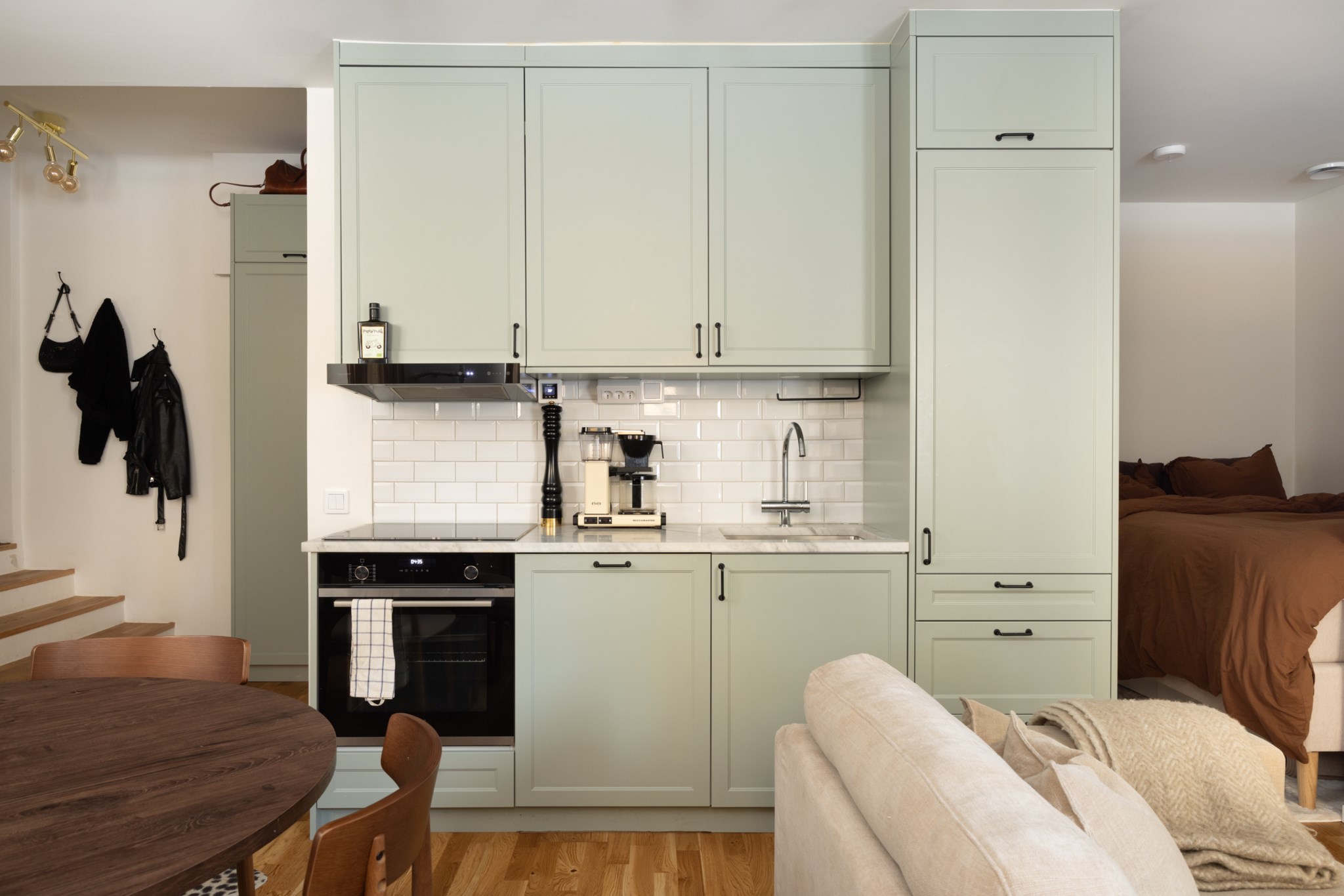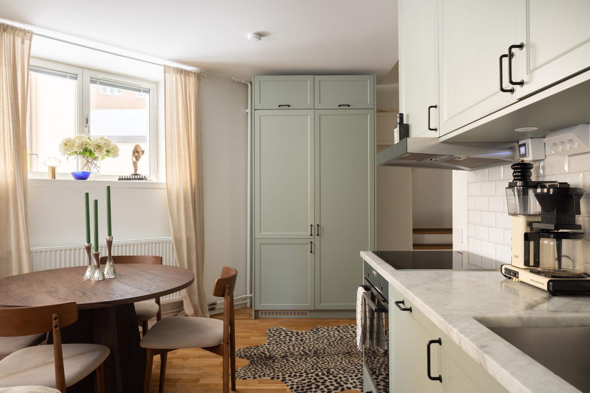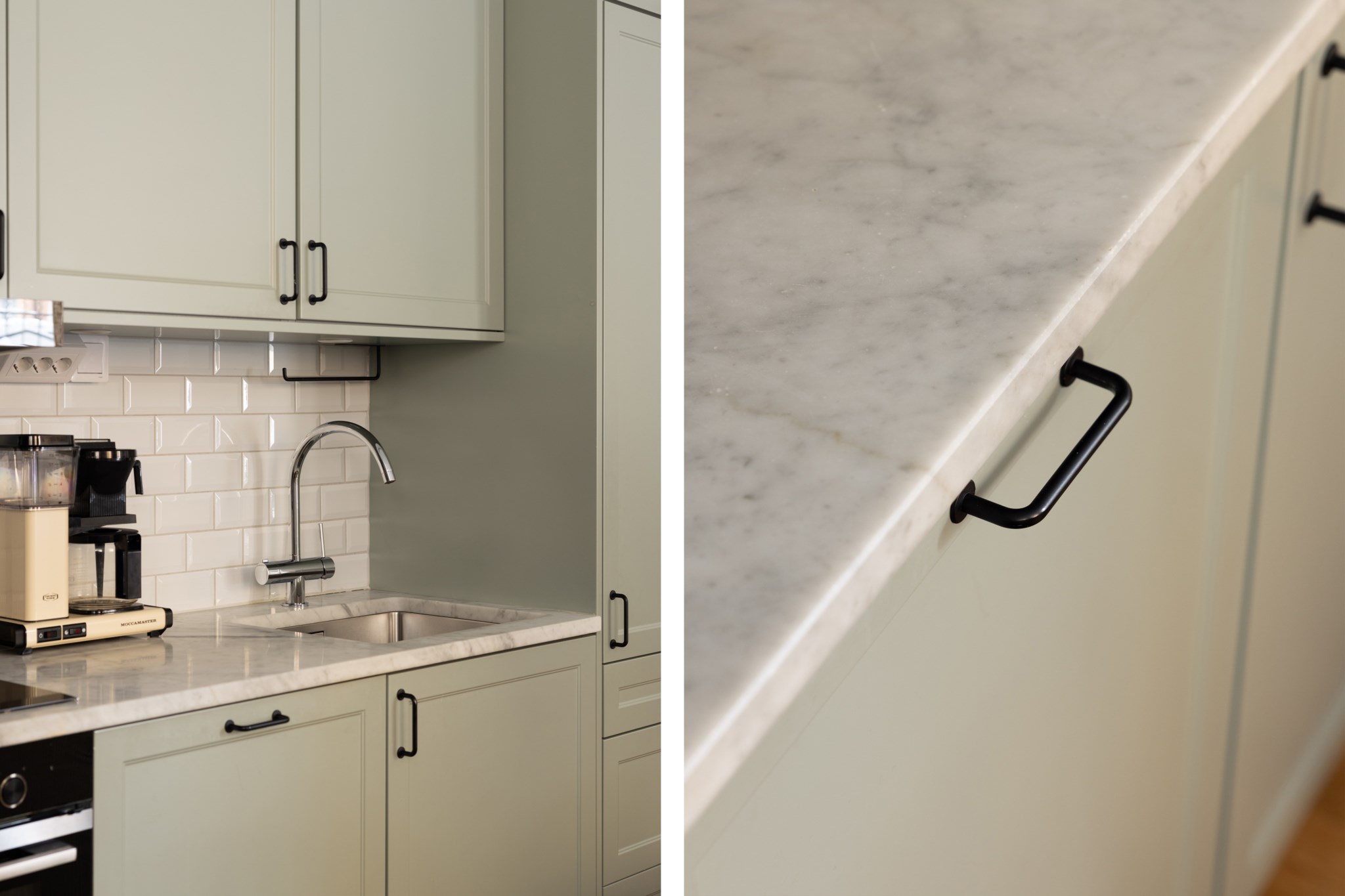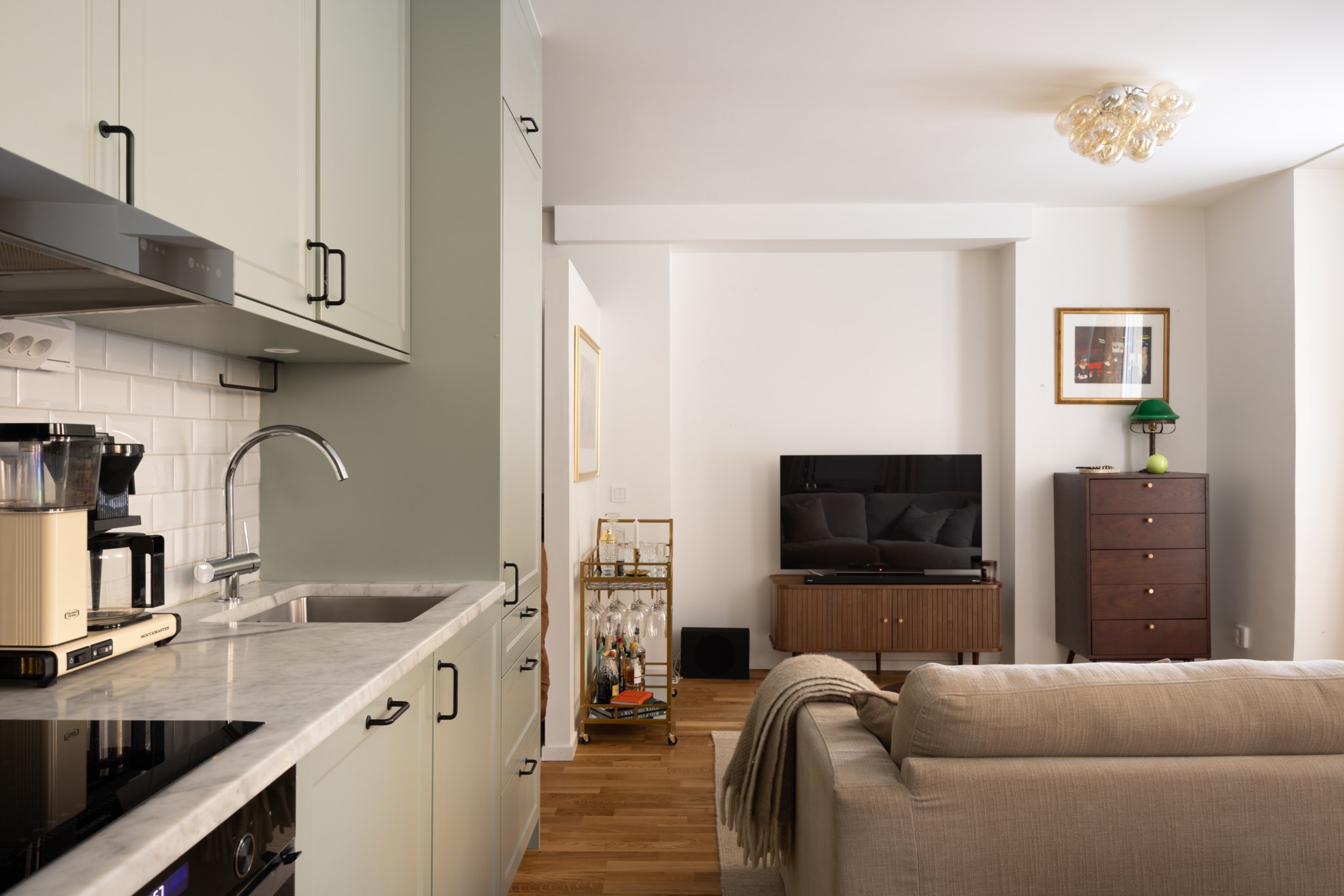 Köket är placerat i social planlösning med vardagsrummet. Tidlösa materialval bestående av köksluckor i en dov, grön nyans, bänkskiva i marmor och kakel ovan i vitt. Utrustat med diskho, spis, fläkt, ugn, diskmaskin samt kyl och frys. Ytskikten består av ljusa väggar och ljust golv.