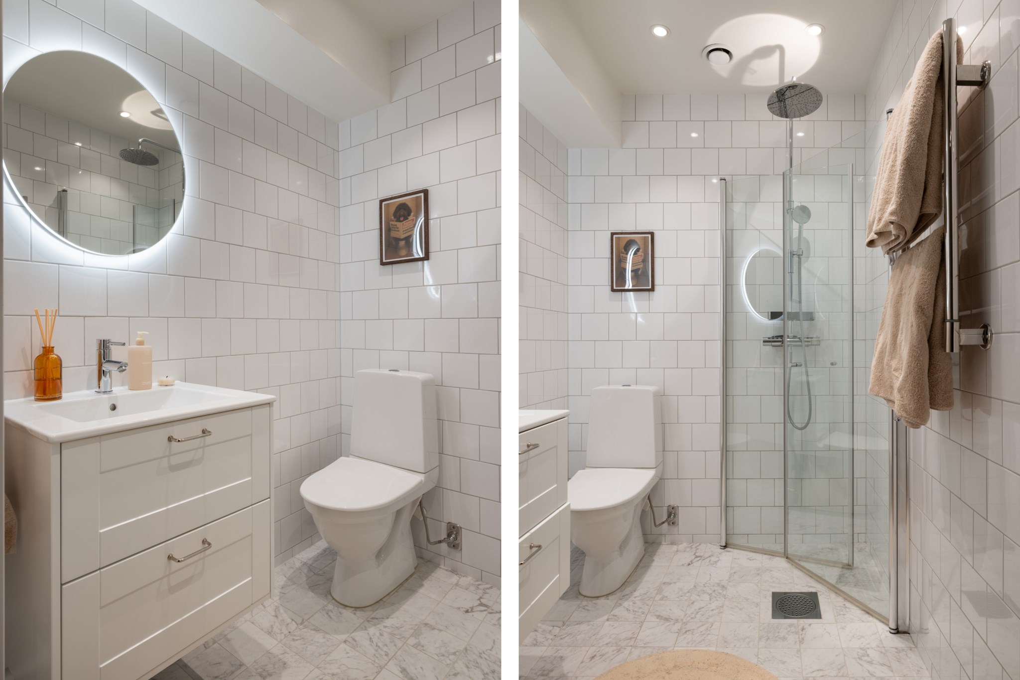Rymligt och modernt badrum med ljust kakel och ljust klinker. Badrummet är utrustat med WC, handfat ovan kommod, spegel med belysning, handdukstork samt dusch med glasväggar. Perfekt belysning via spotlights i tak.