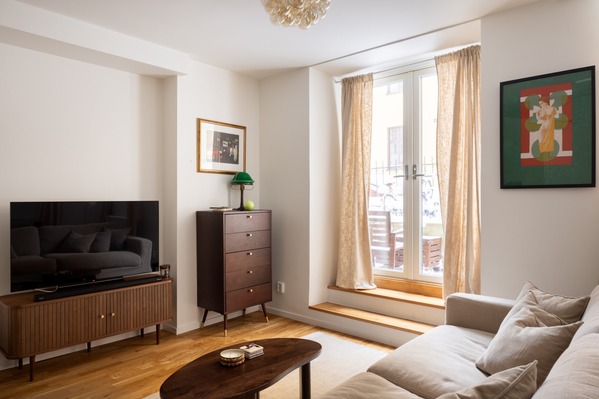 Luftigt allrum med bra ljusinsläpp via stora fönster mot innergården. Smakfulla ytskikt bestående av ljusa väggar och ljust golv. I allrummet inryms soffa, soffbord, TV-möbel, matbord och annat möblemang efter smak och behov. Rummet är utrustat med Plejd-belysning. Från allrummet nås bostadens mysig uteplats via dubbeldörrar.