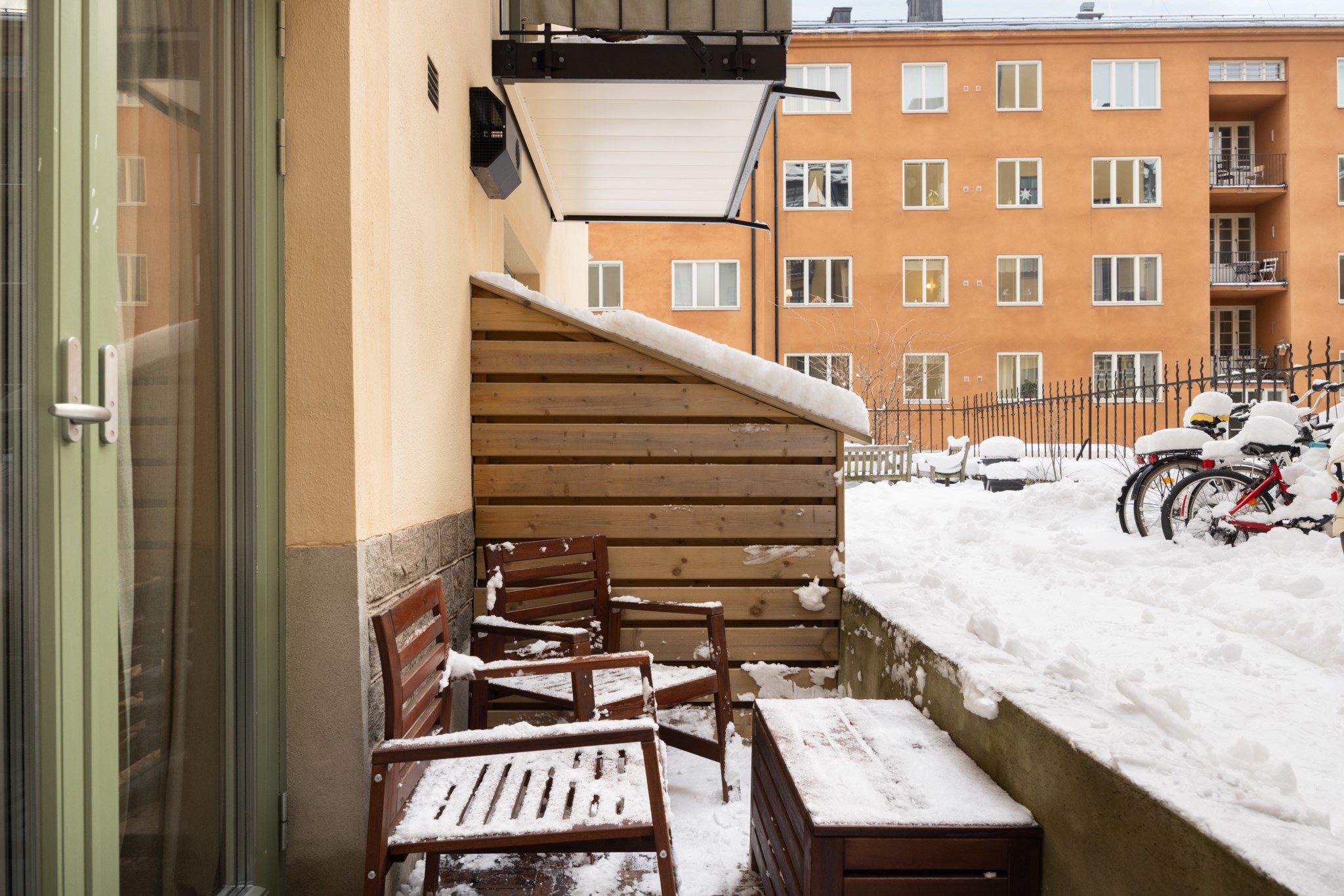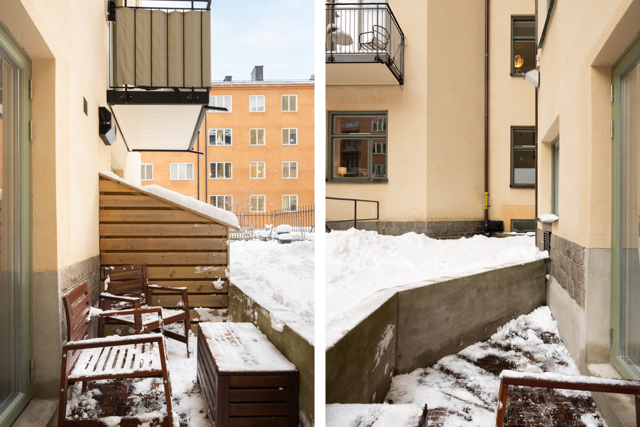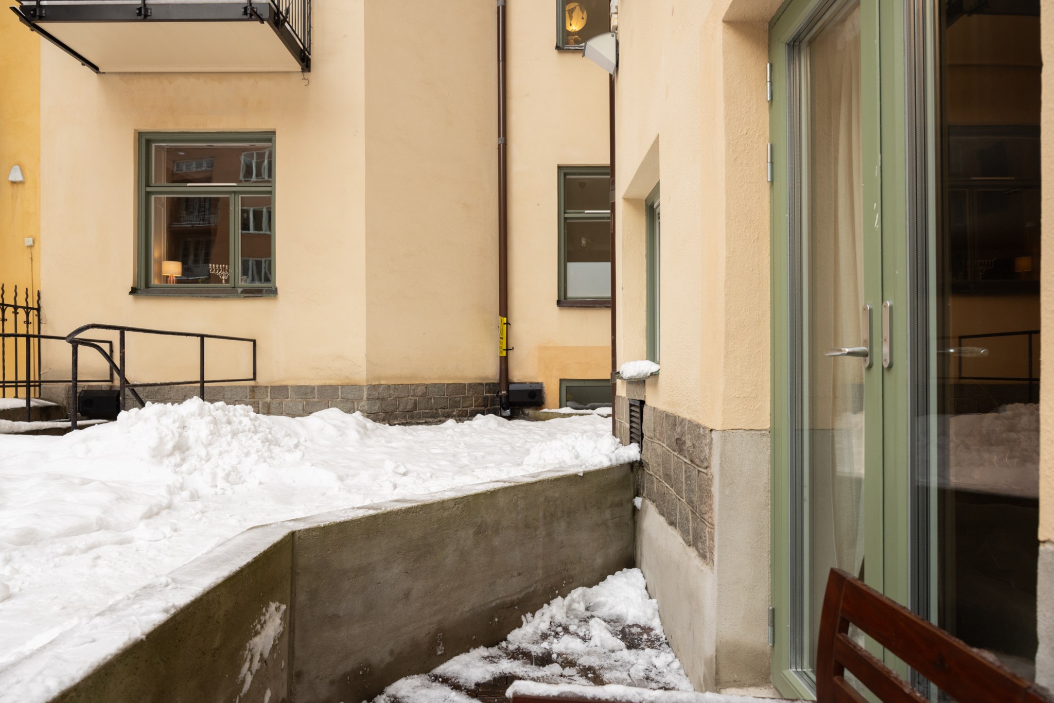 Till lägenheten hör en mysig uteplats med plats för möbelgrupp.