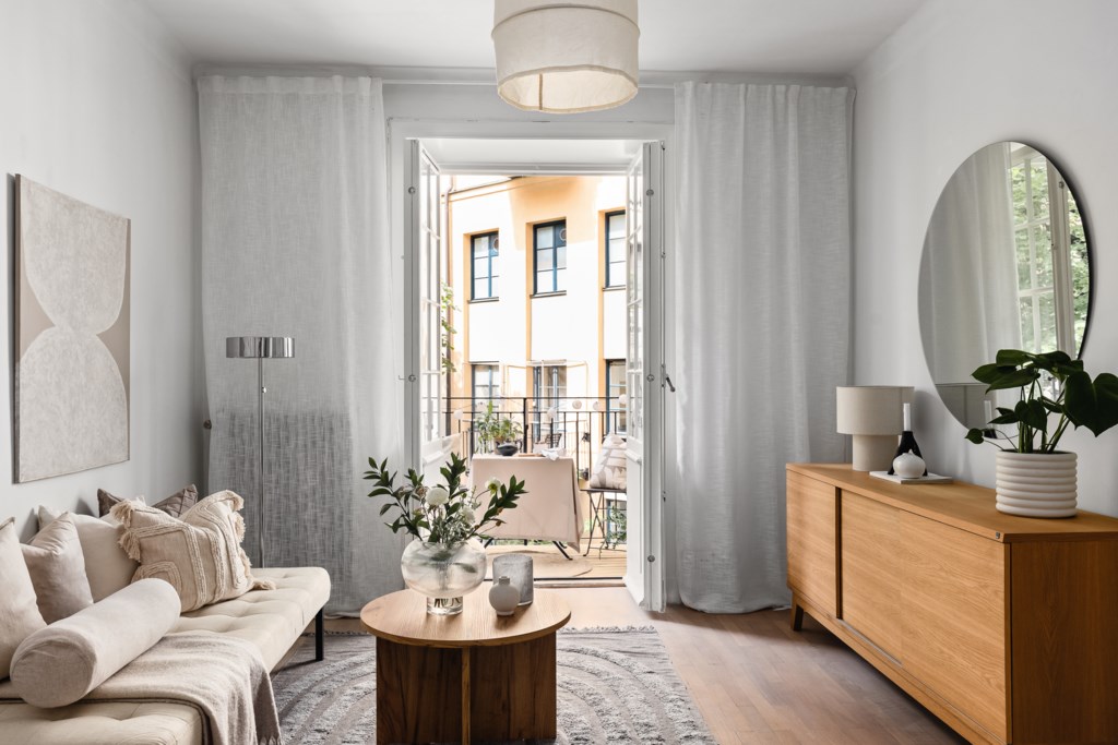 Luftigt vardagsrum med ljust golv och ljusa väggar med plats för soffdel, matplats och TV-möblemang. Från vardagsrummet nås även lägenhetens balkong. En alkov som fungerar perfekt för extra säng eller kontorsmöbler.