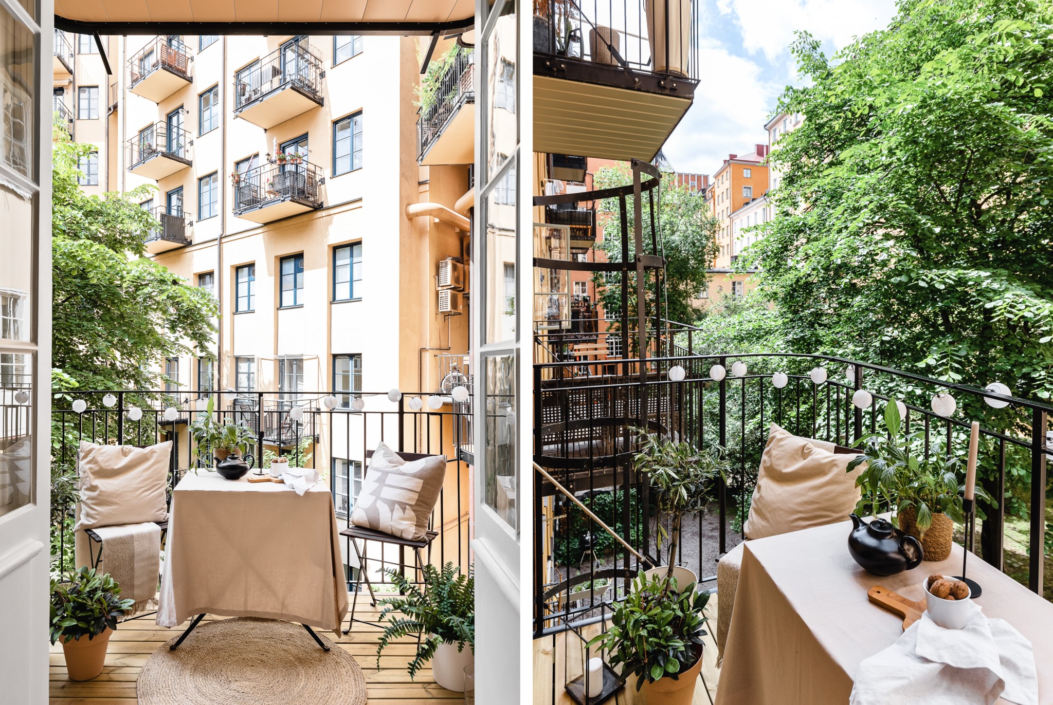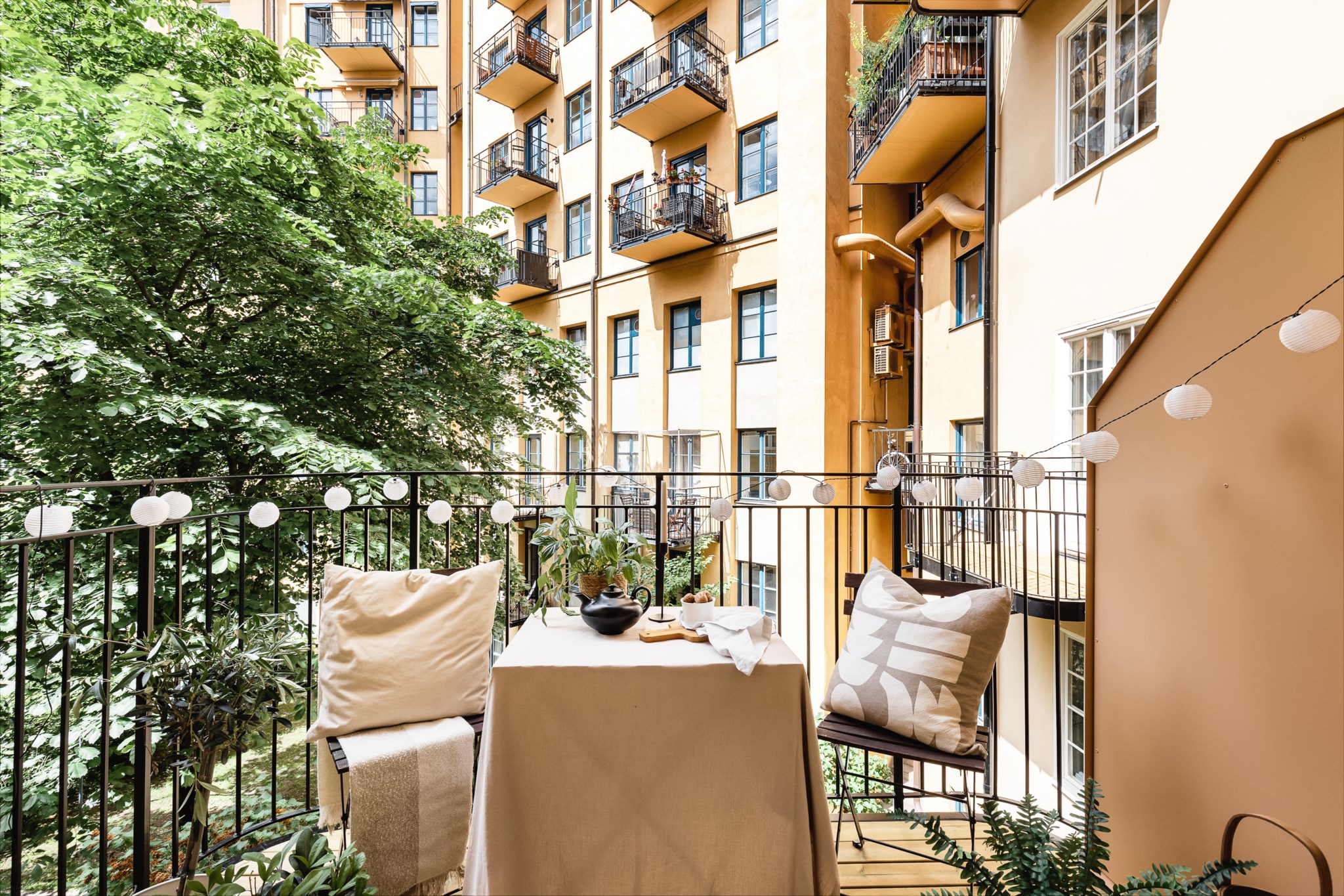 Mysig balkong med plats för bord och stolar omgiven av grönska.