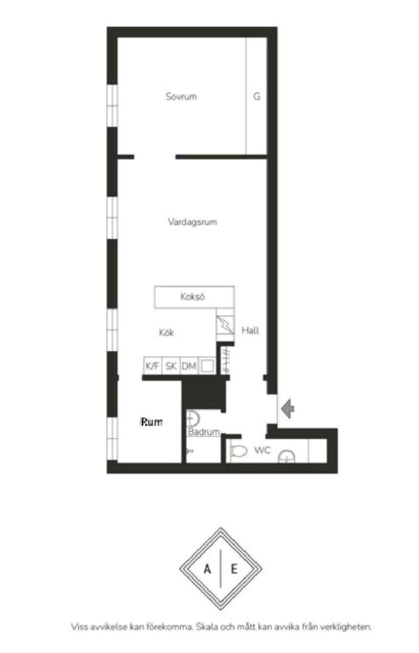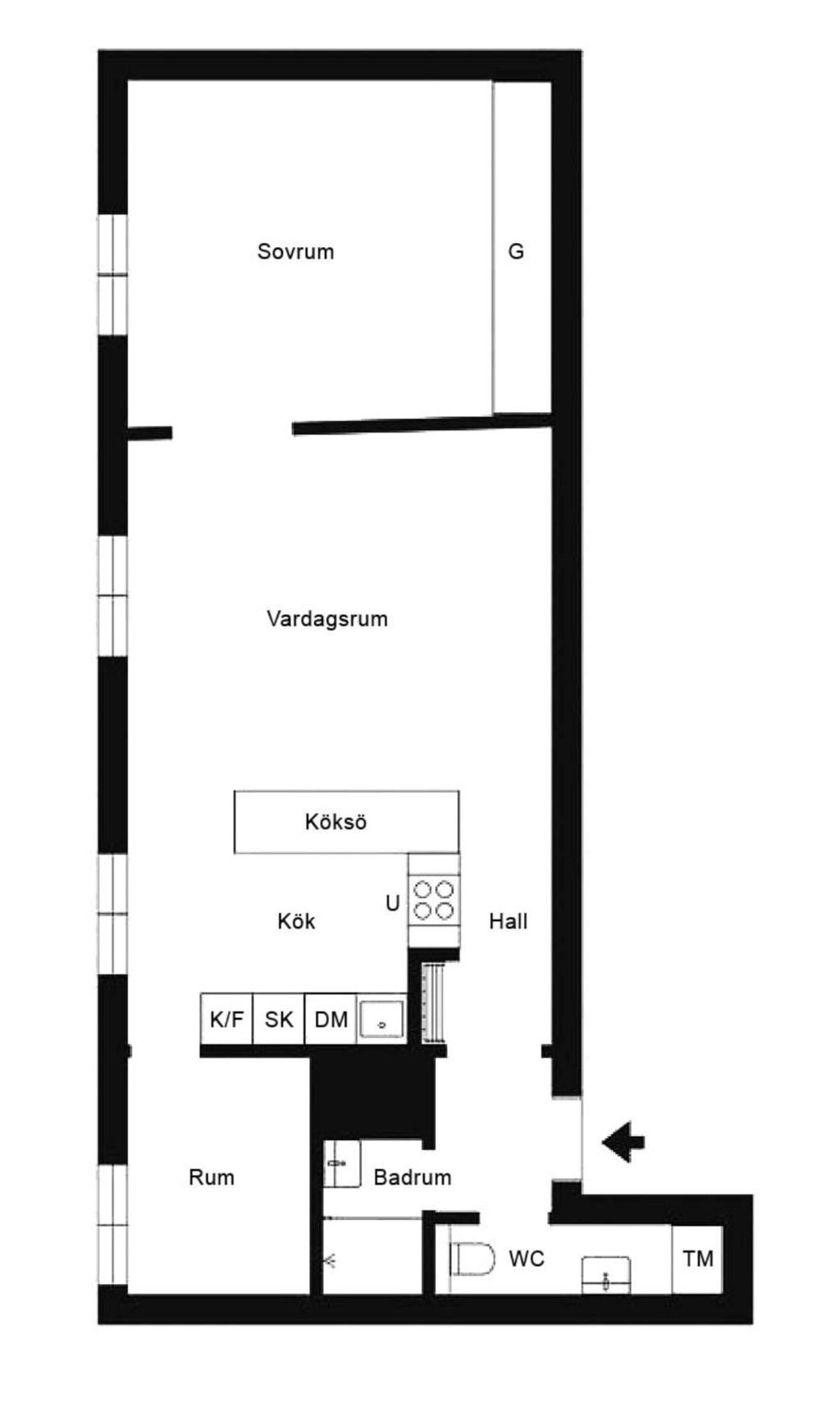 Här trivs du som uppskattar en social planlösning med ett rymligt kök designat i smakfull stil. Bostaden har ett större sovrum med generösa förvaringsmöjligheter samt ett mindre rum med platsbyggd säng. Det mindre rummet nyttjas med fördel som sovrum eller kontor.
