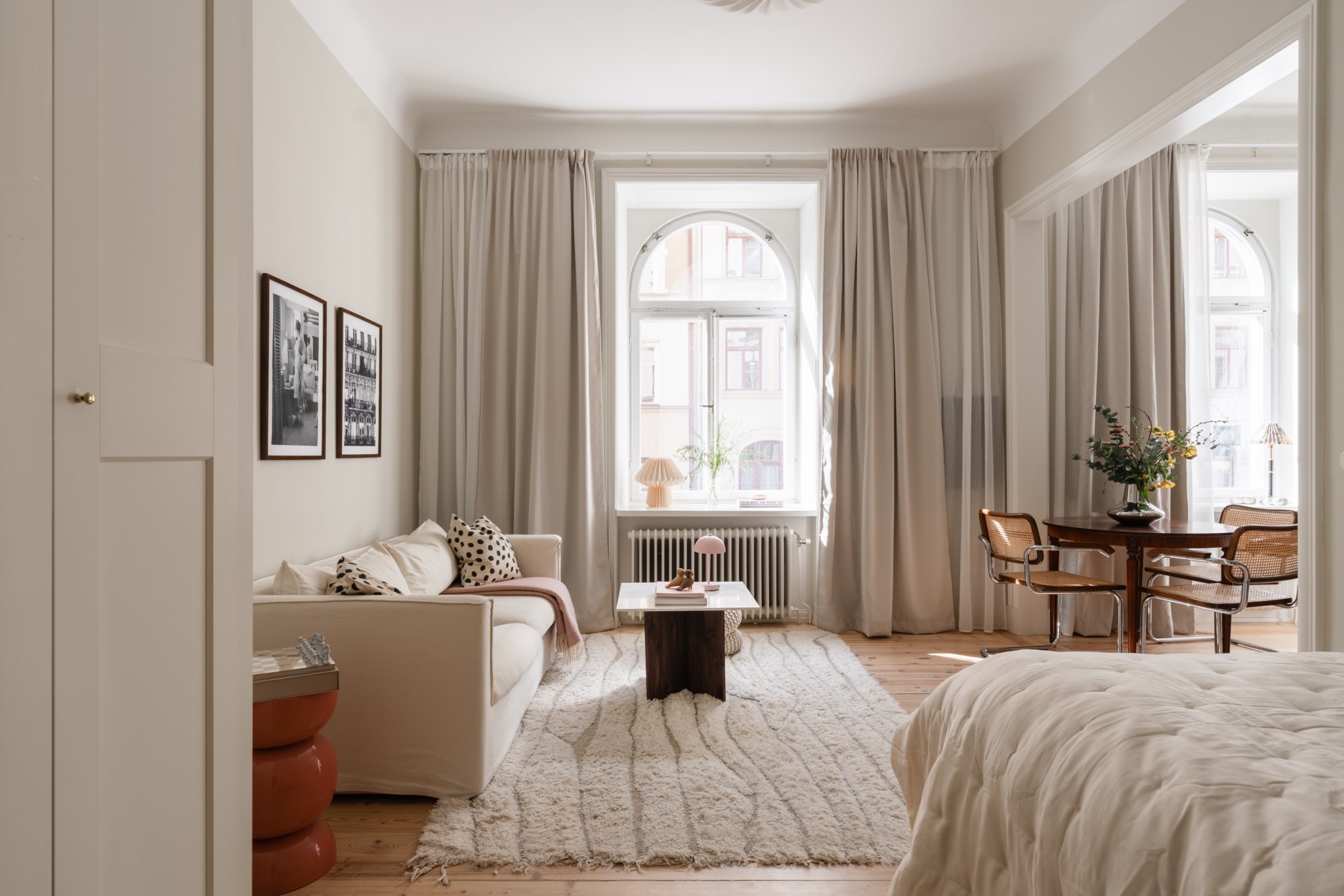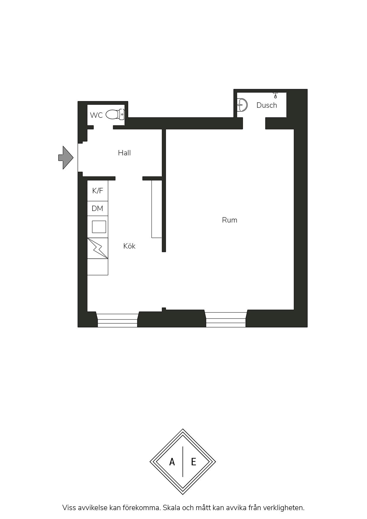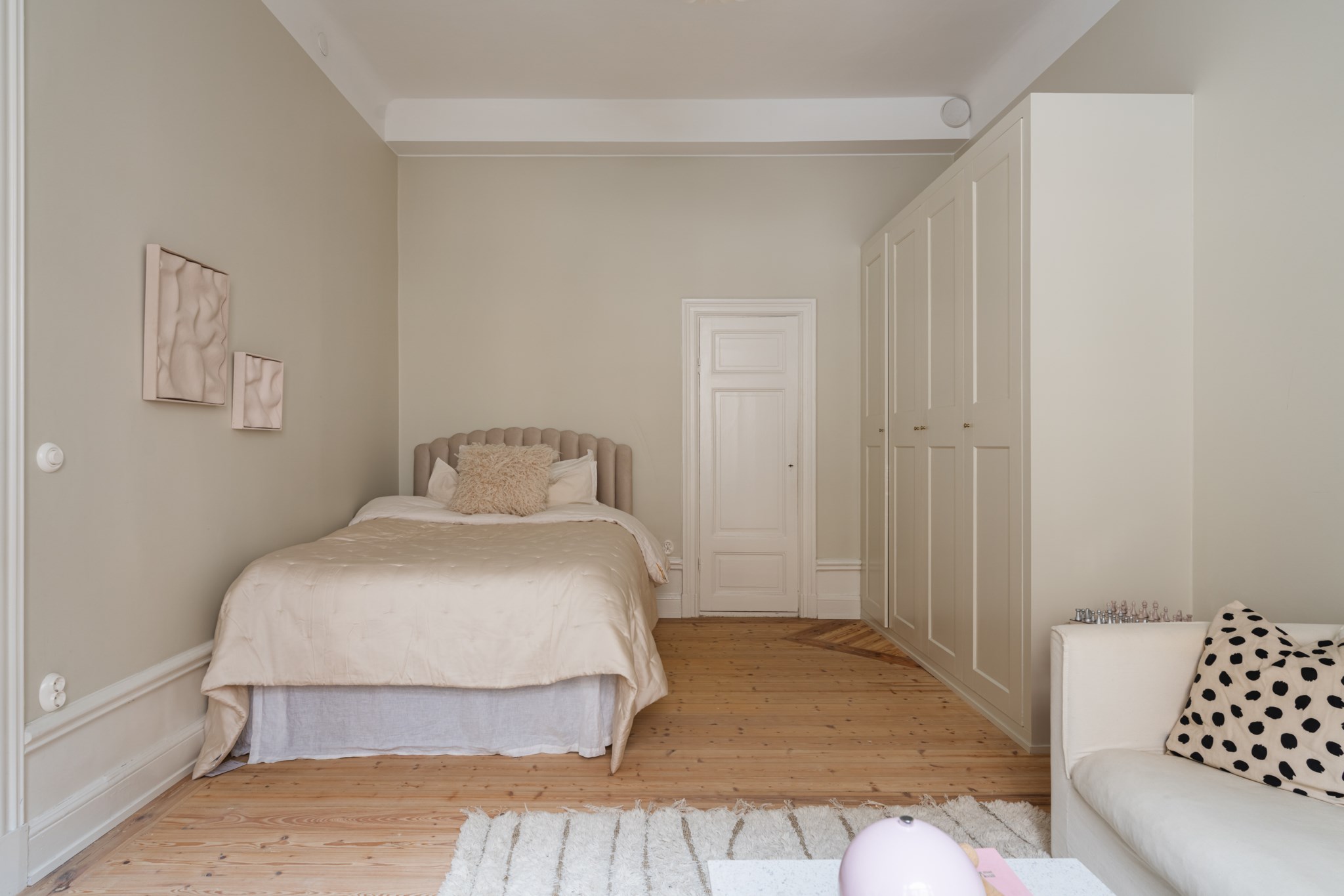 Luftigt allrum med tidlösa ytskikt bestående av ljusa väggar i en beige nyans och ljust trägolv. I allrummet inryms säng, soffa, soffbord, TV-möbel samt annat möblemang efter smak och behov. Gott om plats för förvaring via platsbyggda garderober. Här möts du av ett härligt ljusinsläpp via ett stort spröjsat fönster.