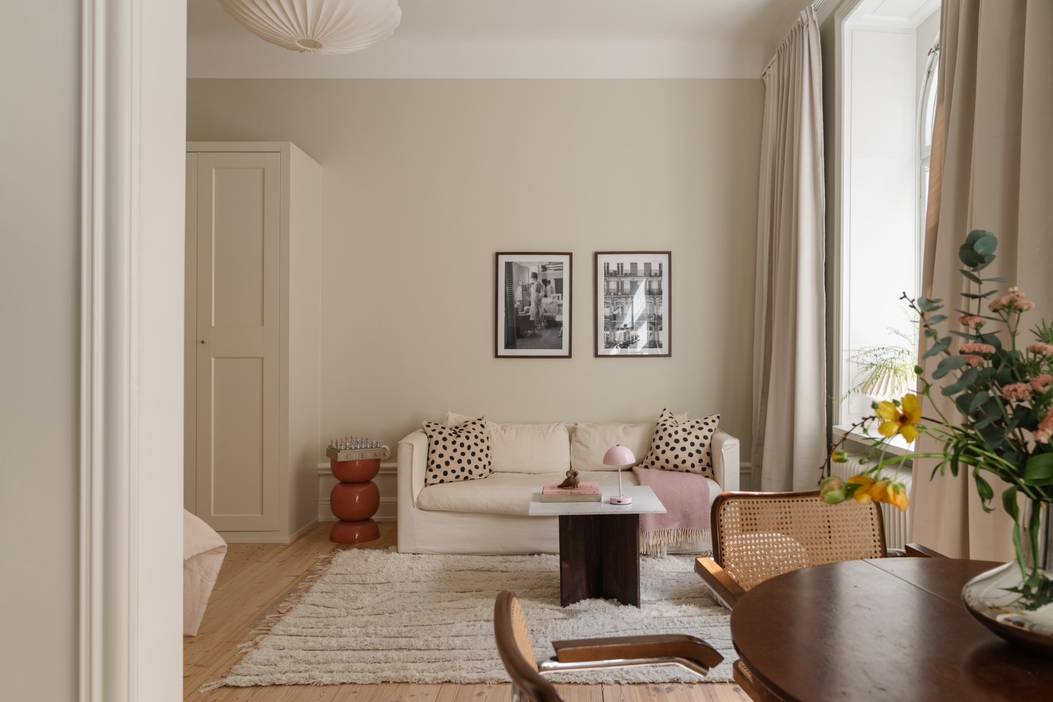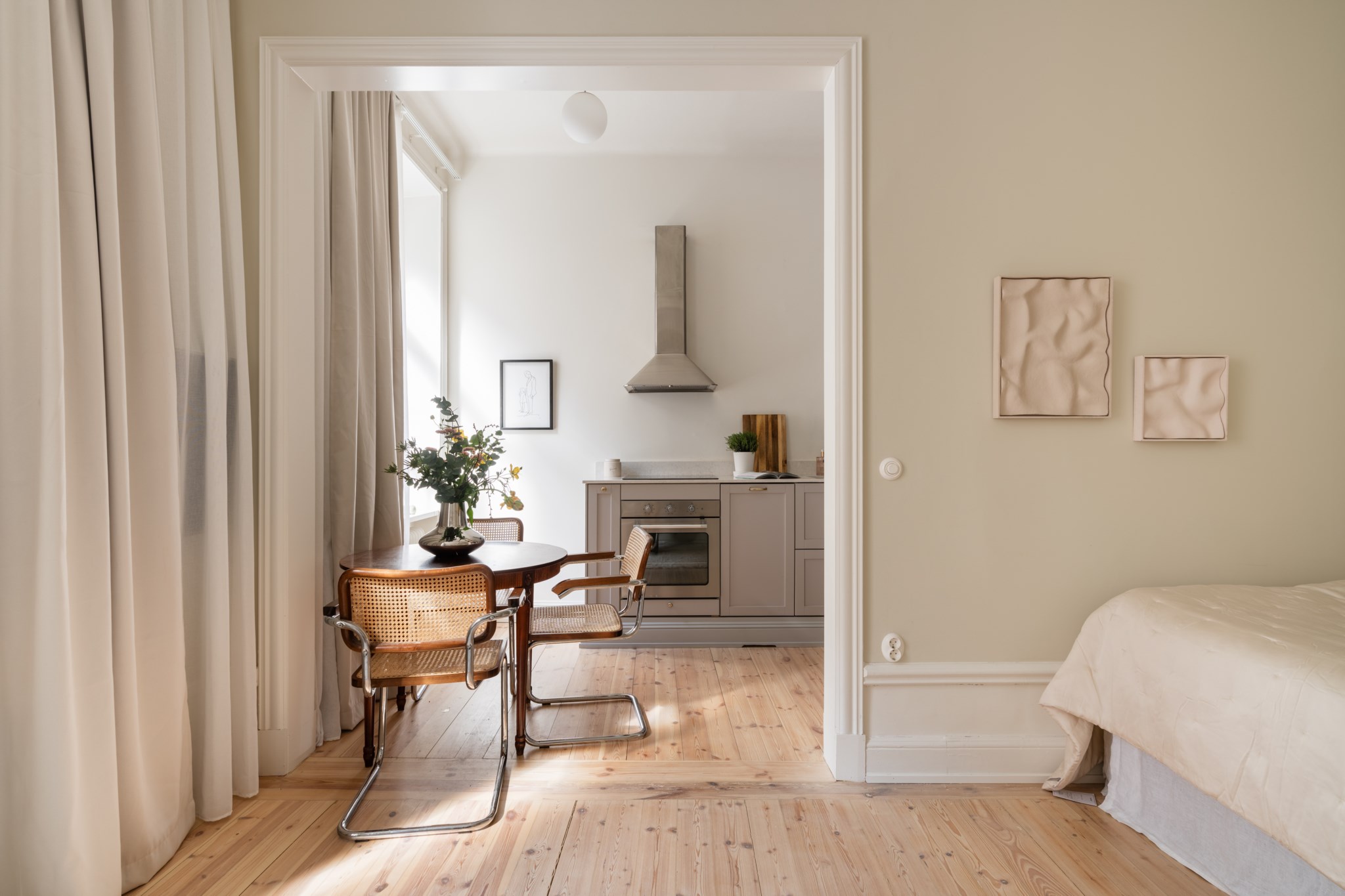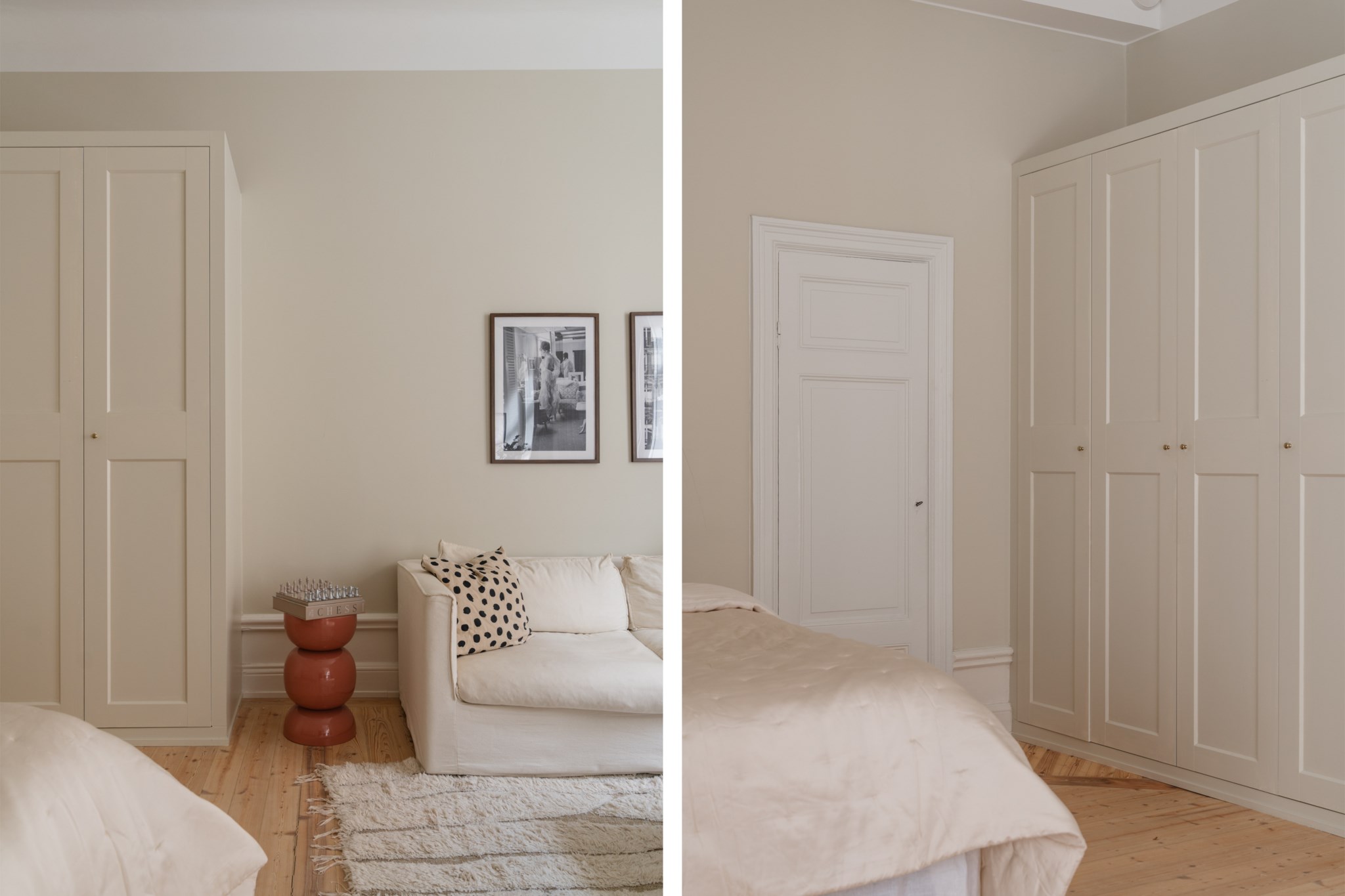 Luftigt allrum med tidlösa ytskikt bestående av ljusa väggar i en beige nyans och ljust trägolv. I allrummet inryms säng, soffa, soffbord, TV-möbel samt annat möblemang efter smak och behov. Gott om plats för förvaring via platsbyggda garderober. Här möts du av ett härligt ljusinsläpp via ett stort spröjsat fönster.