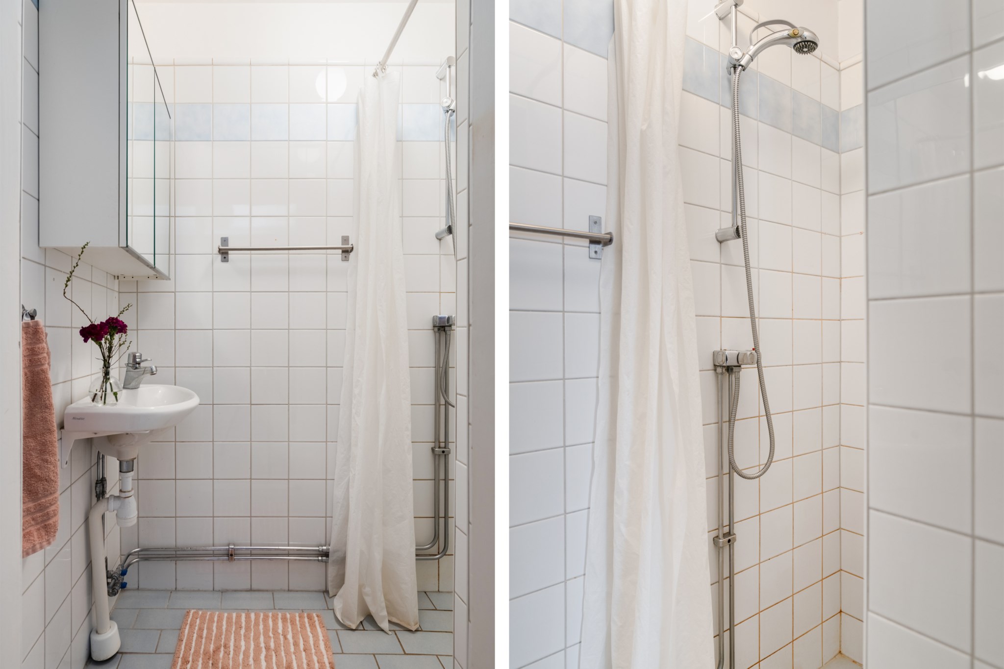 Rymligt duschrum med ljust kakel och klinker. Badrummet är utrustat med handdukstork, handfat, spegelskåp, samt dusch.