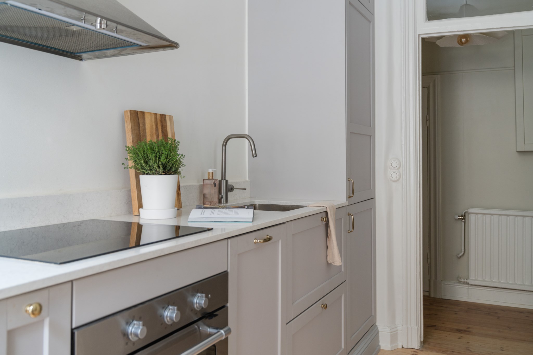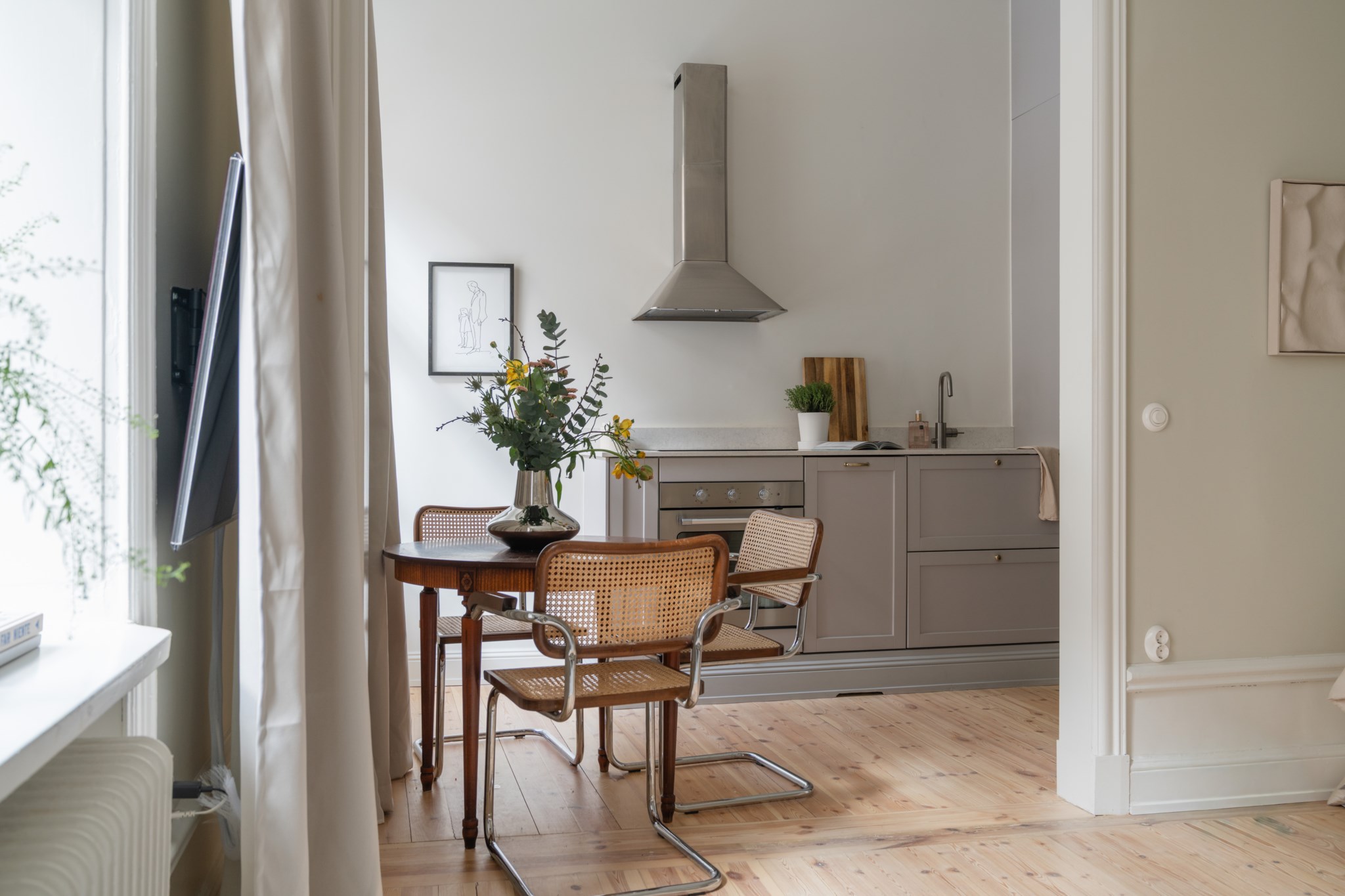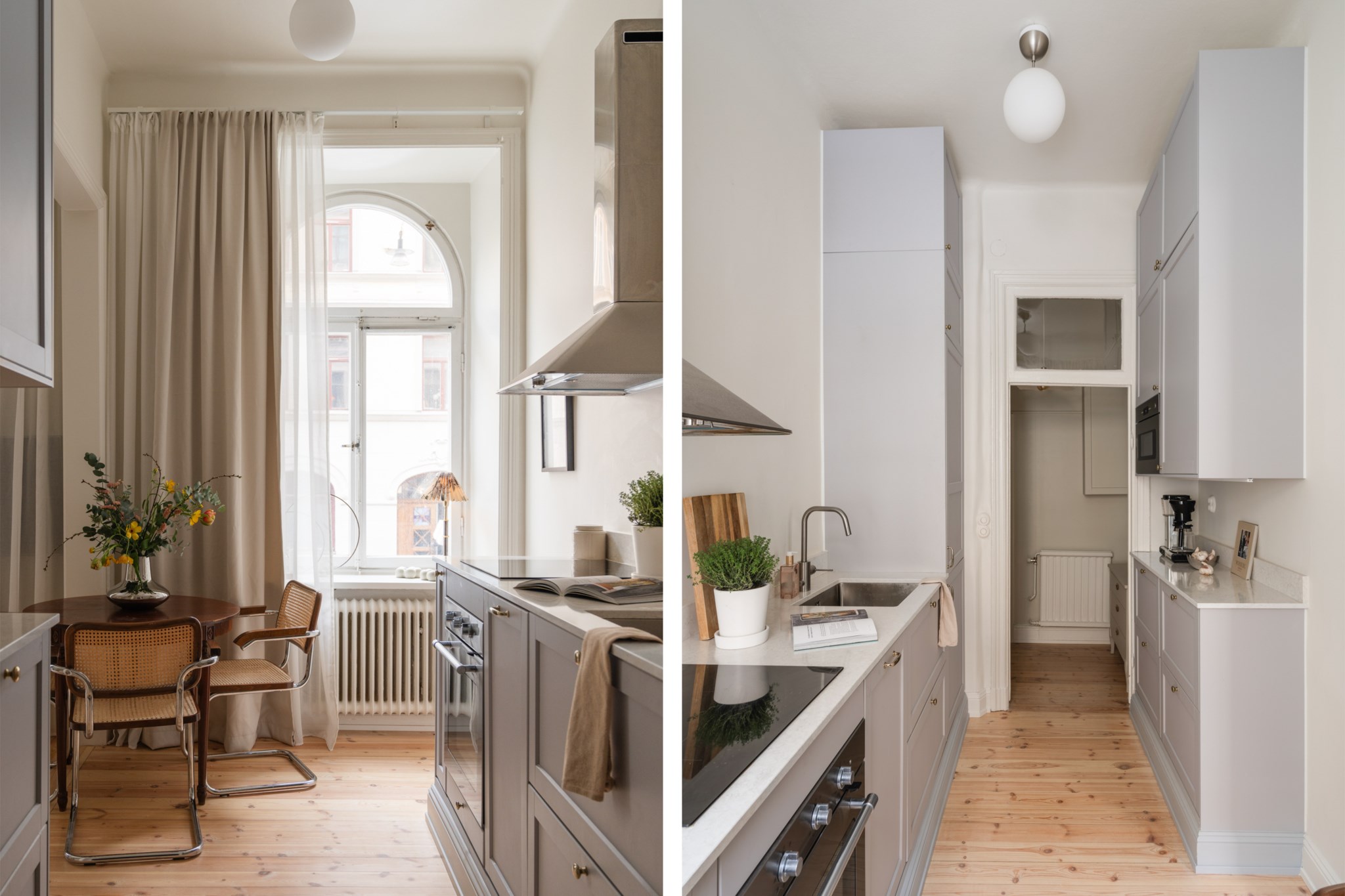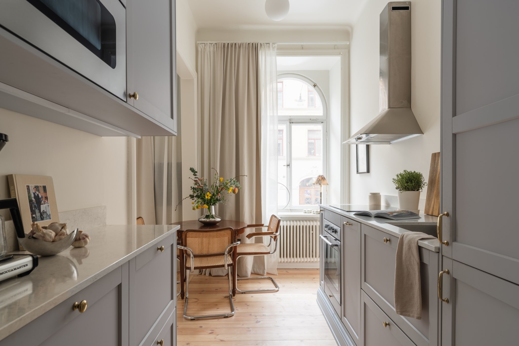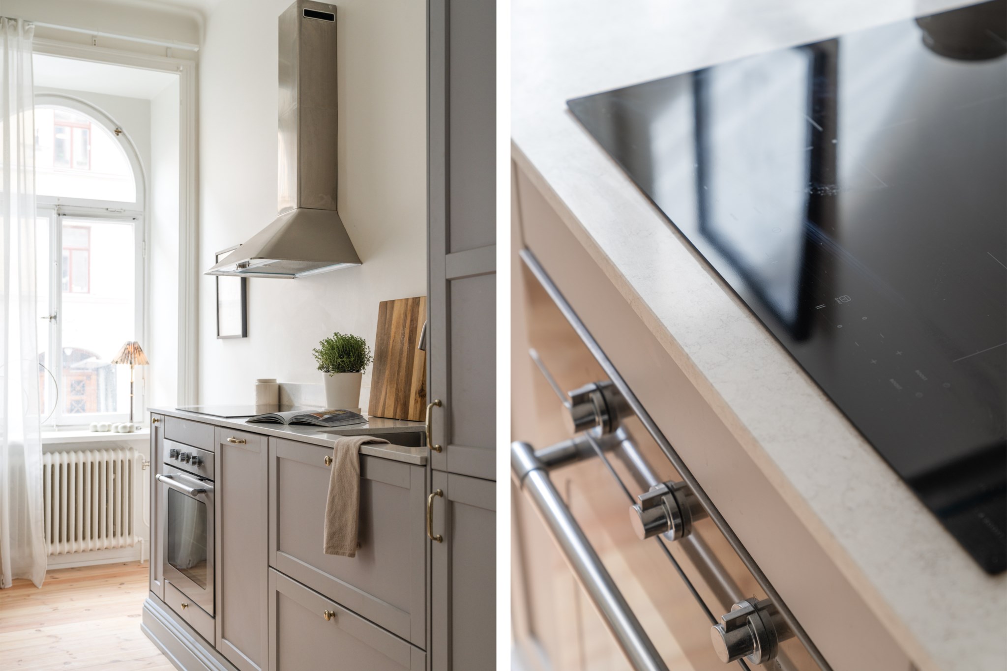 Modernt kök med smakfulla materialval bestående av gråa köksluckor och ljus bänkskiva med stänkskydd ovan. Den maskinella utrustningen består av diskho, spis, ugn, köksfläkt, micro, diskmaskin samt kyl och frys. Tidlösa ytskikt bestående av ljusa väggar och ljust trägolv. Här finns plats för en matgrupp och ett härligt ljusinsläpp tar sig in via ett stort spröjsat fönster