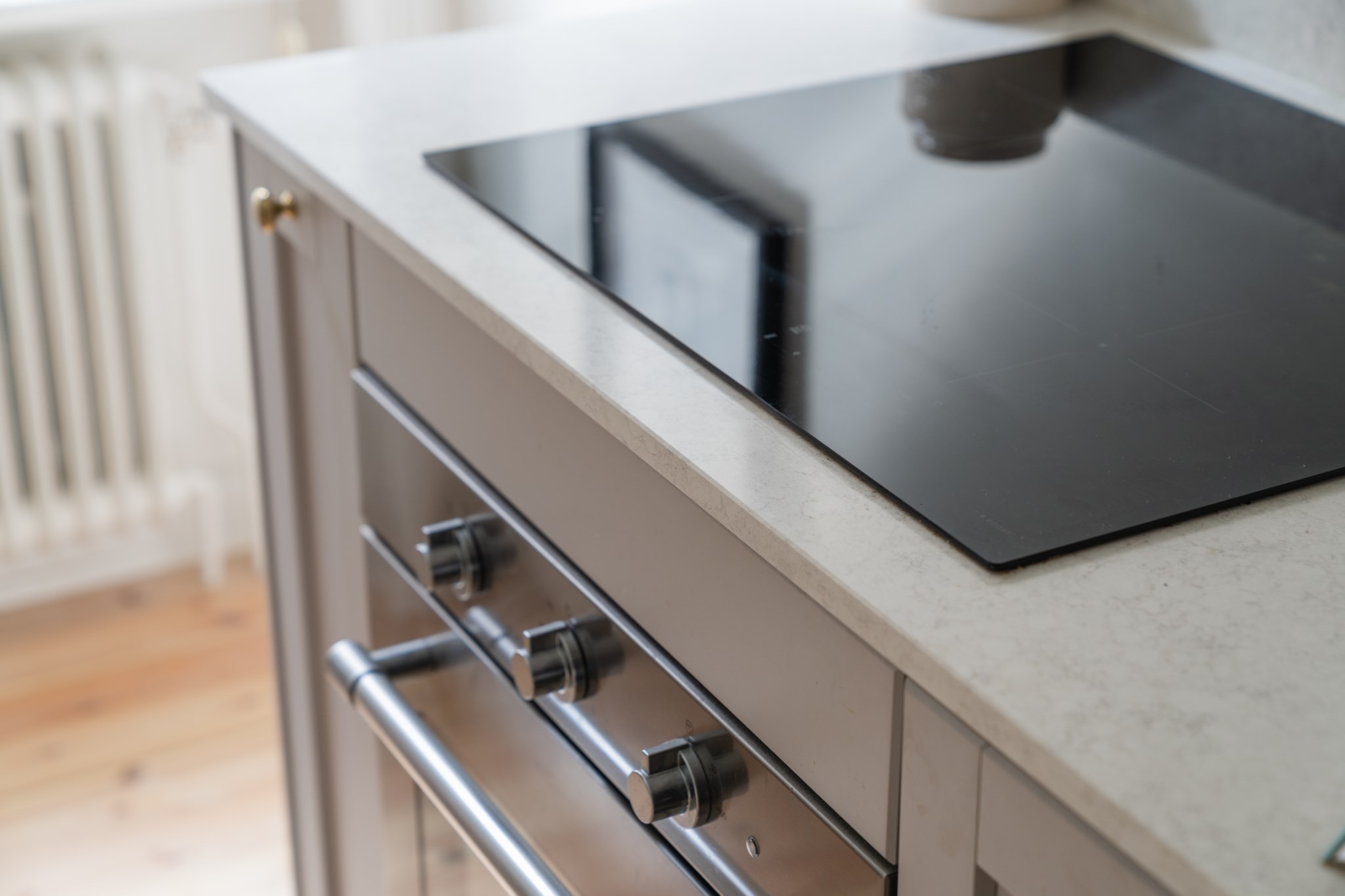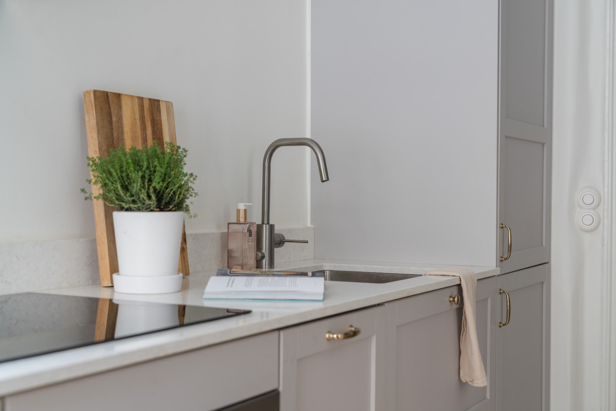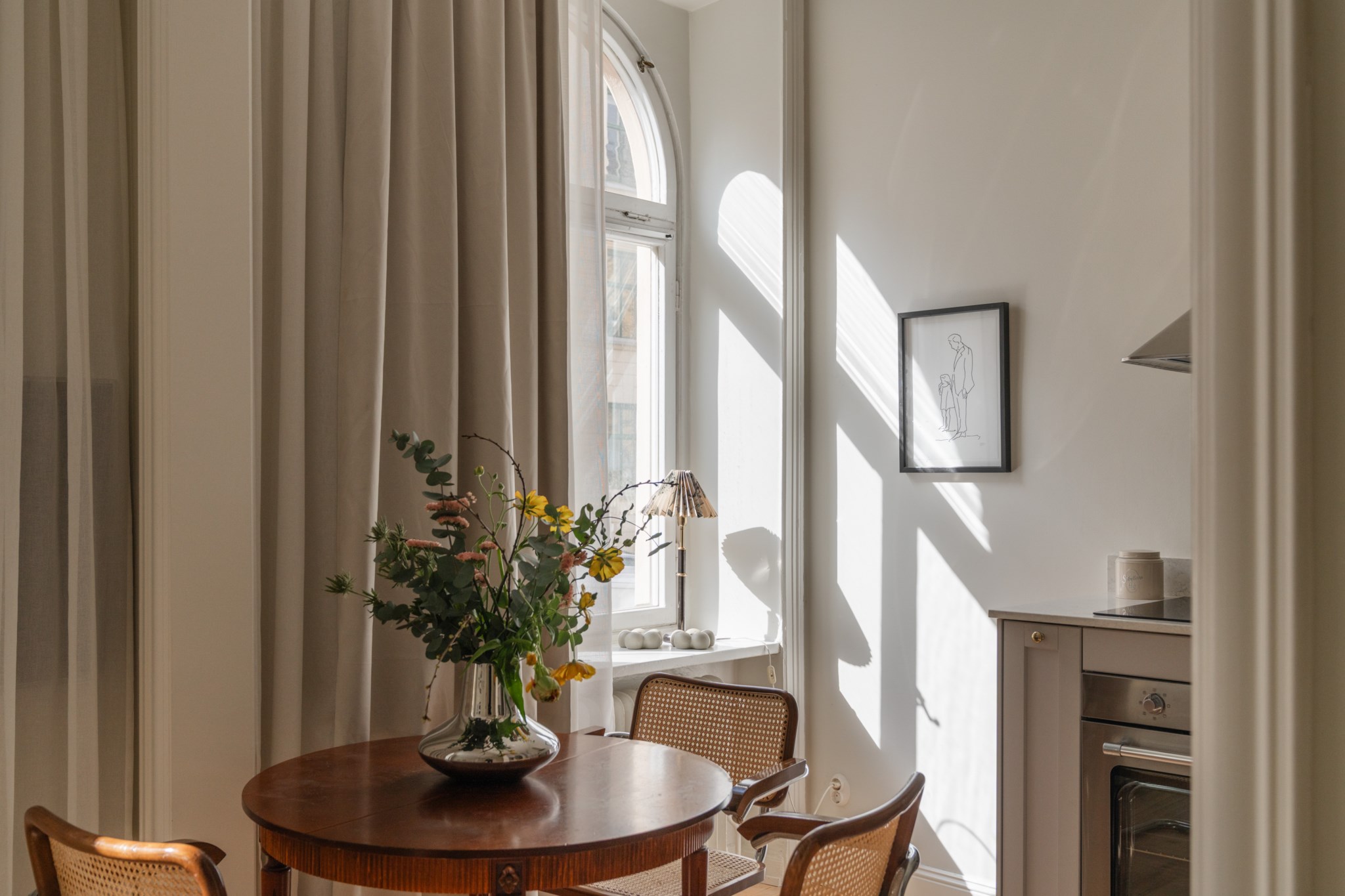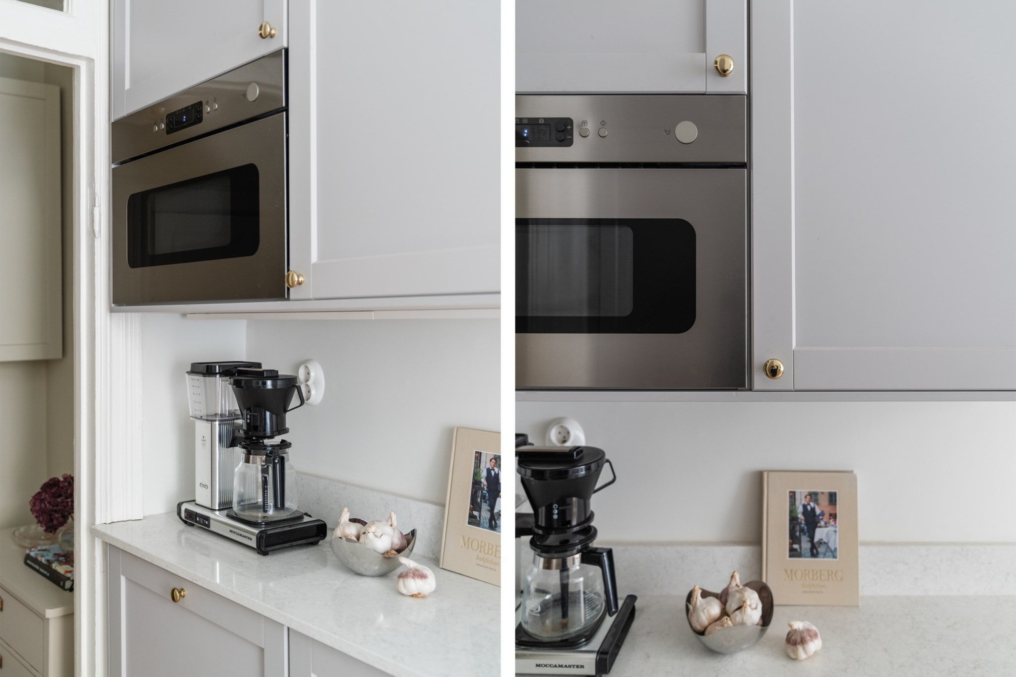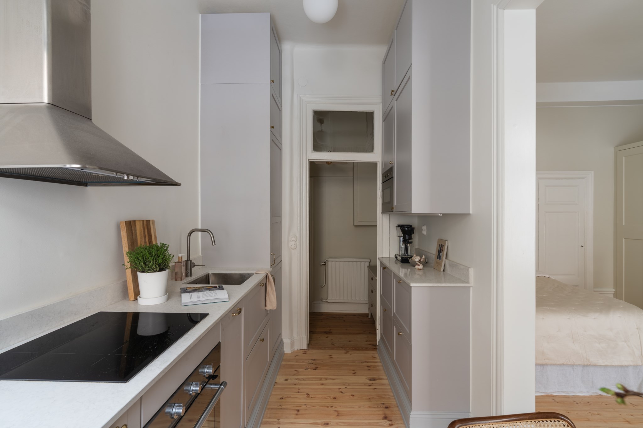 Modernt kök med smakfulla materialval bestående av gråa köksluckor och ljus bänkskiva med stänkskydd ovan. Den maskinella utrustningen består av diskho, spis, ugn, köksfläkt, micro, diskmaskin samt kyl och frys. Tidlösa ytskikt bestående av ljusa väggar och ljust trägolv. Här finns plats för en matgrupp och ett härligt ljusinsläpp tar sig in via ett stort spröjsat fönster