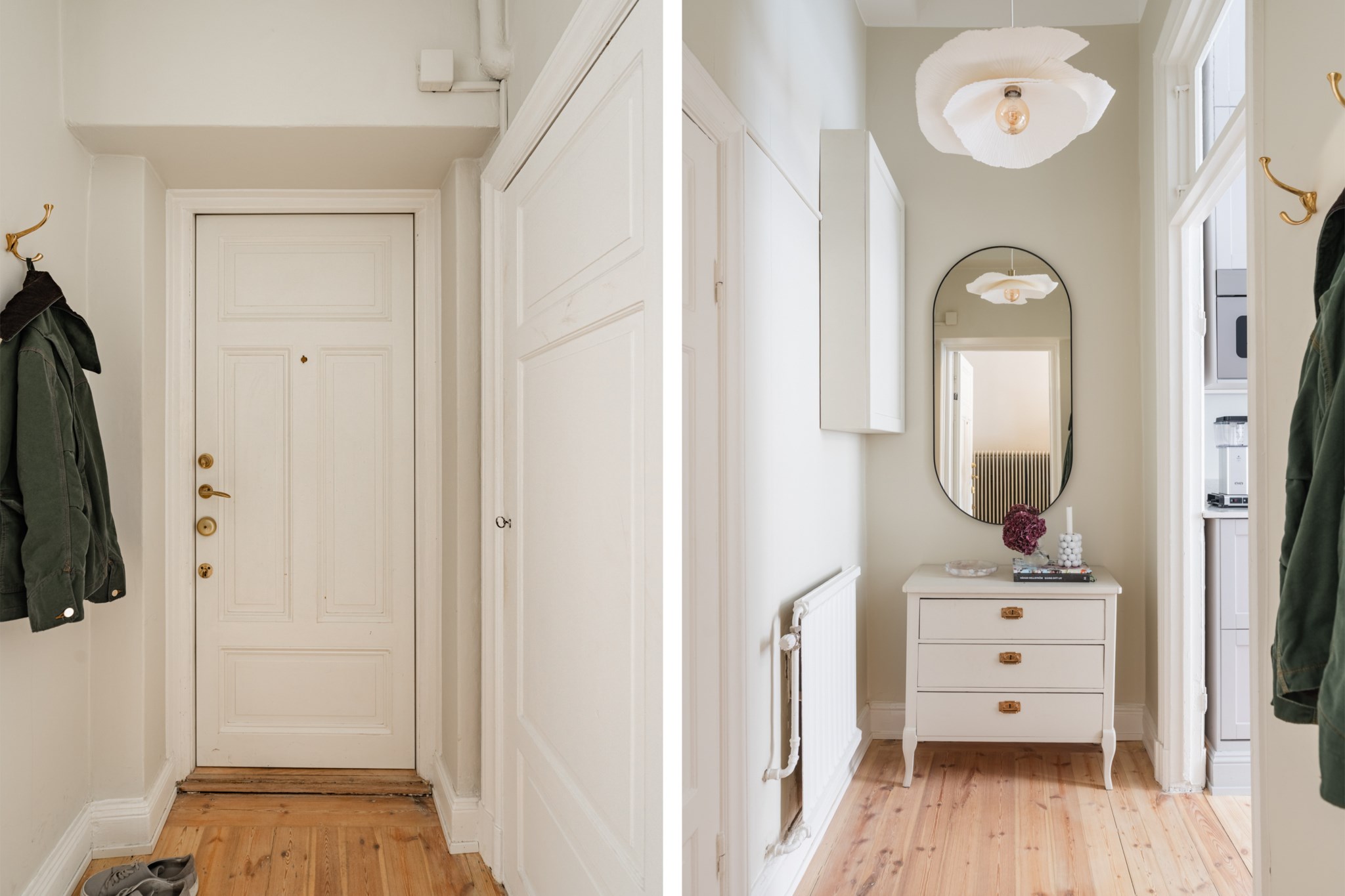 Välkomnande hall med plats för avhängning, skoställ samt mindre avlastningsmöblemang efter smak och behov. Tidlösa ytskikt bestående av ljusa väggar och ljust trägolv.