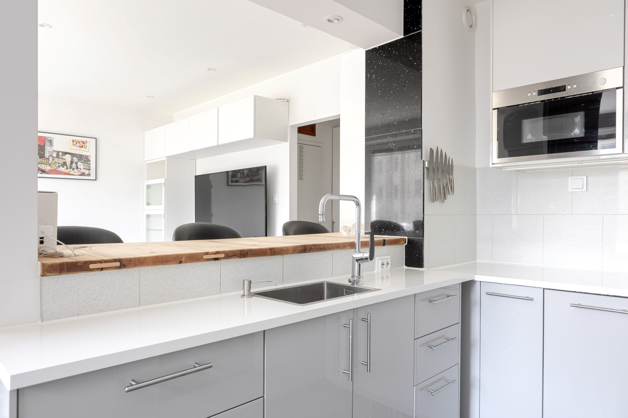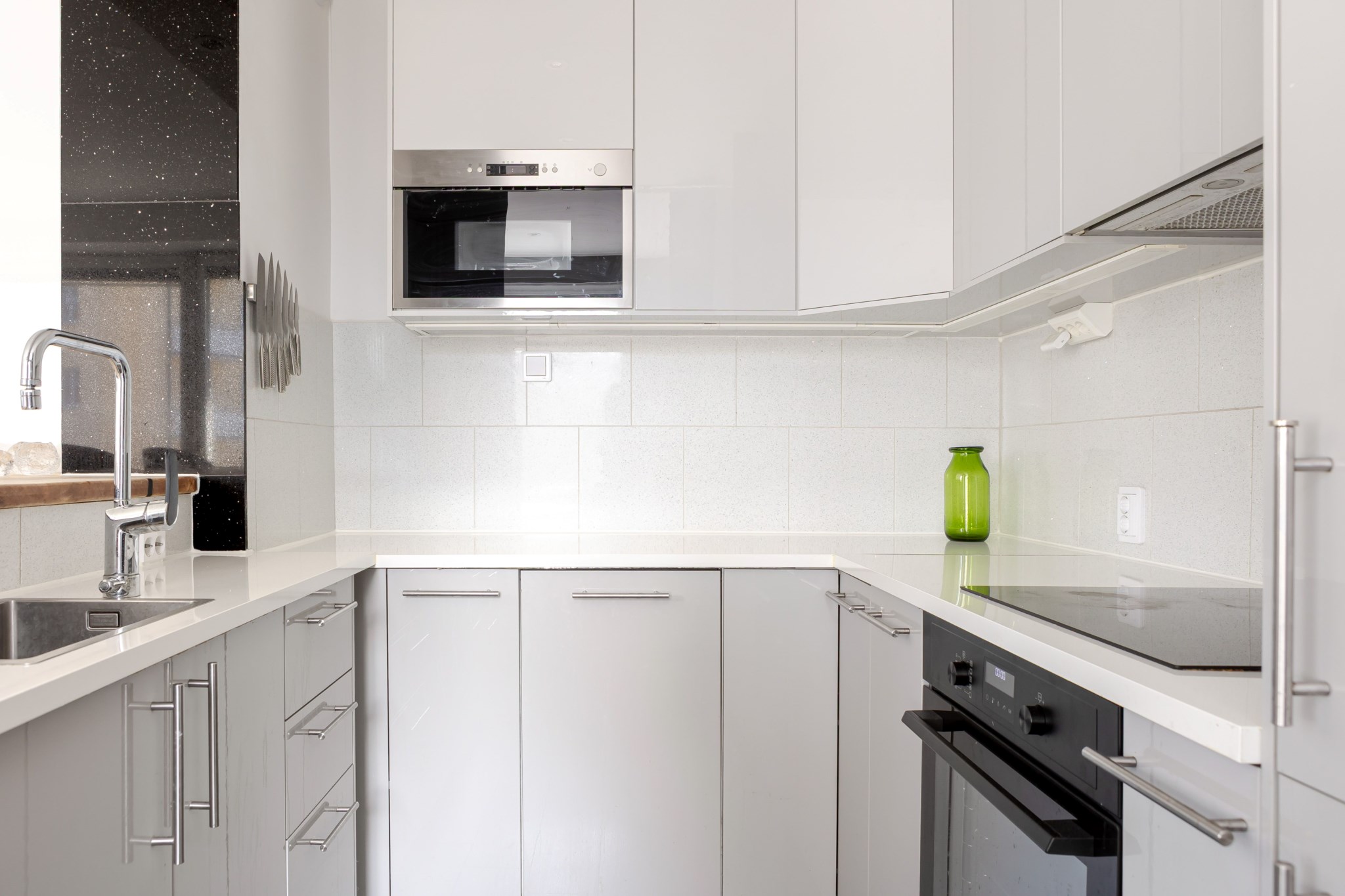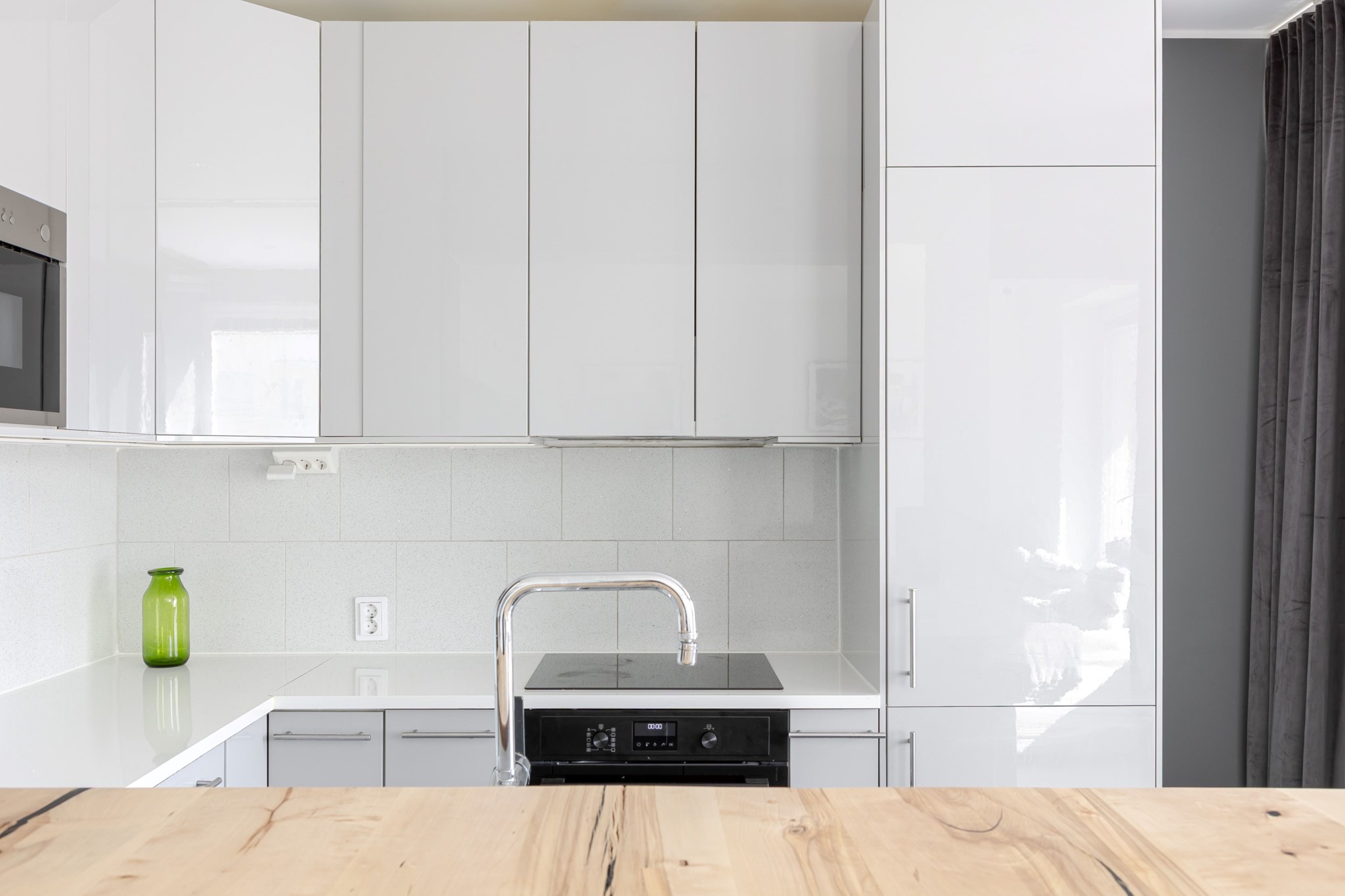 Stilrent kök med ljusmålade ytskikt och ljust golv. Halvöppen bardisk skapar en social och luftig yta med plats för sittplatser. Köket har släta, ljusa skåpsfronter som kombineras med en matchande ljus bänkskiva och vit kaklad väggpanel. Maskinell utrustning i form av kyl/frys, spishäll, fläkt, ugn och diskmaskin.