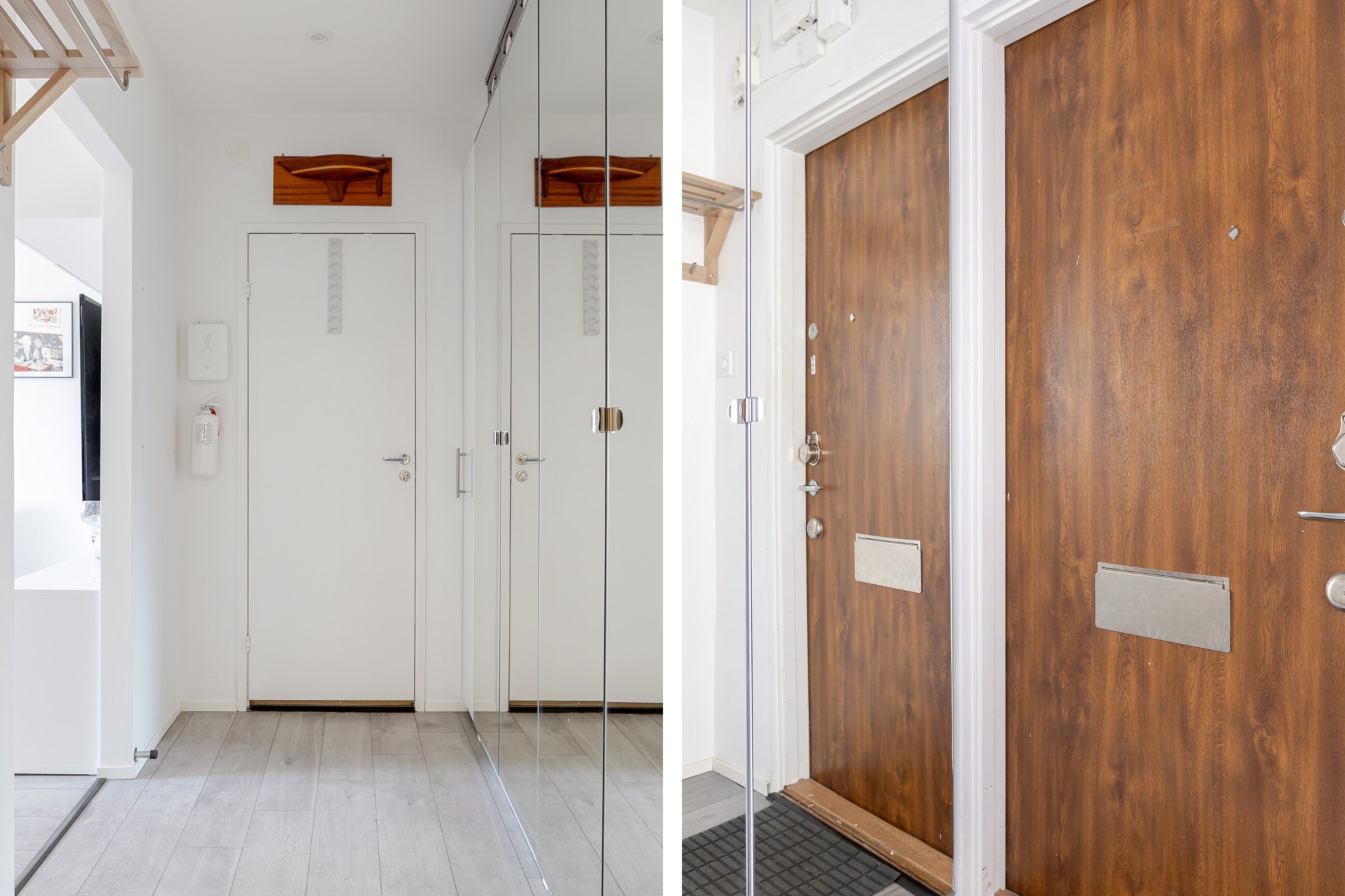 Hall med ljusmålade ytskikt och ljust golv. Här finns plats för hatthylla som möjliggör enkel avhängning av ytterkläder och skor. Bra förvaring i garderober med spegeldörrar.