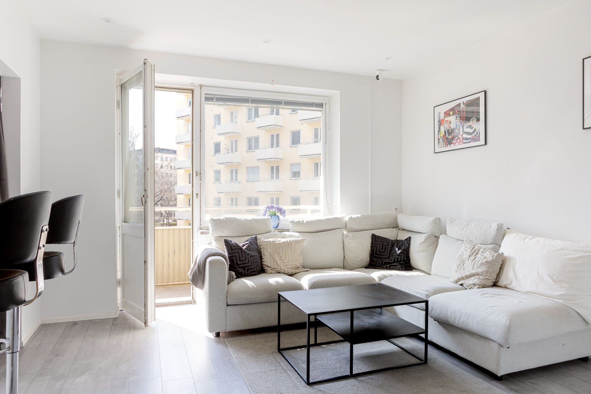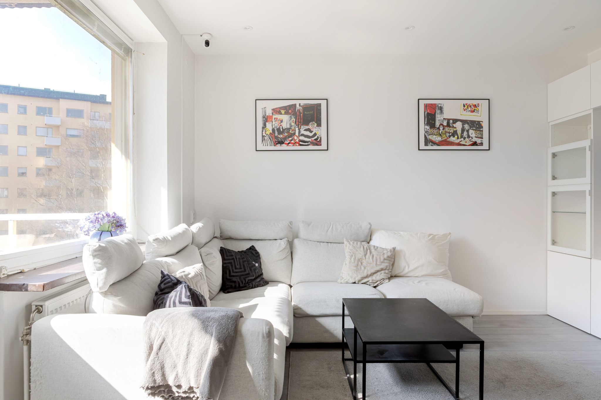 Trivsamt allrum med ljusmålade ytskikt och ljust golv. Stort fönsterparti ger ett fint ljusinsläpp och tillsammans med balkongöppningen binds ute och inne samman under de varmare månaderna. Här finns plats för soffa och övrigt möblemang efter behov och smak.