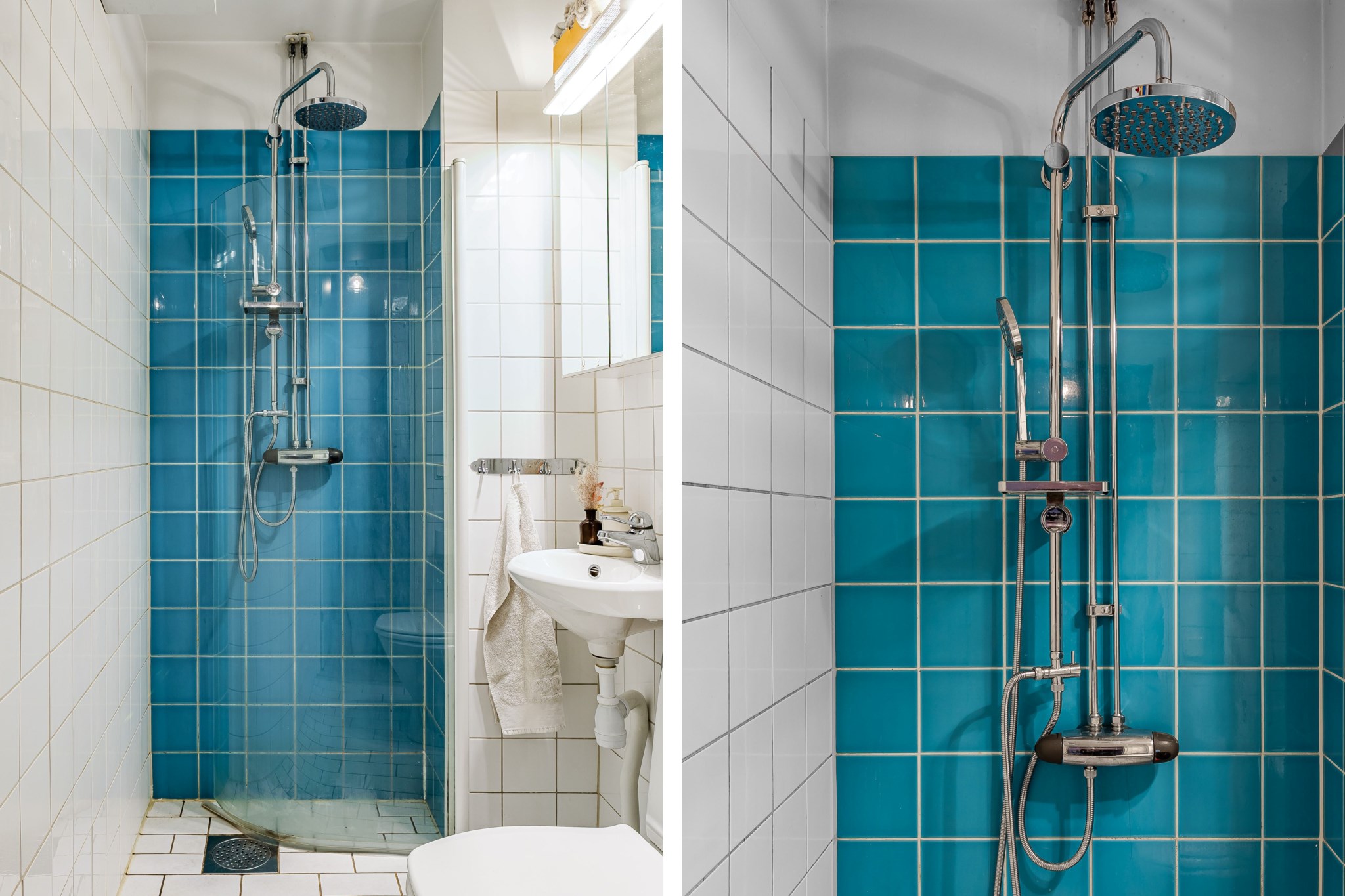 Badrum med kaklade väggar och golv inrett med WC, handfat, spegelskåp och dusch med infällbar duschvägg i klarglas.