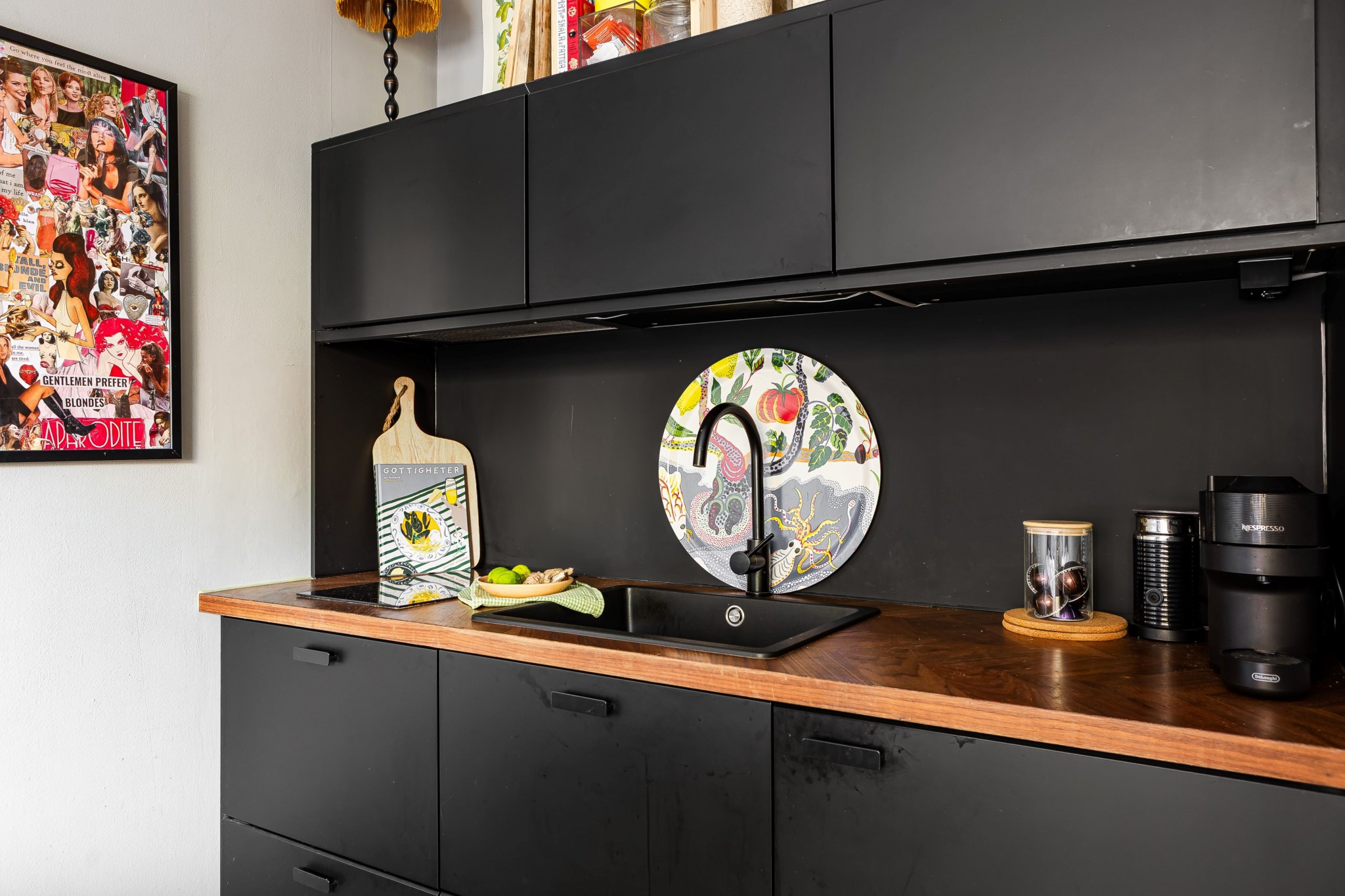 Kök med mörka, släta köksluckor och matchande väggpanel. Bänkskiva i trä som skapar en varm kontrast mot det mörka. Kökets maskinella utrustning består av kyl och spishäll.