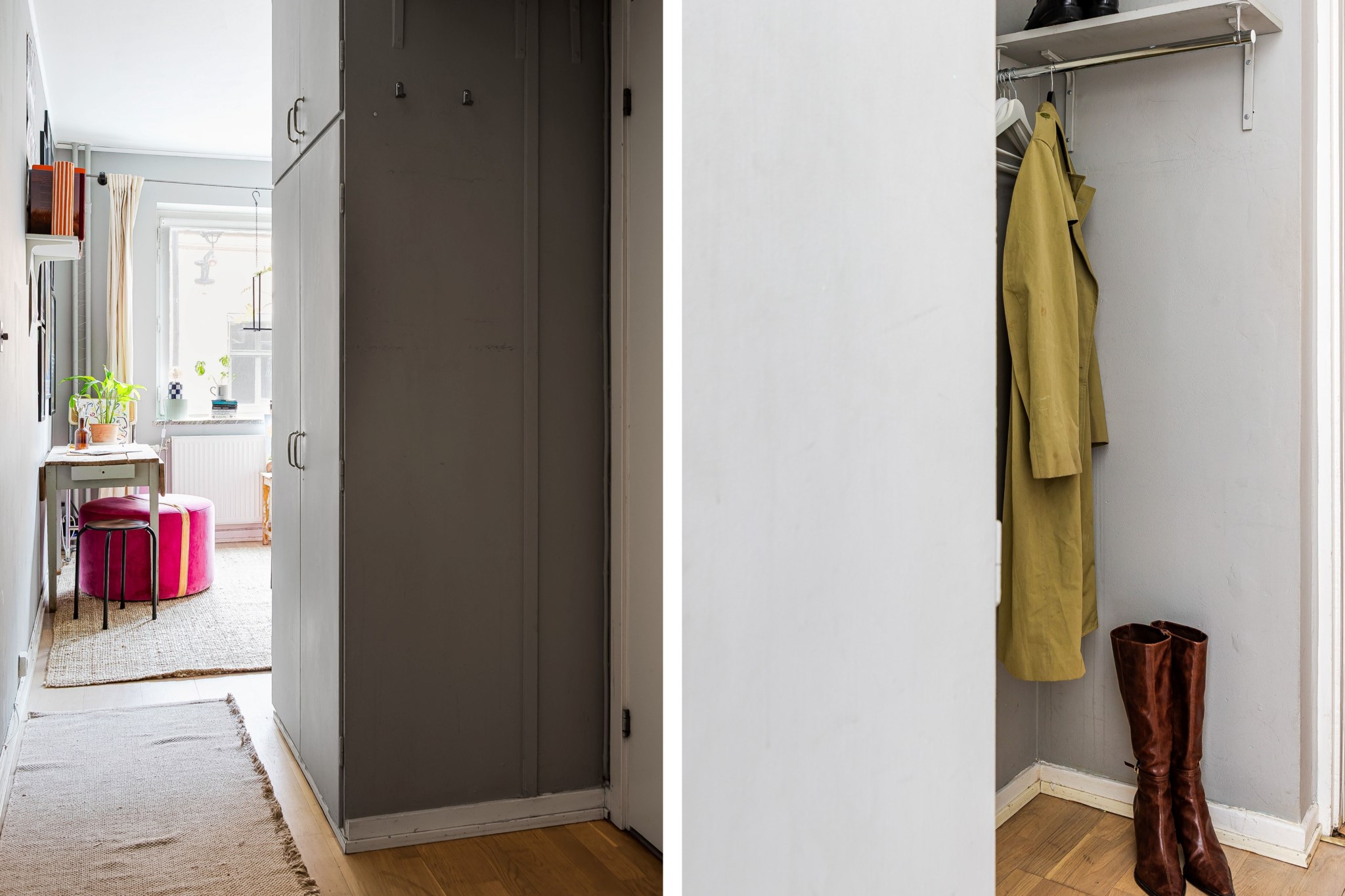 Välkomnande hall med målade ytskikt och ljust golv. Praktisk hatthylla för avhängning direkt intill entrén samt god förvaring i stor garderob med överskåp.