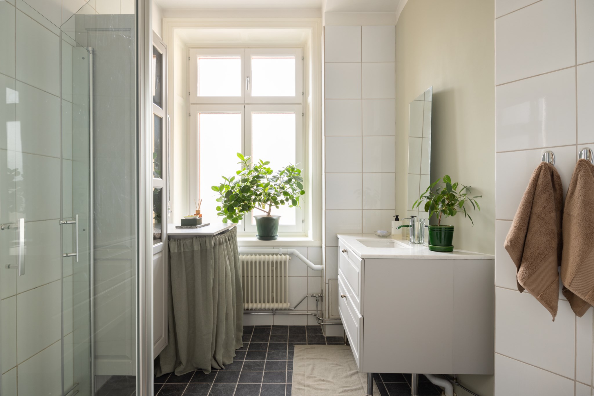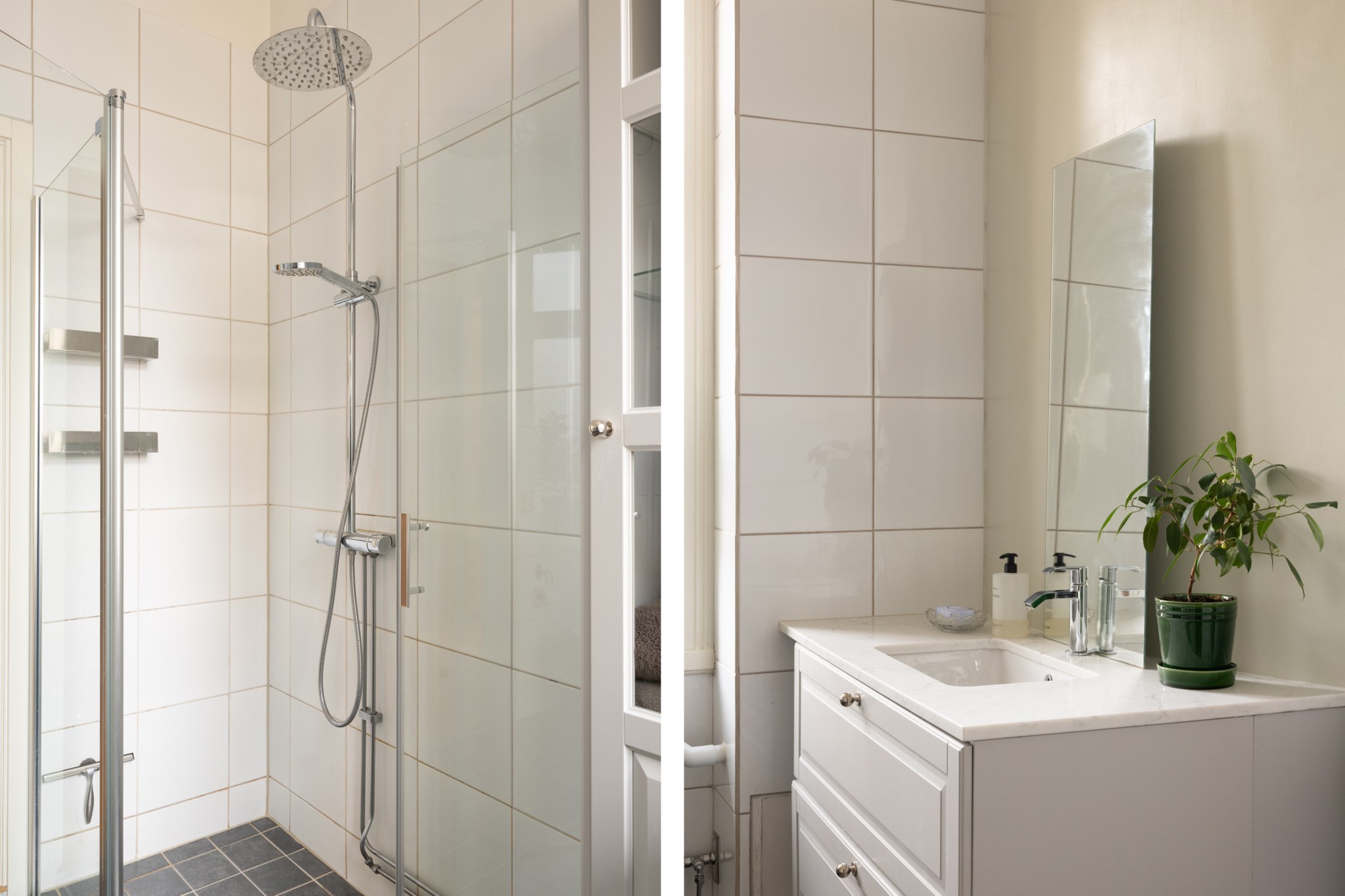 Rymligt badrum med ljust kakel och mörkt klinker. Badrummet är utrustat med WC, handfat ovan kommod, samt dusch med glasväggar. Extra bekvämligheter genom en tvättmaskin och ett vägghängt skåp.