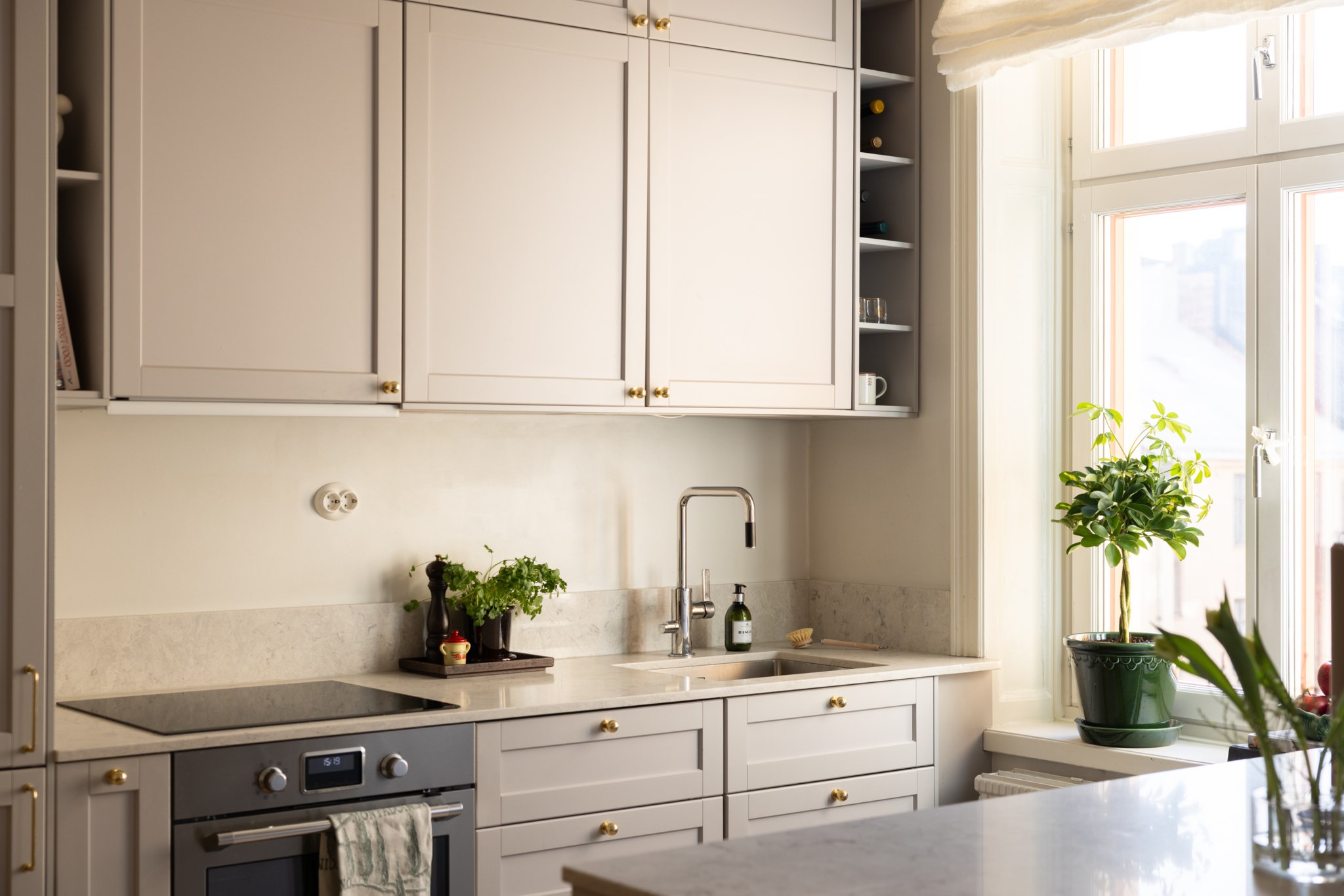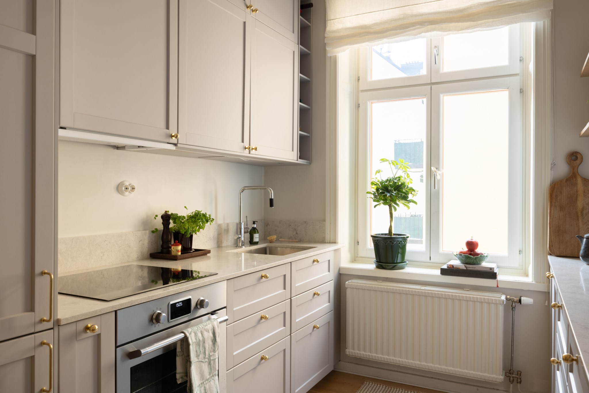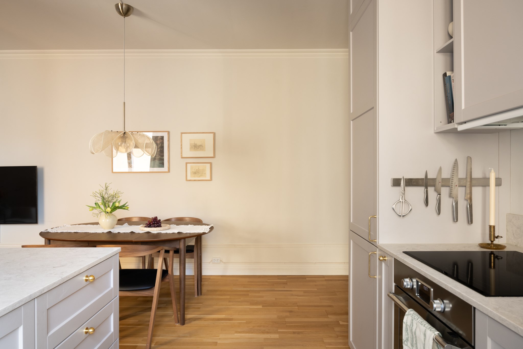 Modernt kök med smakfulla materialval bestående av köksluckor i en grå nyans och ljus bänkskiva med stänkskydd ovan. Den maskinella utrustningen består av diskho, spis, ugn, köksfläkt, diskmaskin samt kyl och frys. Tidlösa ytskikt bestående av ljusa väggar, bröstpanel och ljust golv. Taket pryds av vackra stuckaturer.
