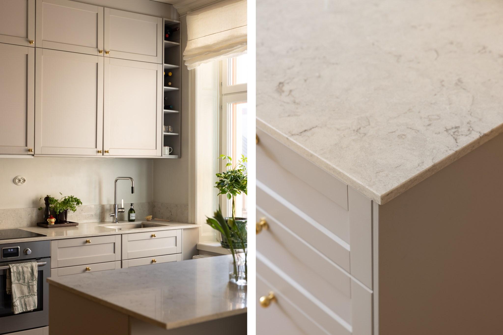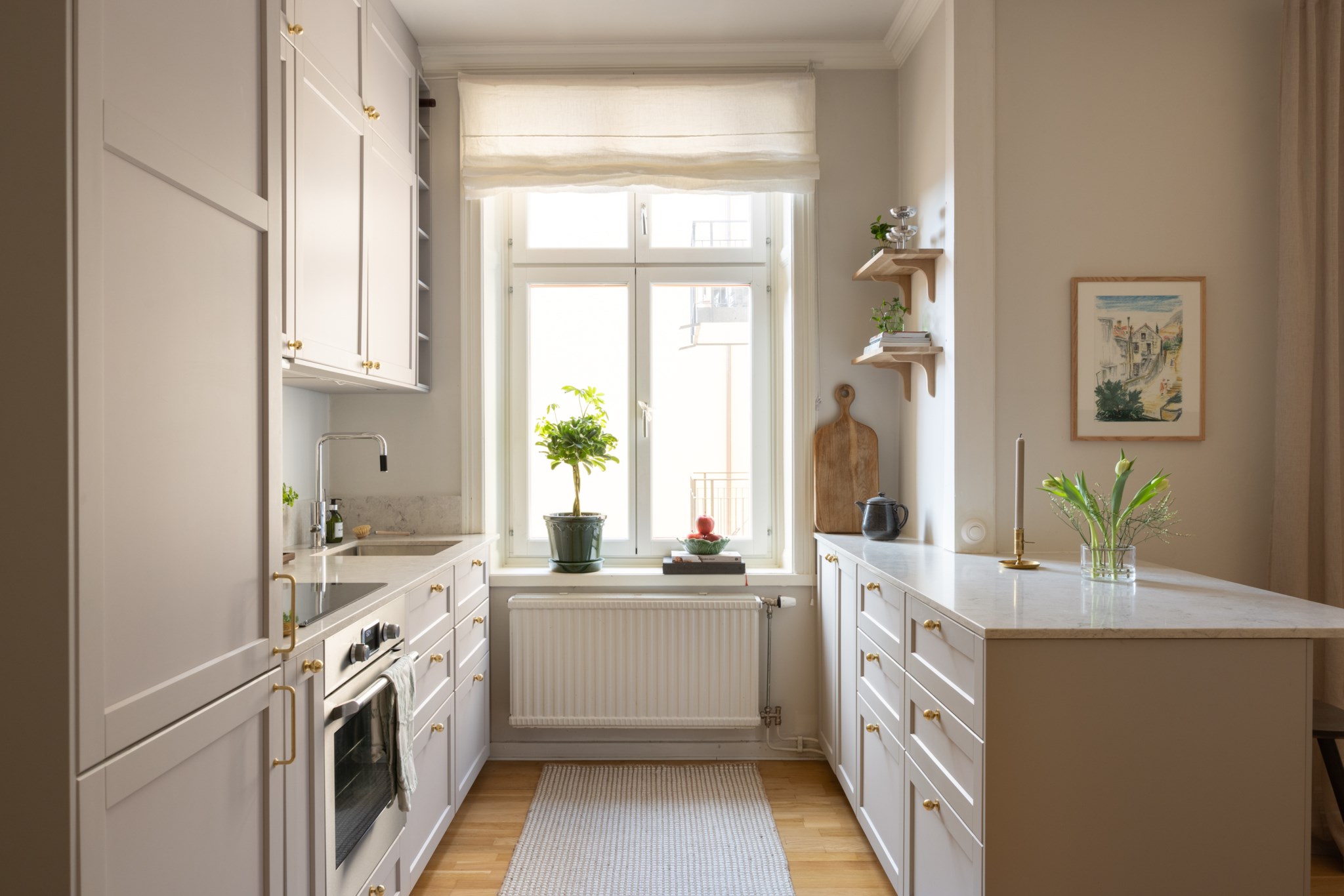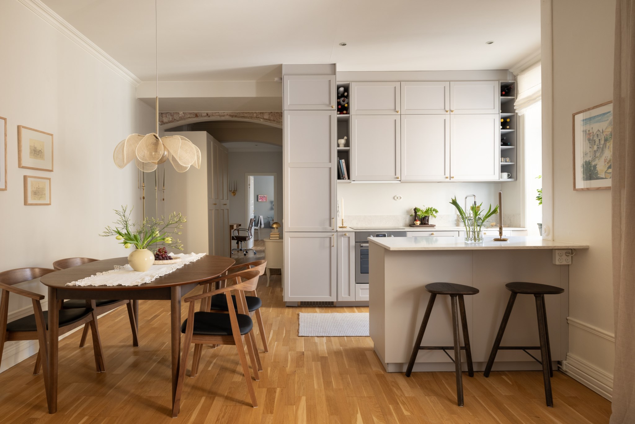 Modernt kök med smakfulla materialval bestående av köksluckor i en grå nyans och ljus bänkskiva med stänkskydd ovan. Den maskinella utrustningen består av diskho, spis, ugn, köksfläkt, diskmaskin samt kyl och frys. Tidlösa ytskikt bestående av ljusa väggar, bröstpanel och ljust golv. Taket pryds av vackra stuckaturer.