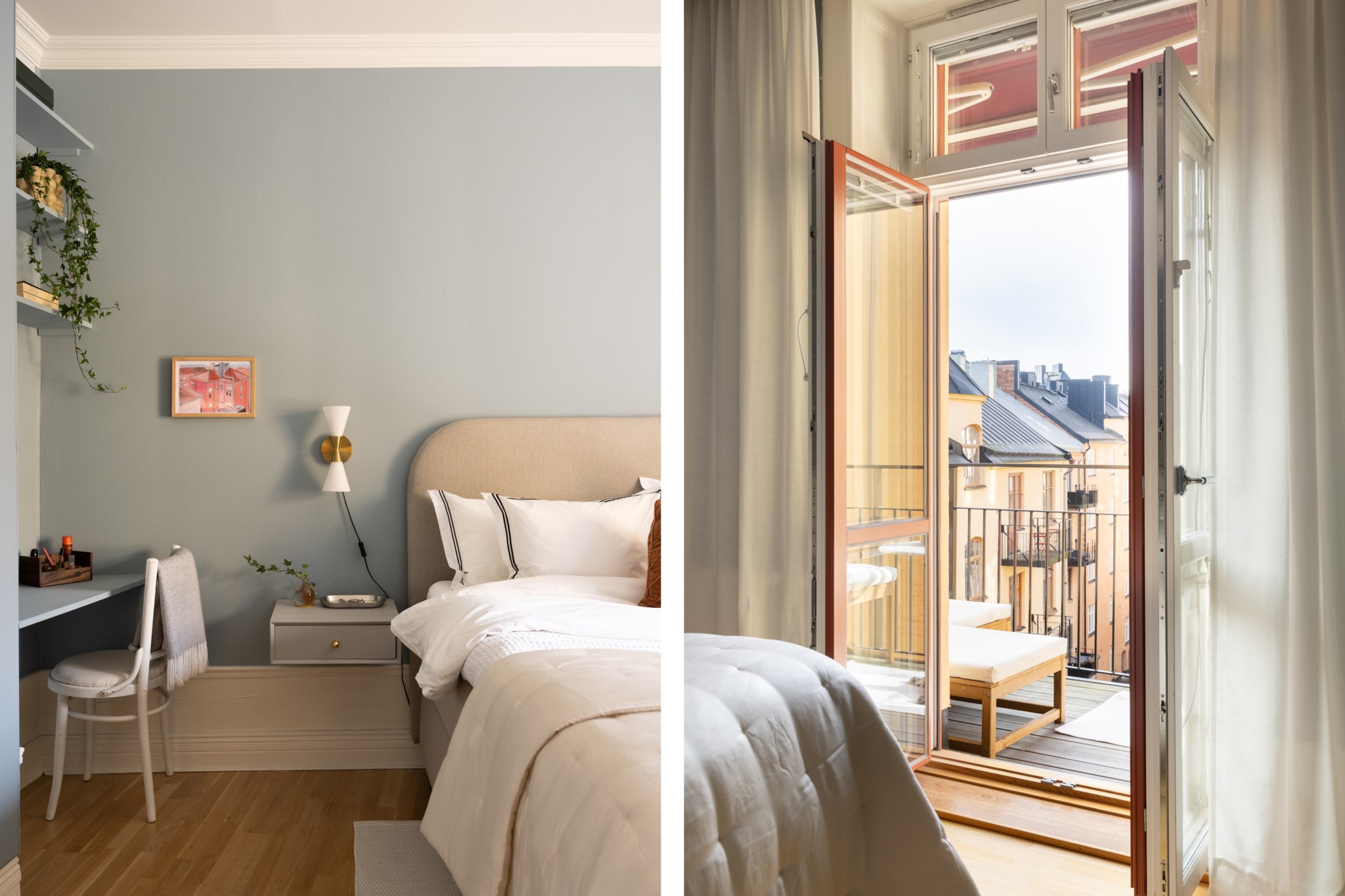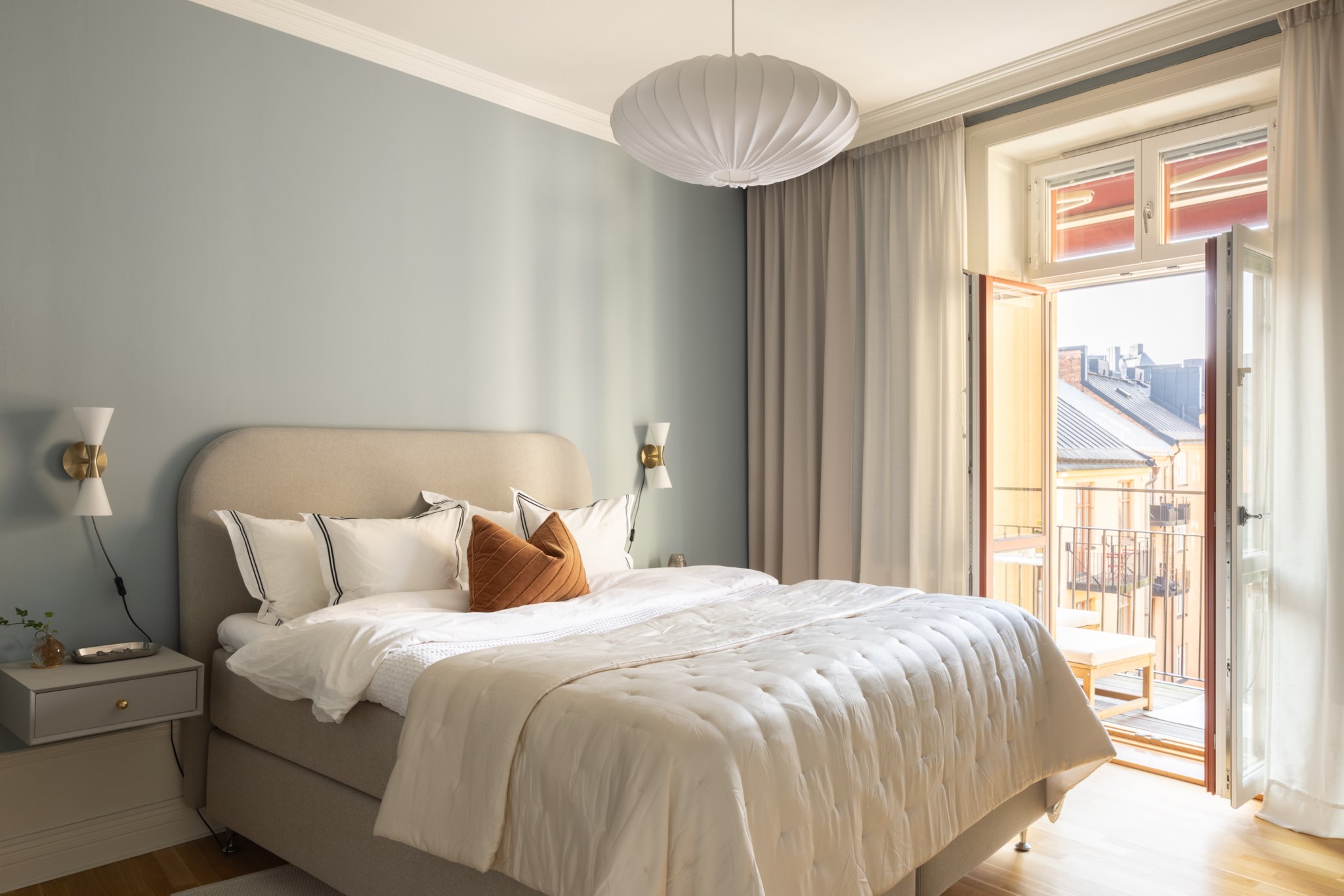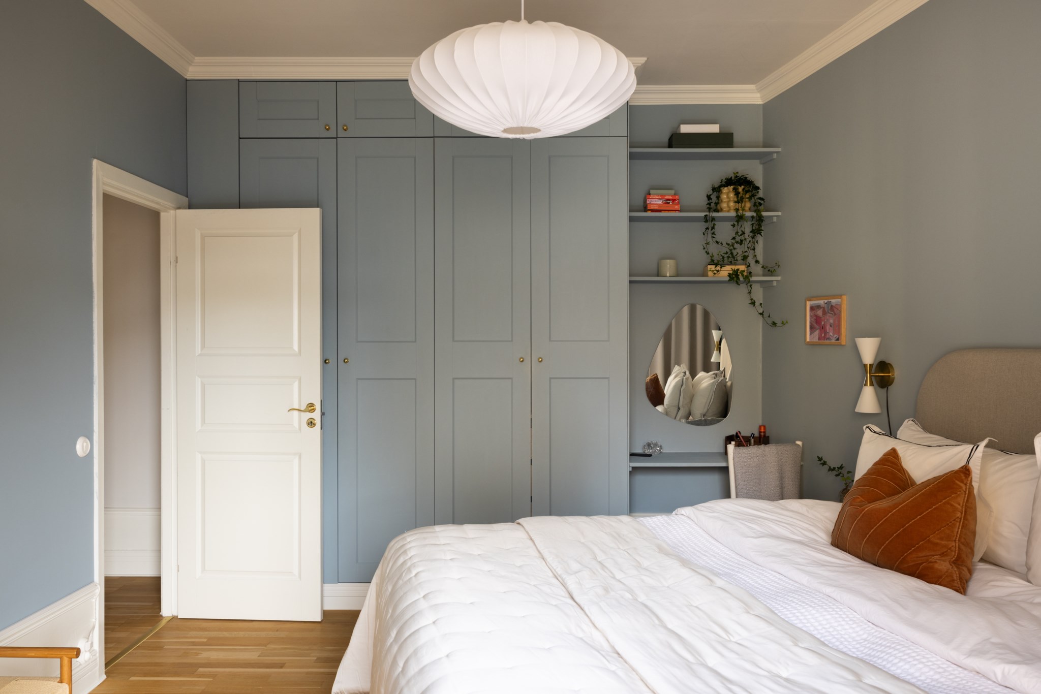 Stort sovrum med plats för dubbelsäng och annat möblemang efter smak och behov. Gott om plats för förvaring via platsbyggda garderober. Ett härligt ljusinsläpp tar sig in via fönster och från sovrummet nås även lägenhetens härliga balkong. Tidlösa ytskikt bestående av ljusa väggar i en blå nyans, bröstpanel och ljust golv. Taket pryds av vackra stuckaturer.