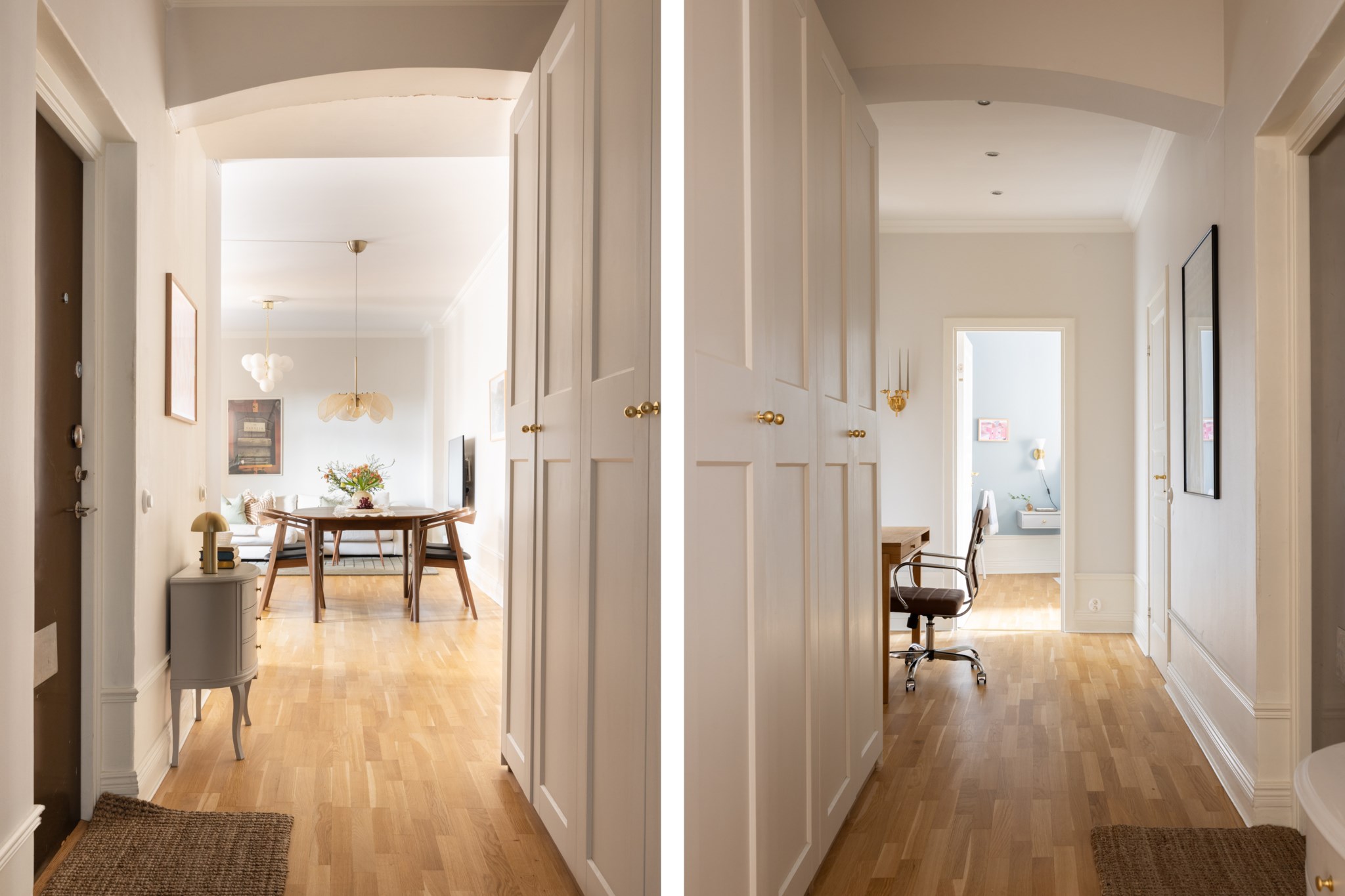Planlösningen är både praktisk och genomtänkt med gott om förvaringsmöjligheter genom garderober och smarta lösningar som gör att bostadens 66 kvadratmeter nyttjas på bästa sätt.