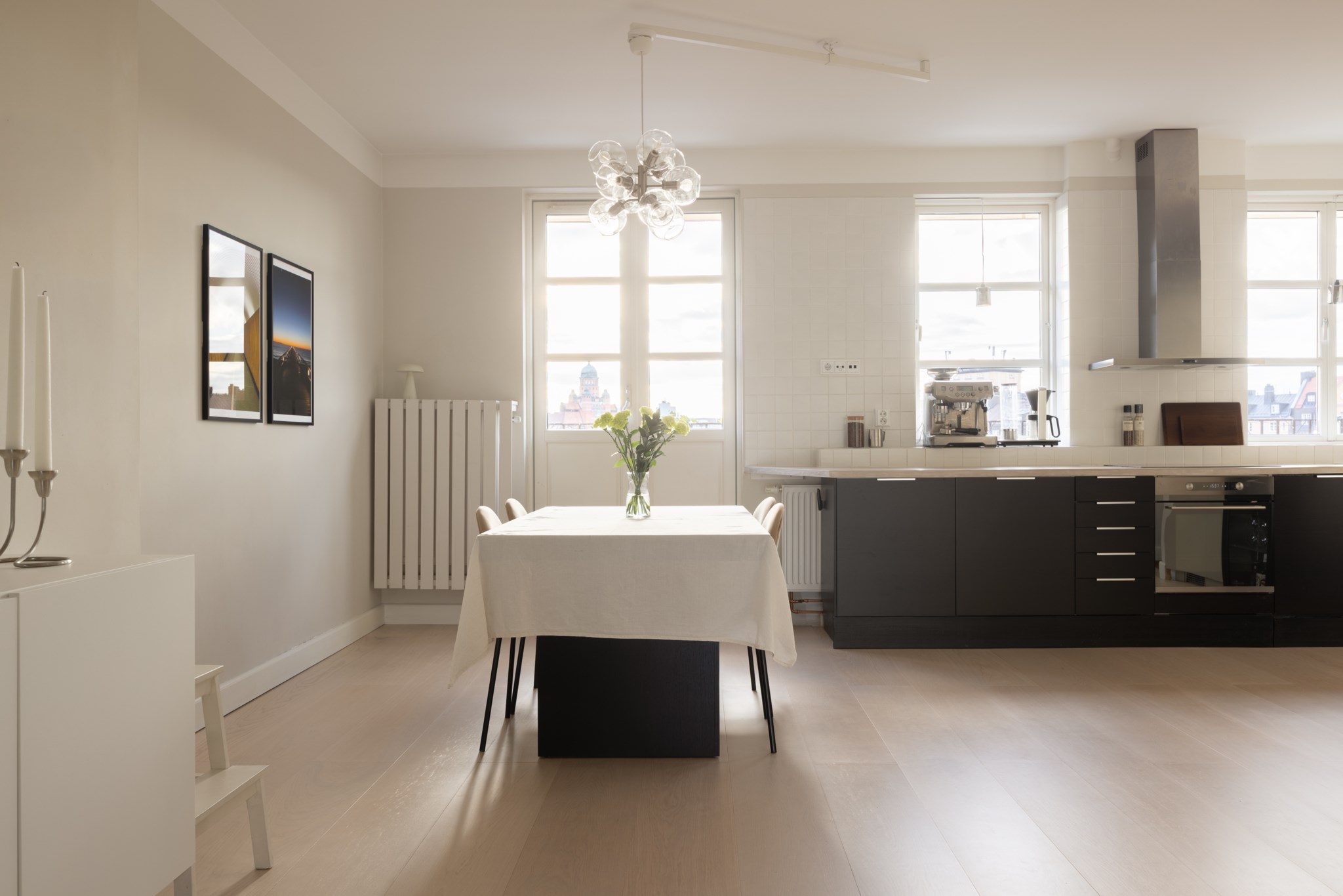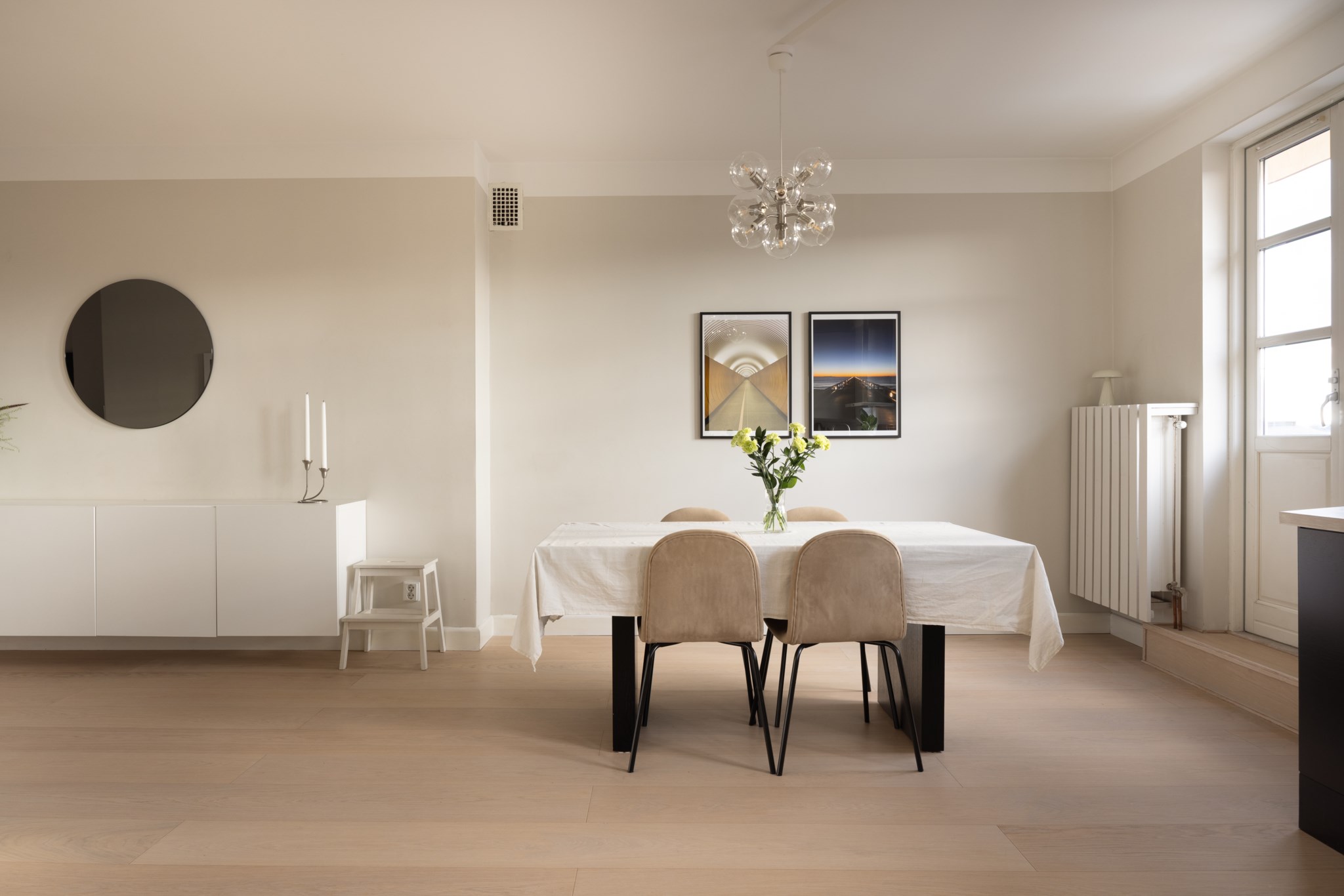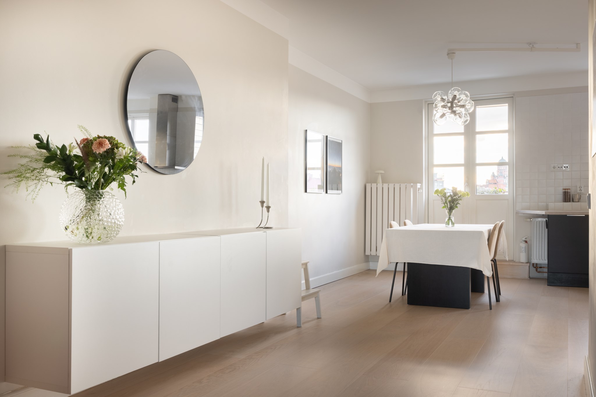 Trivsam och ljus matplats invid köket med ljust golv och ljusa väggar. Plats för en matgrupp och övrigt möblemang.