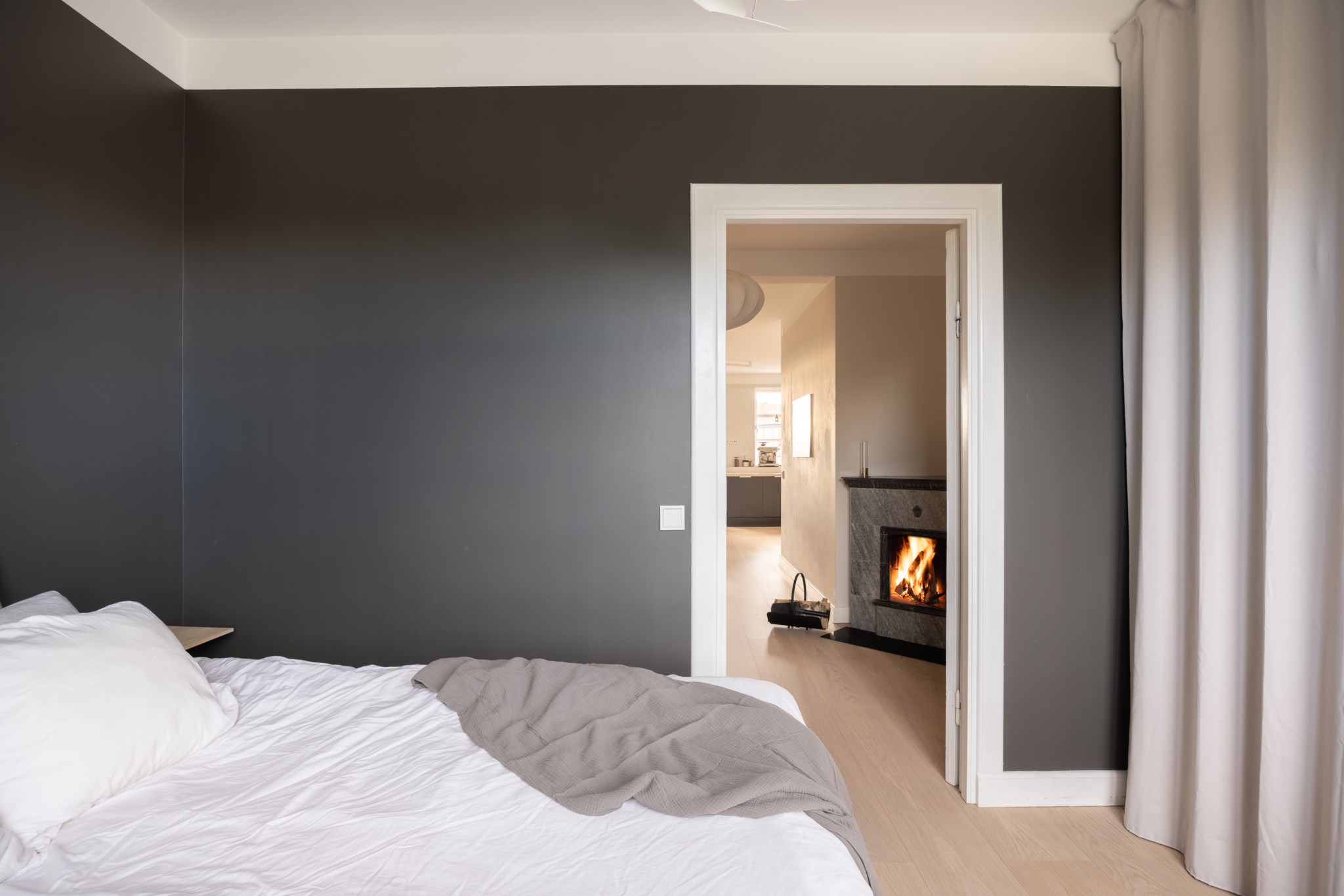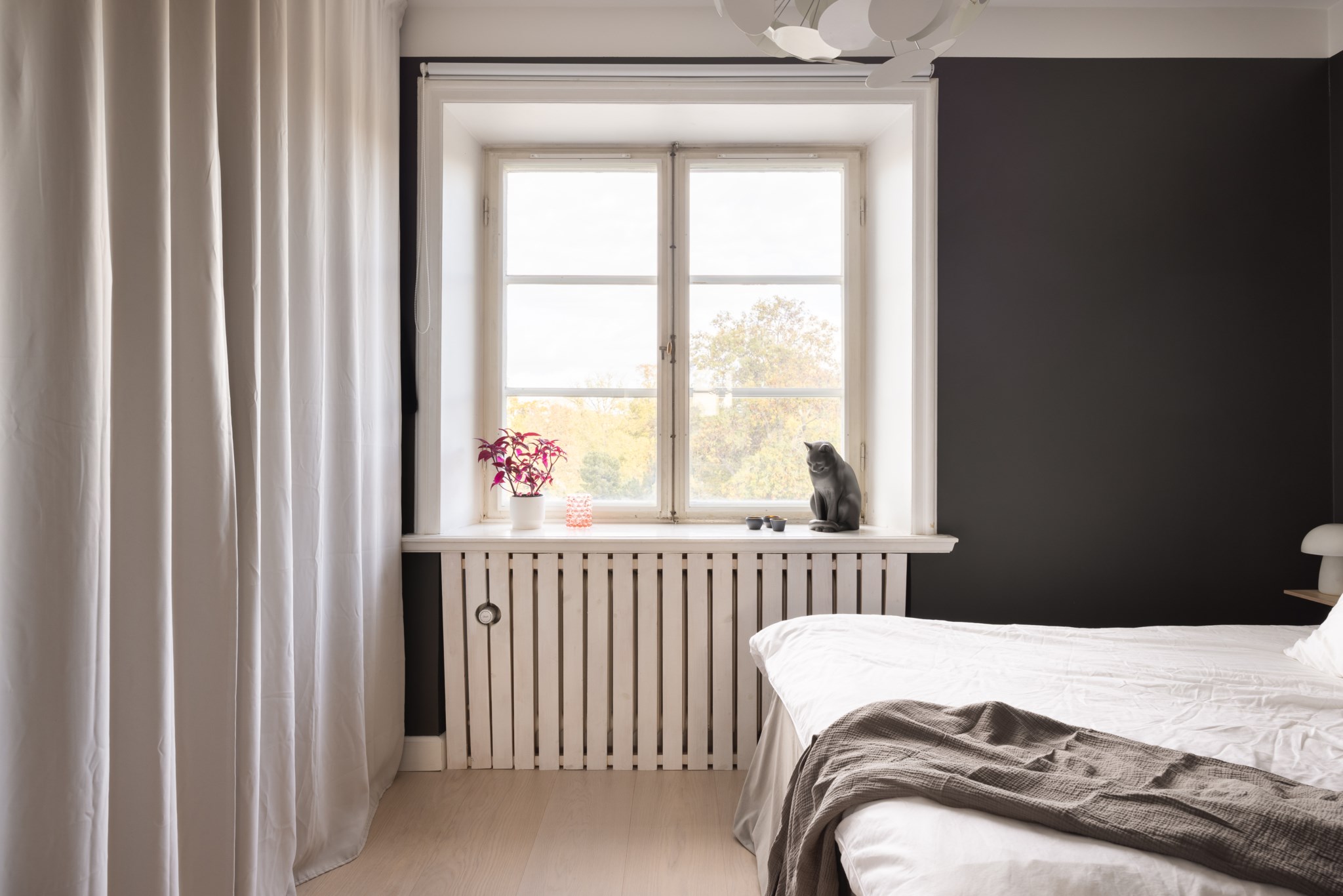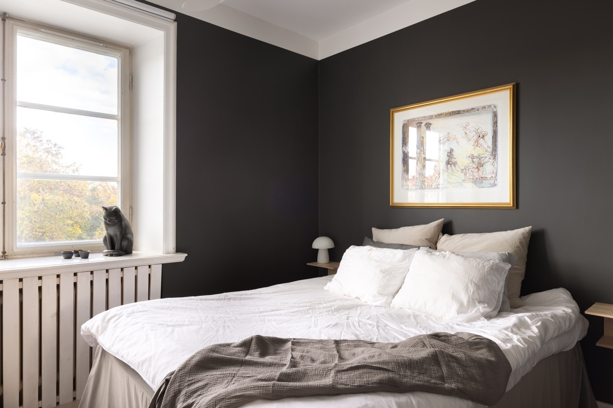 Rogivande sovrum med ytskikt bestående av ljust golv och en mörkare nyans på väggarna. Plats för större säng och annat möblemang i form av nattduksbord eller en förvaringsmöbel efter smak och behov. Gott om förvaring i form av garderober. Fint ljusinsläpp från ett stort fönster.