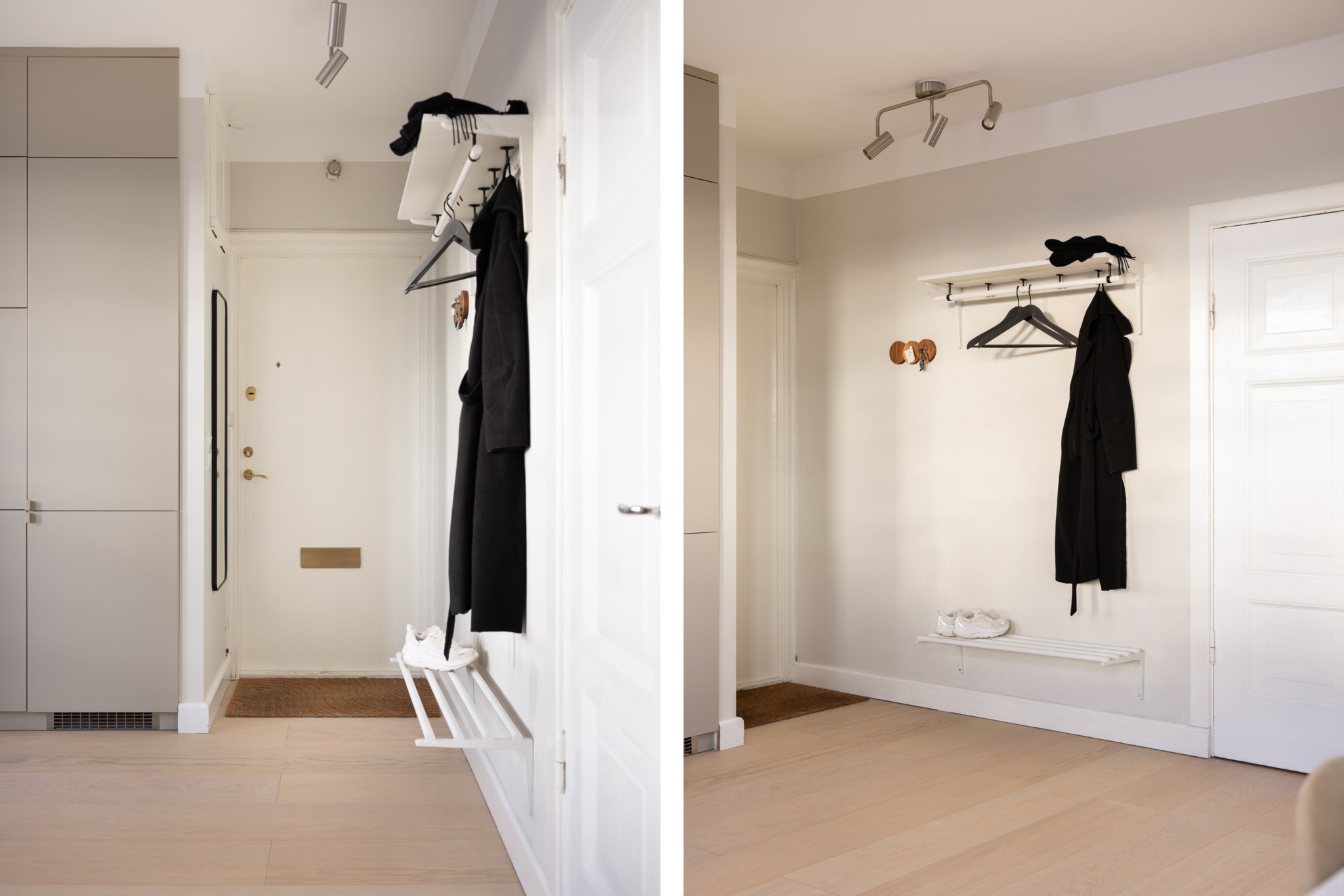 Välkomnande hall med plats för avhängning och skoställ. Här finns även generöst med förvaringsmöjligheter via garderober. Ytskikt bestående av ljusa väggar och ljust golv.