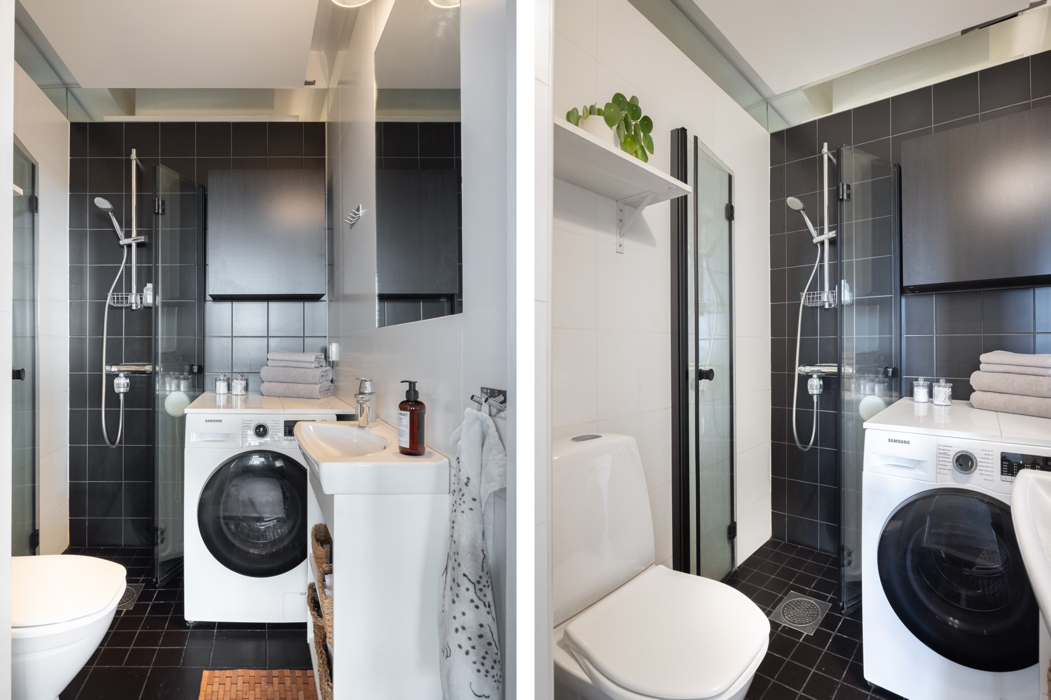 Generöst badrum med mörkt kakel och klinker. Badrummet är utrustat med WC, handfat ovan kommod, spegel, dusch med glassväggar samt kombinerad tvättmaskin. Här finns även vägghyllor som lämnar plats för ytterligare förvaring.