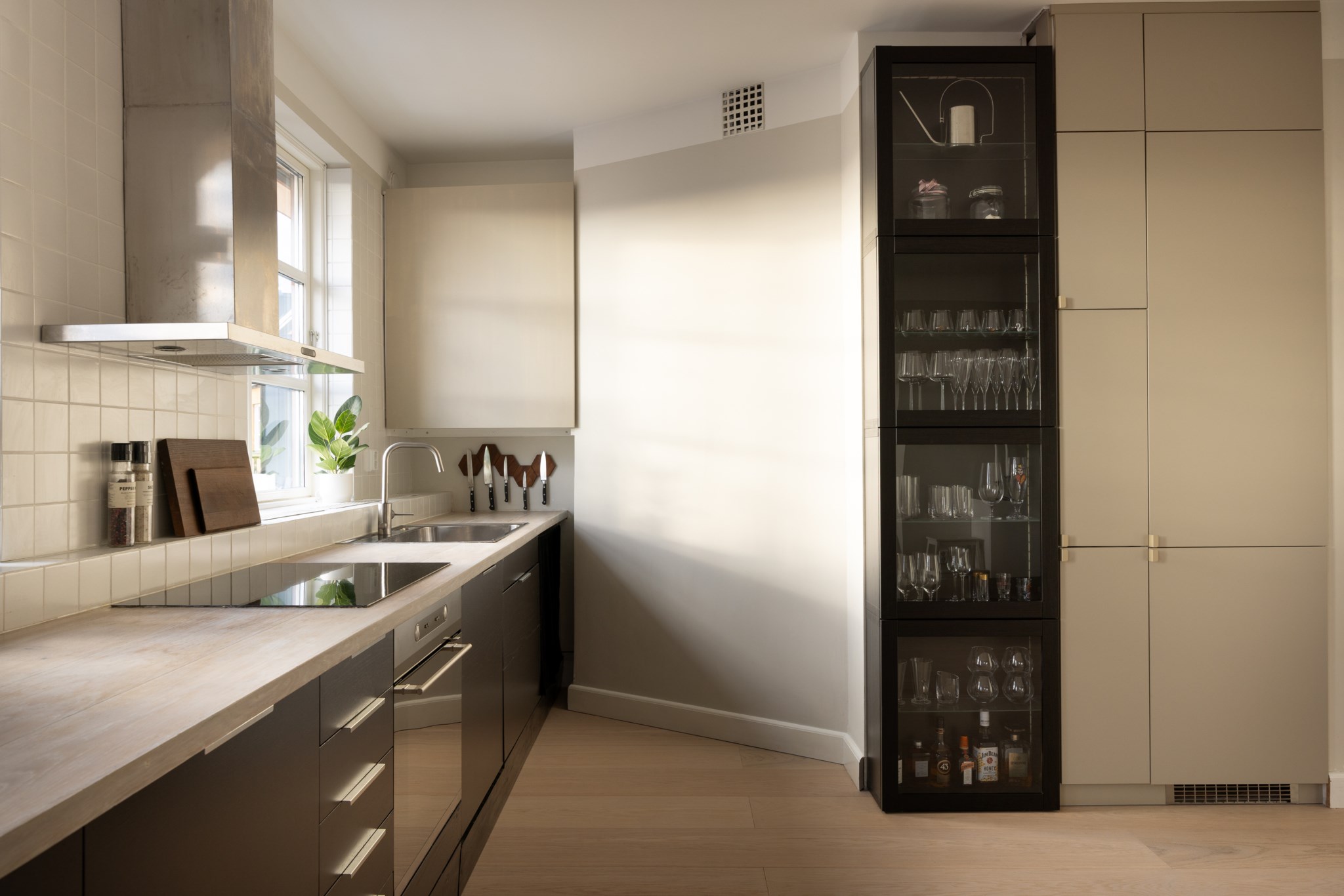 Väloptimerat kök med ljust golv och ljusa väggar. Ytskikt bestående av köksluckor i både en mörkare och en ljusare nyans med en arbetsyta ovan i form av en ljus bänkskiva. Köket är utrustat med häll, fläkt, ugn, diskmaskin, vitrinskåp samt kyl och frys.