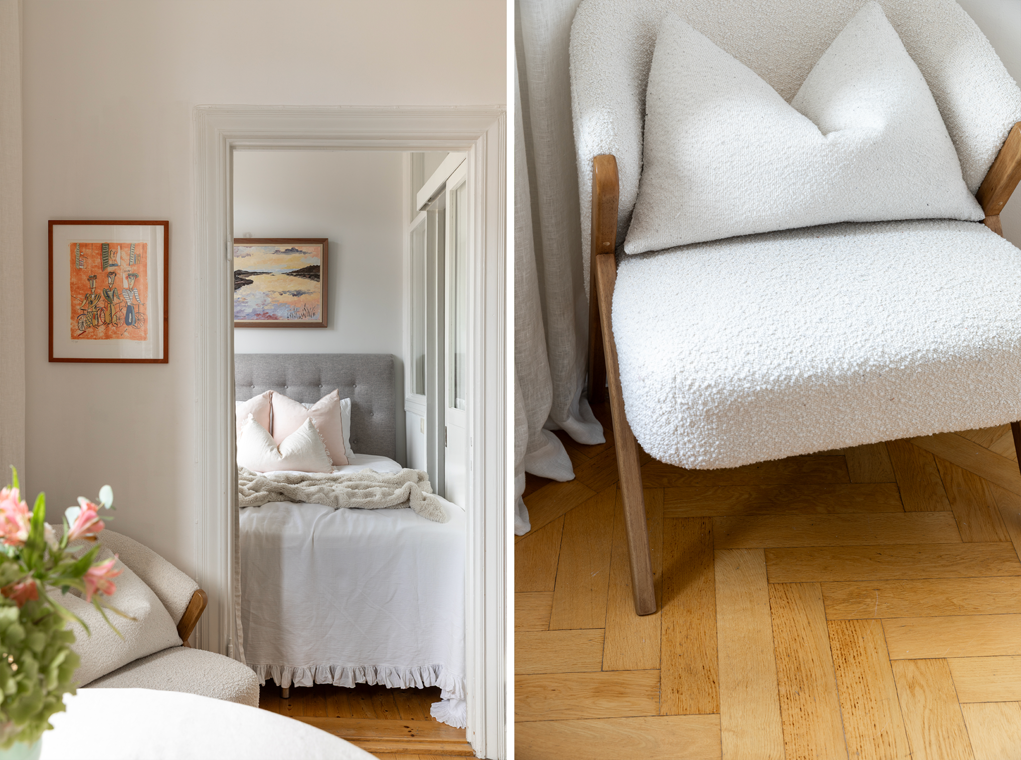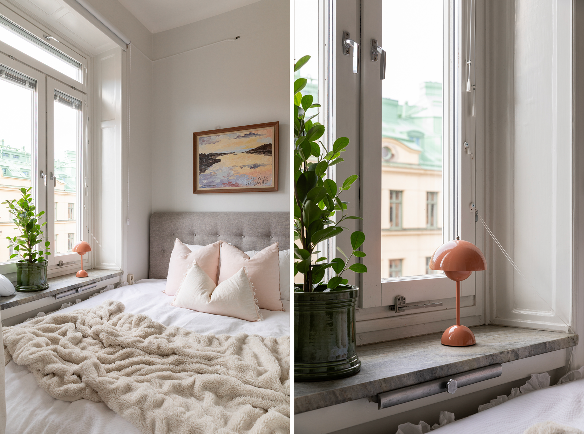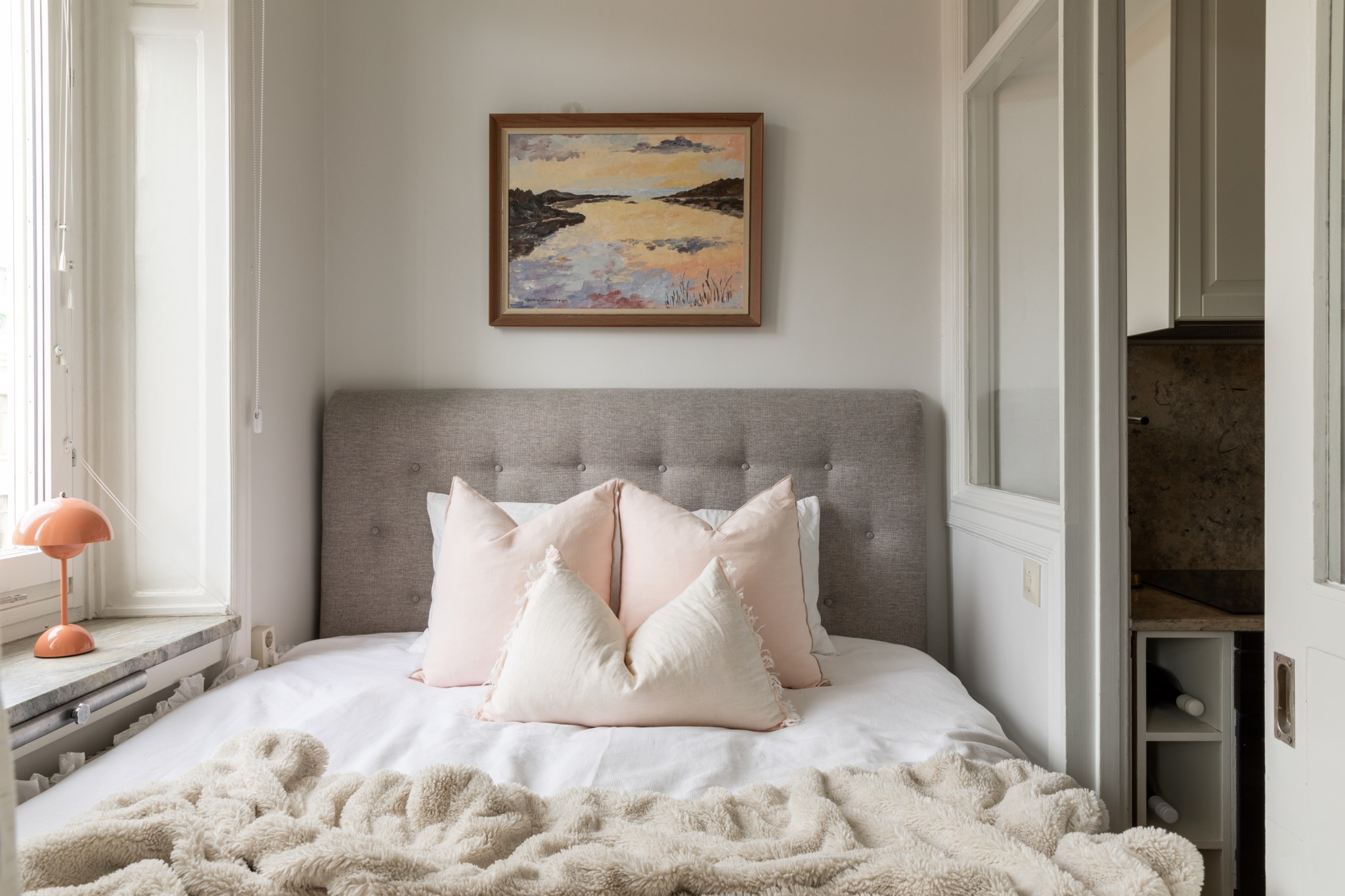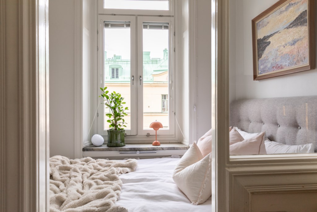 Mindre sovrum med genomgående ljusa väggar. Fint ljusinsläpp från det stora fönstret i rummet.