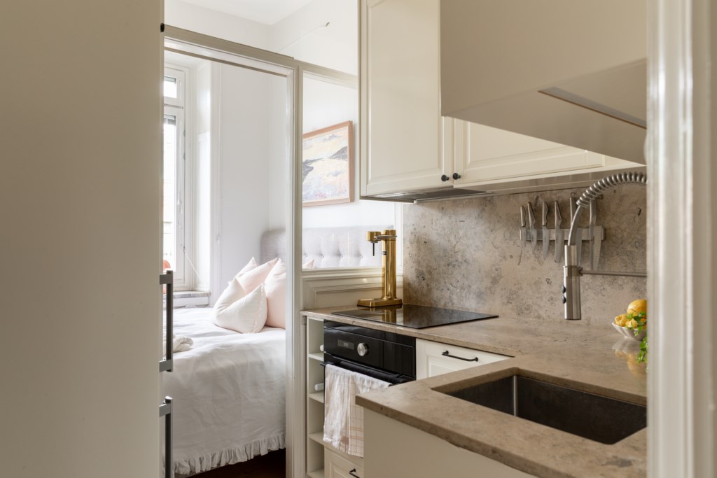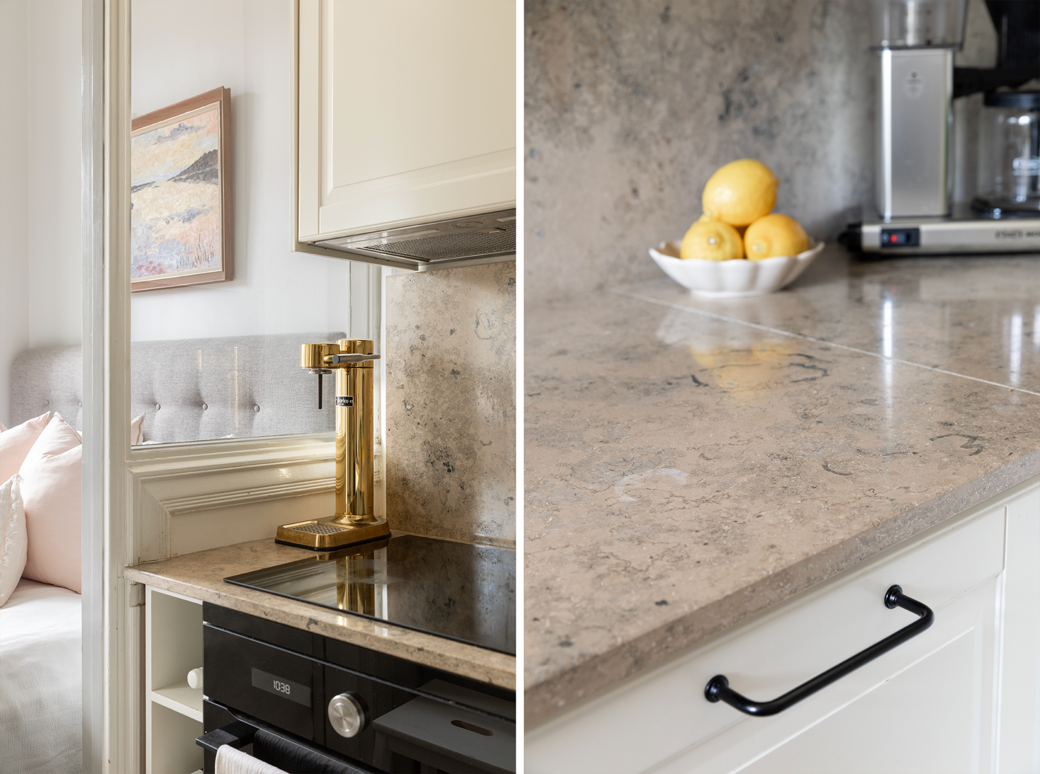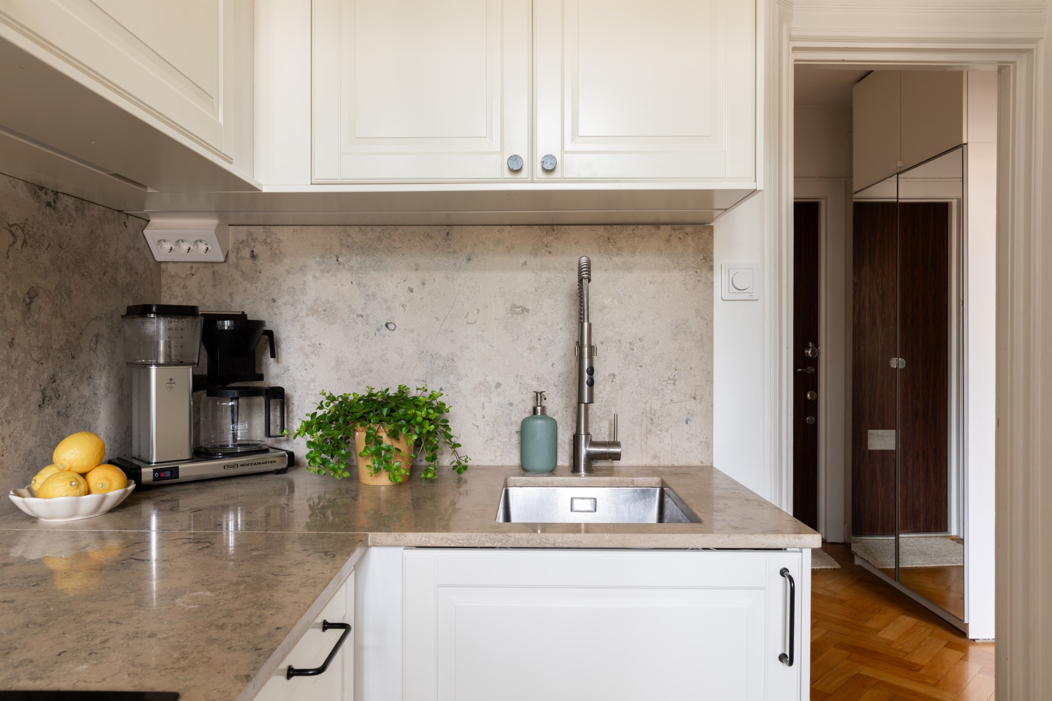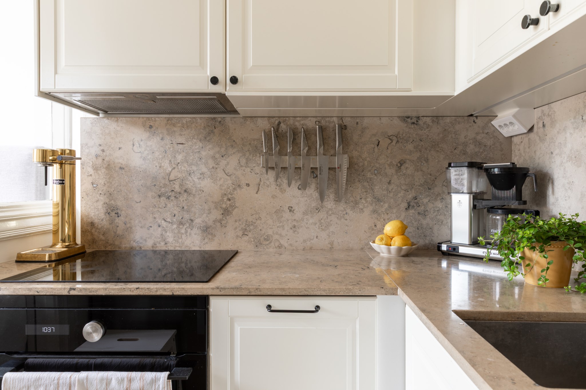 Modernt och fräscht kök med genomgående vita skåpsluckor och en vacker bänkskiva i natursten. Köket är utrustat med induktionshäll, kombiugn, diskmaskin samt kyl- och frys.
