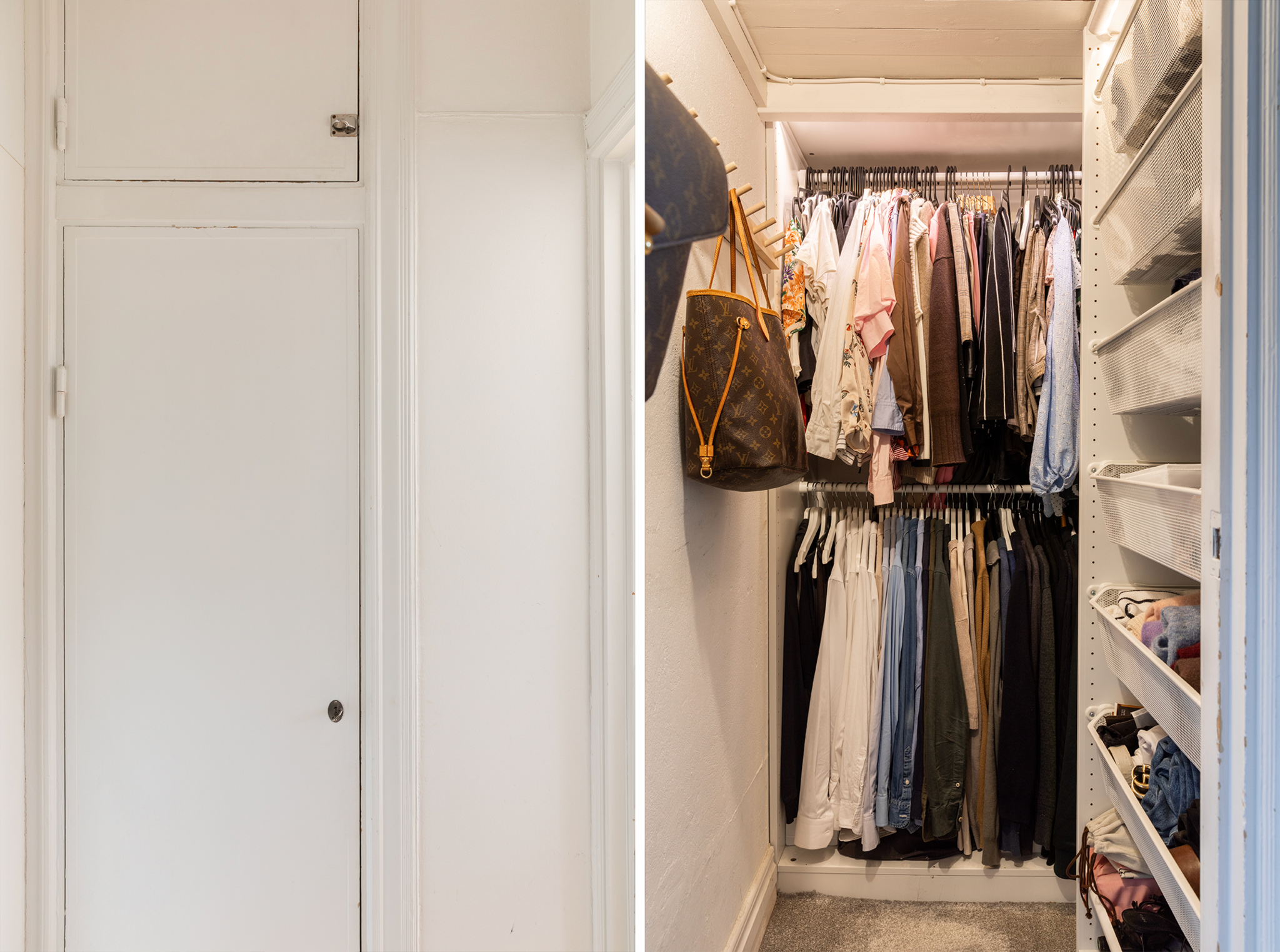 Klädkammare i anslutning till hall och vardagsrum. Här finns gott om klädförvaring i form av garderob och klädstänger.