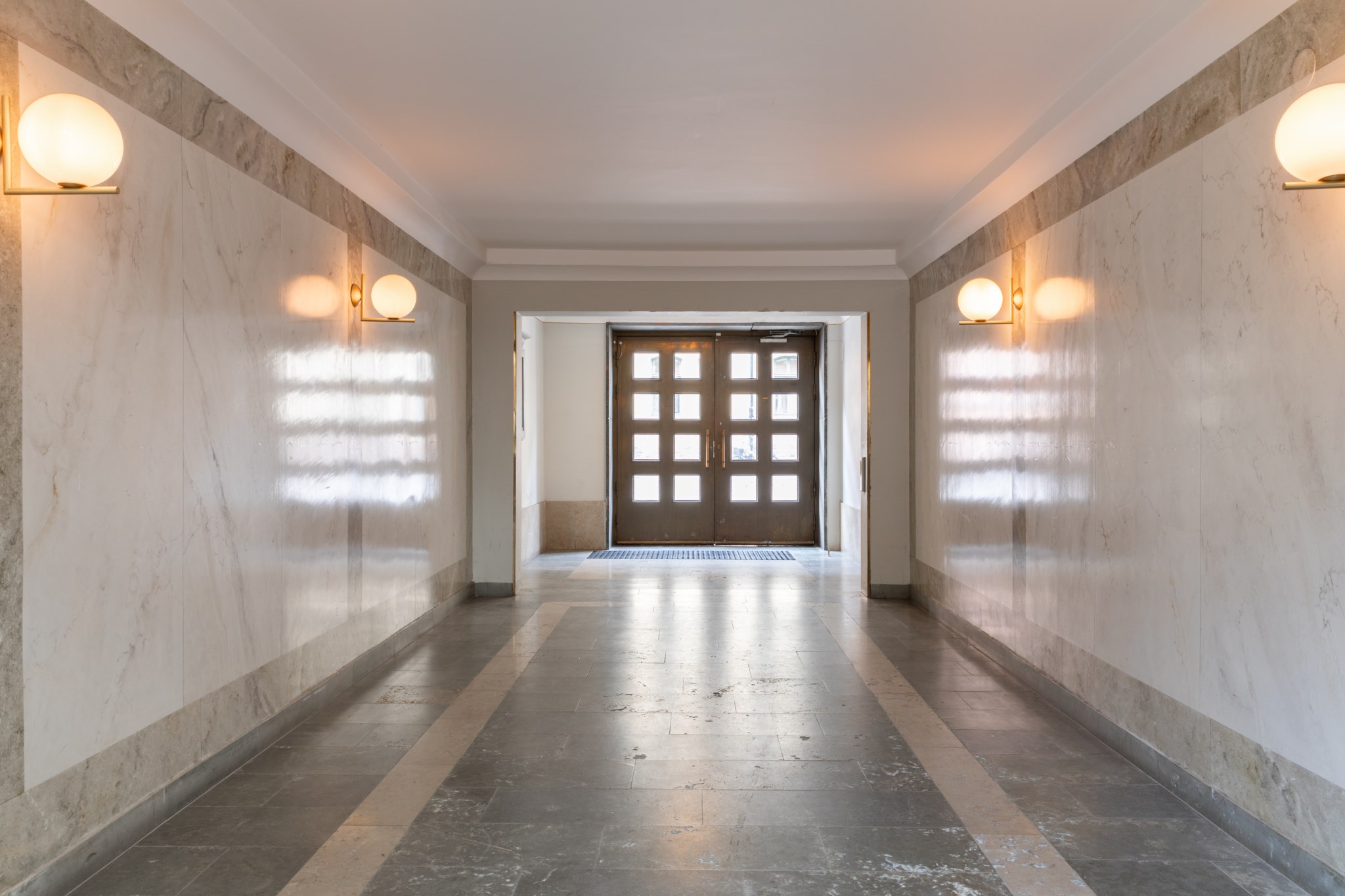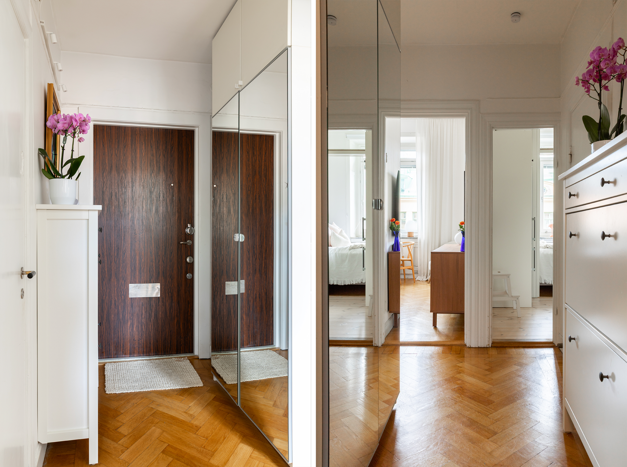 Ljus och fräsch hall med genomgående ljusa väggar. Gott om plats för avhängning samt förvaringsmöjligheter i form av garderob.