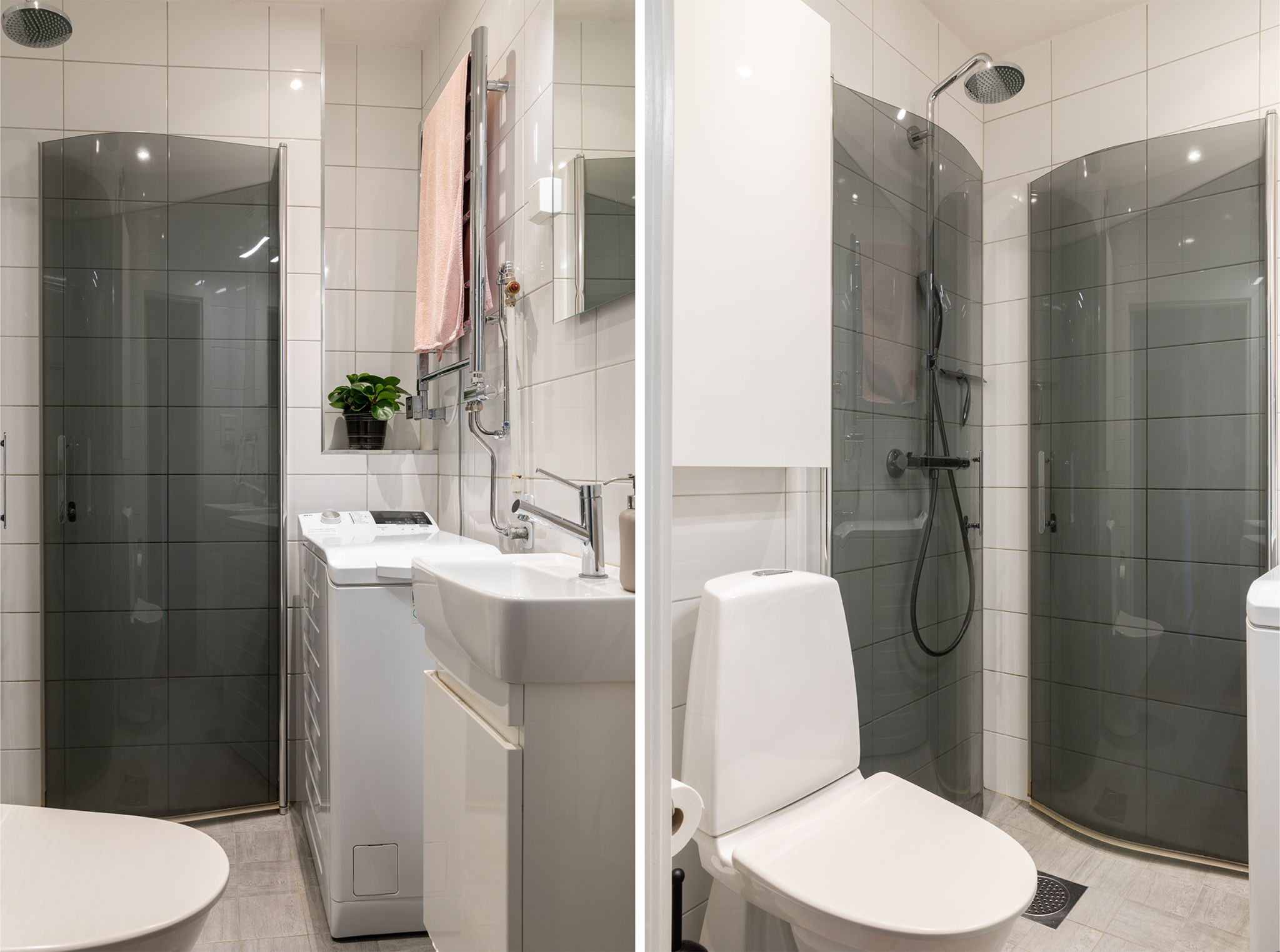 Ljust helkaklat badrum utrustat med dusch, handdukstork, handfat, tvättmaskin & golvvärme.