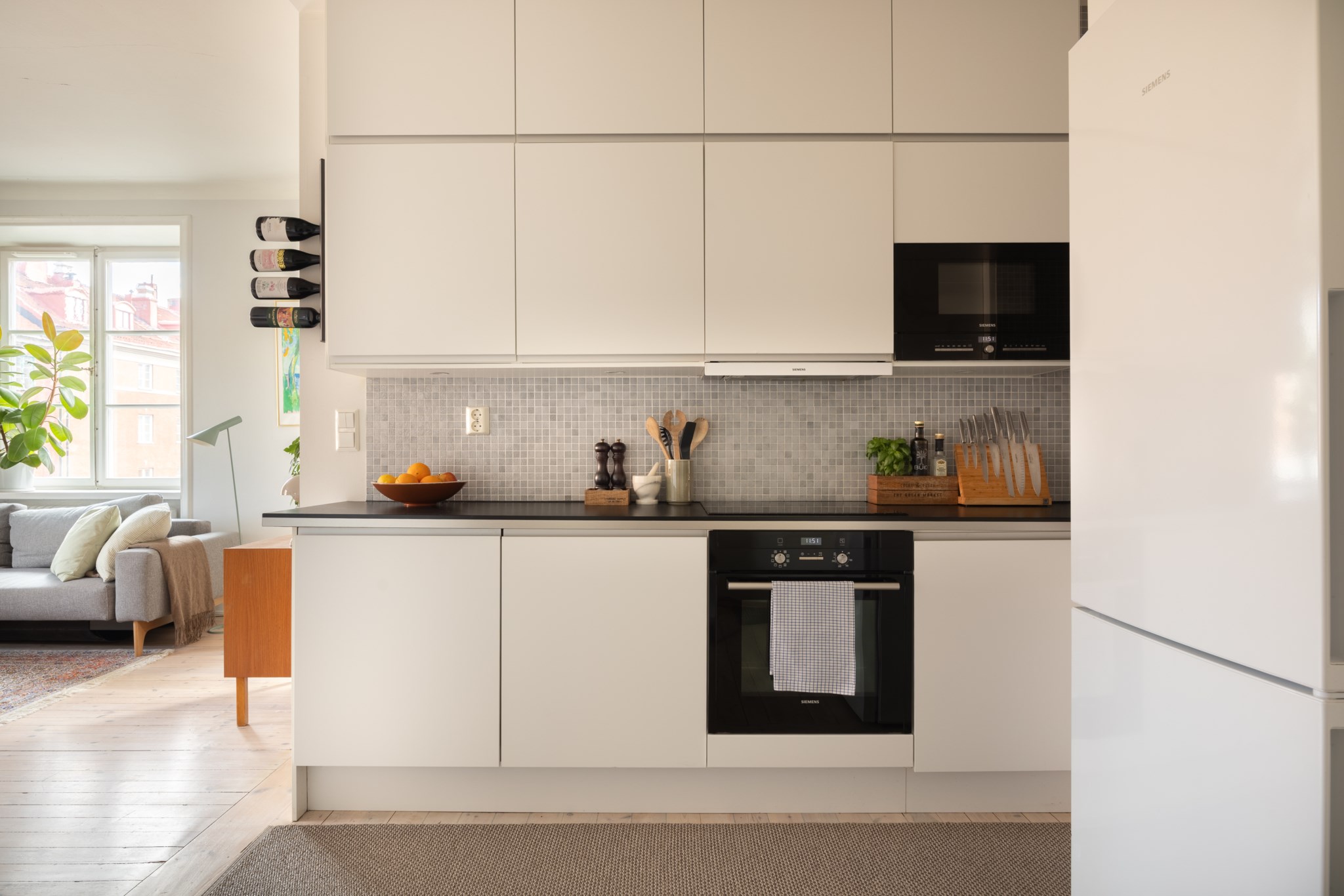 Rymligt kök i social planlösning med vardagsrum. Tidlösa materialval bestående av vita köksluckor och en mörk bänkskiva ovan. Köket är utrustat med diskho, induktionshäll, fläkt, ugn, inbyggd micro, diskmaskin samt kyl och frys. Ytskikten består av ljusa väggar och ljust furugolv. Här inryms även matgrupp.