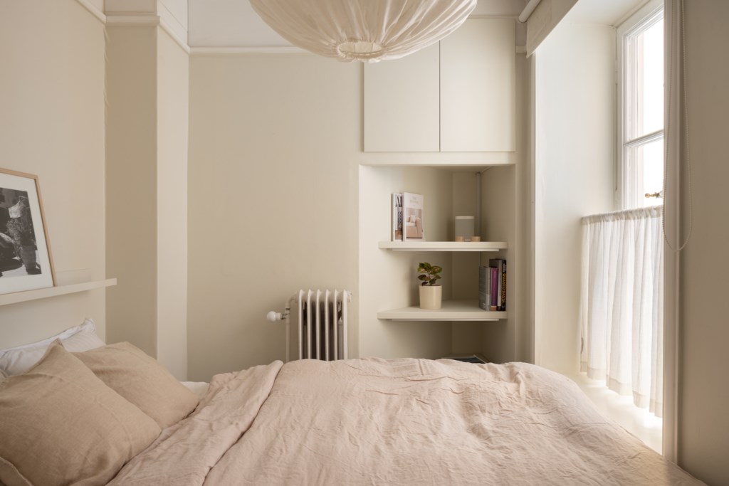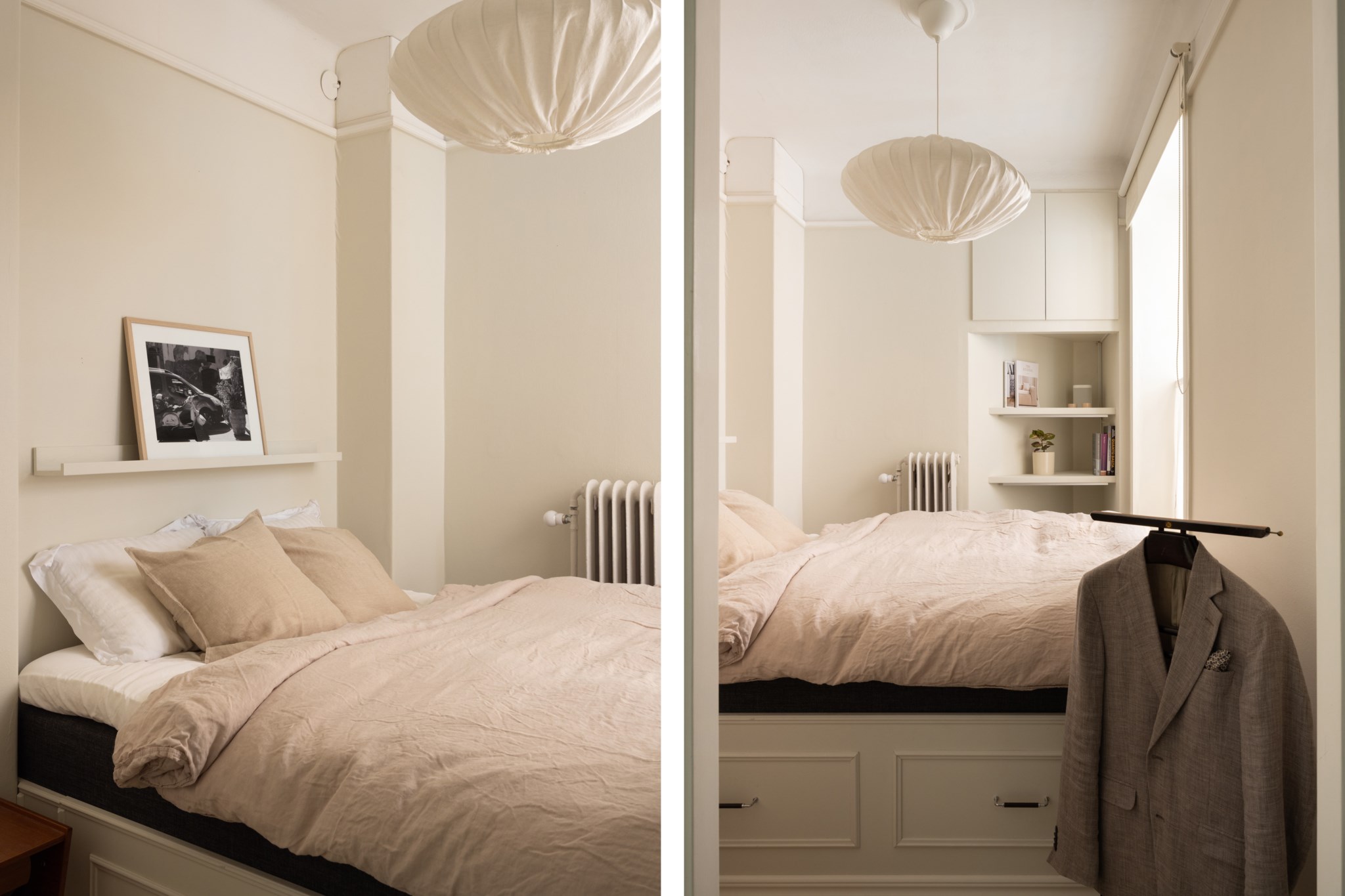 Mysigt sovrum med plats för säng och annat möblemang efter smak och behov. Ett härligt ljusinsläpp tar sig in via ett spröjsat fönster. Tidlösa ytskikt bestående av ljusa väggar och ljust trägolv.
