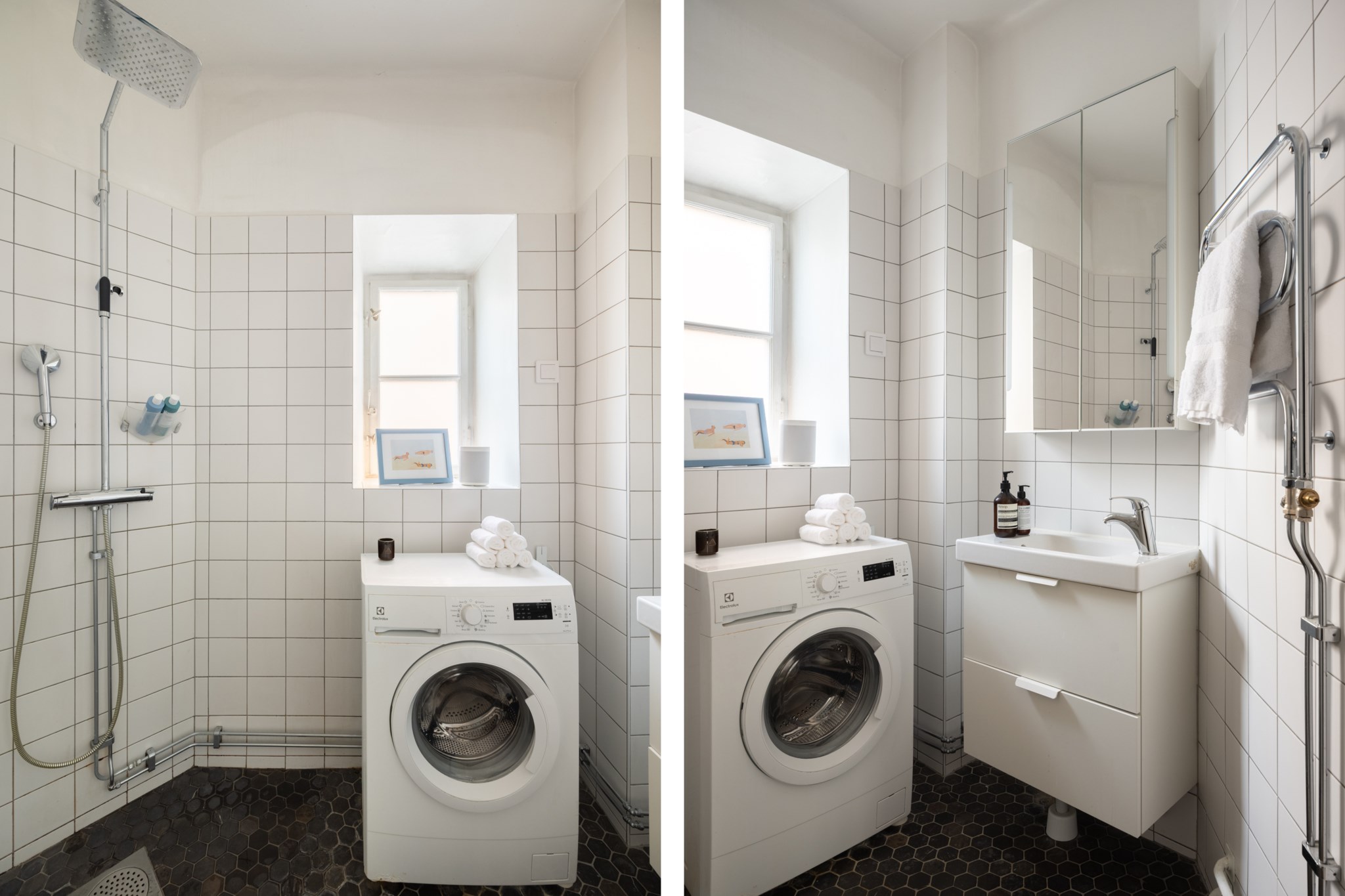 Rymligt duschrum med ljust kakel och mörkt klinker. Rummet är utrustat med WC, handdukstork, handfat ovan kommod, spegelskåp, samt dusch. Extra bekvämligheter genom en tvättmaskin och golvvärme.
