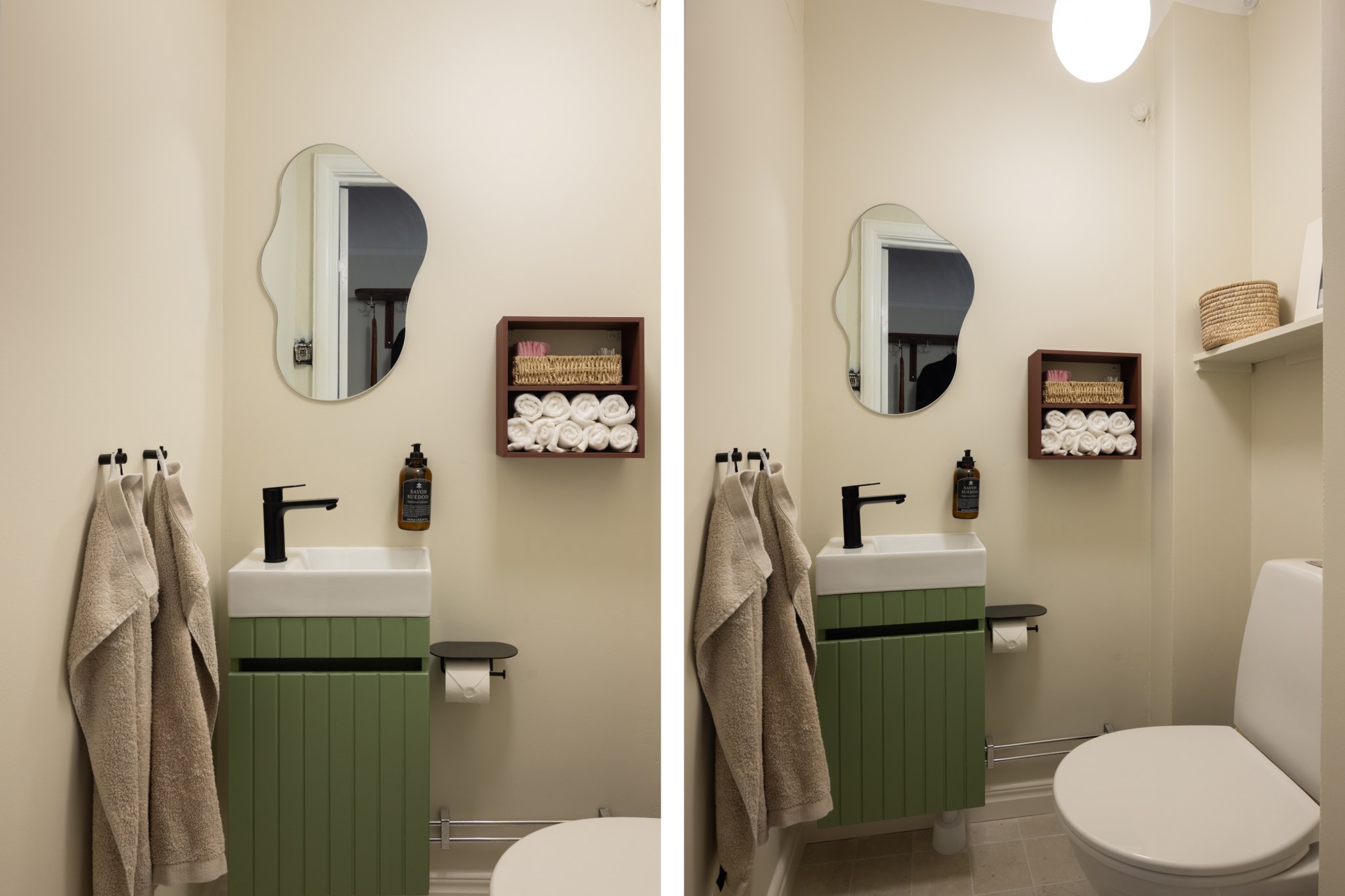 Med ljusa väggar och ljust klinker. Rummet är utrustat med WC, handfat ovan kommod samt en spegel.