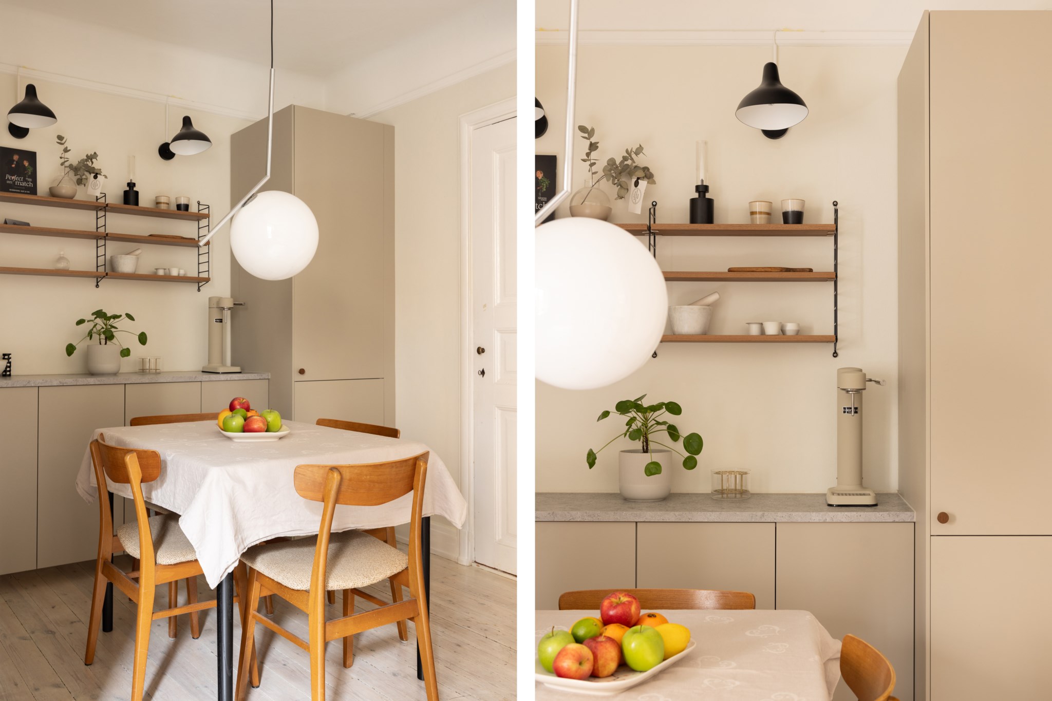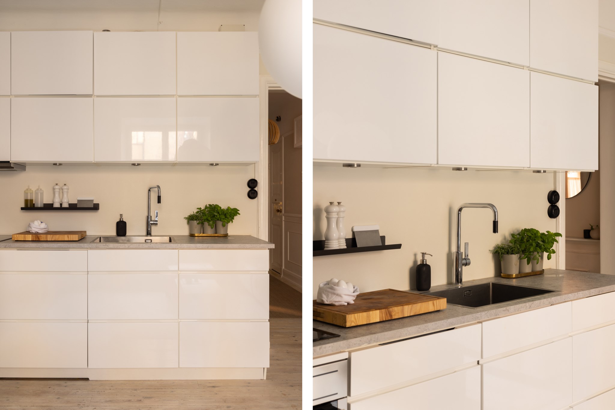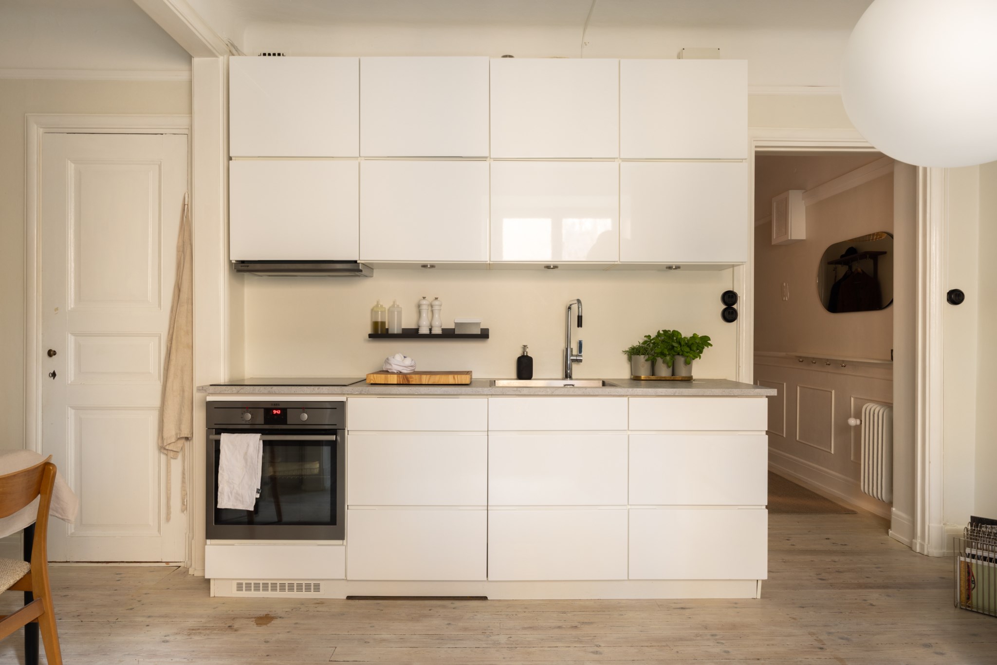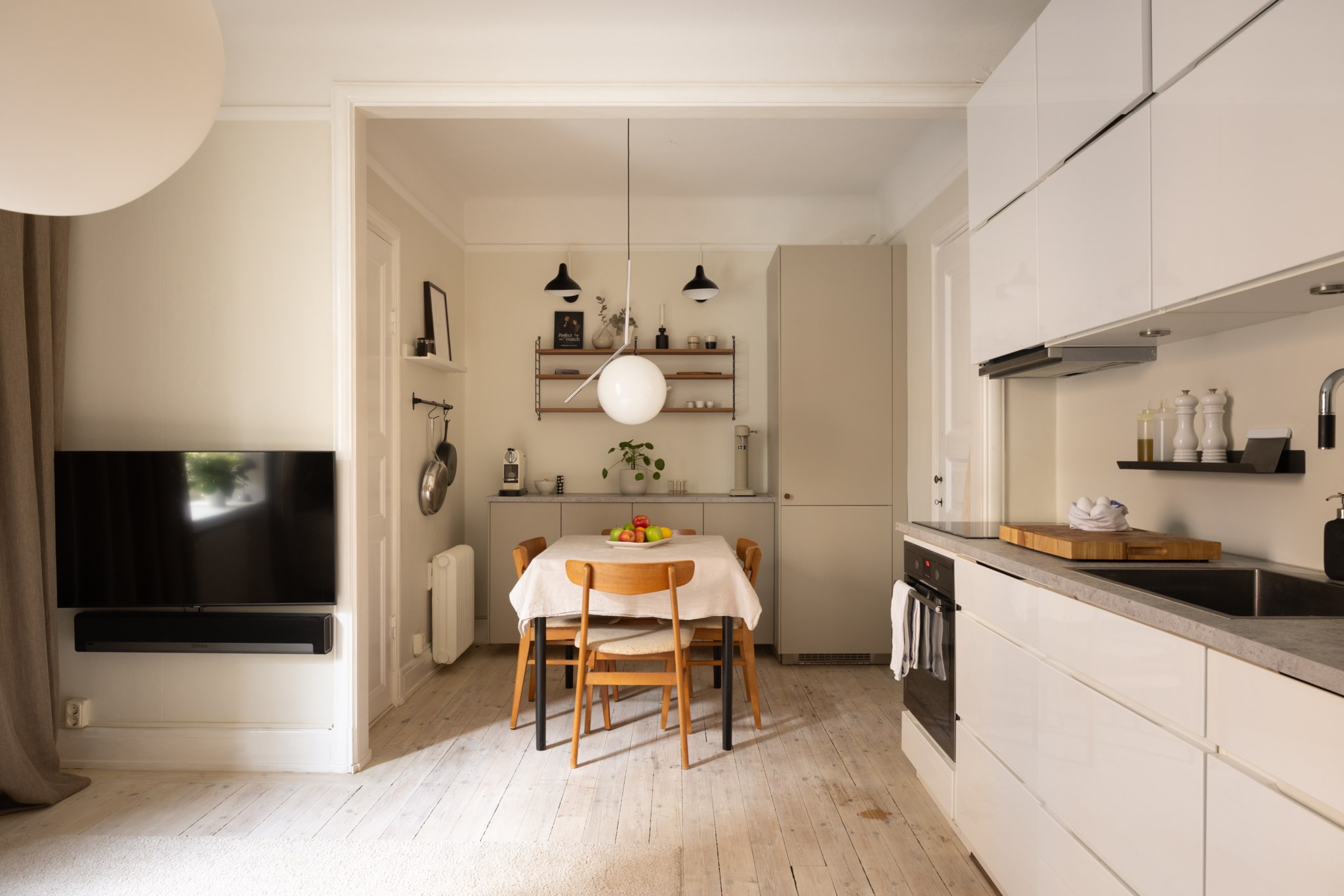Modernt kök med smakfulla materialval bestående av vita köksluckor och ljus bänkskiva. Den maskinella utrustningen består av diskho, induktionshäll, ugn, köksfläkt, diskmaskin samt kyl och frys. I köket finns plats för en matgrupp och ett härligt ljusinsläpp tar sig in via ett stort spröjsat fönster. Tidlösa ytskikt bestående av ljusa väggar och ljust trägolv.