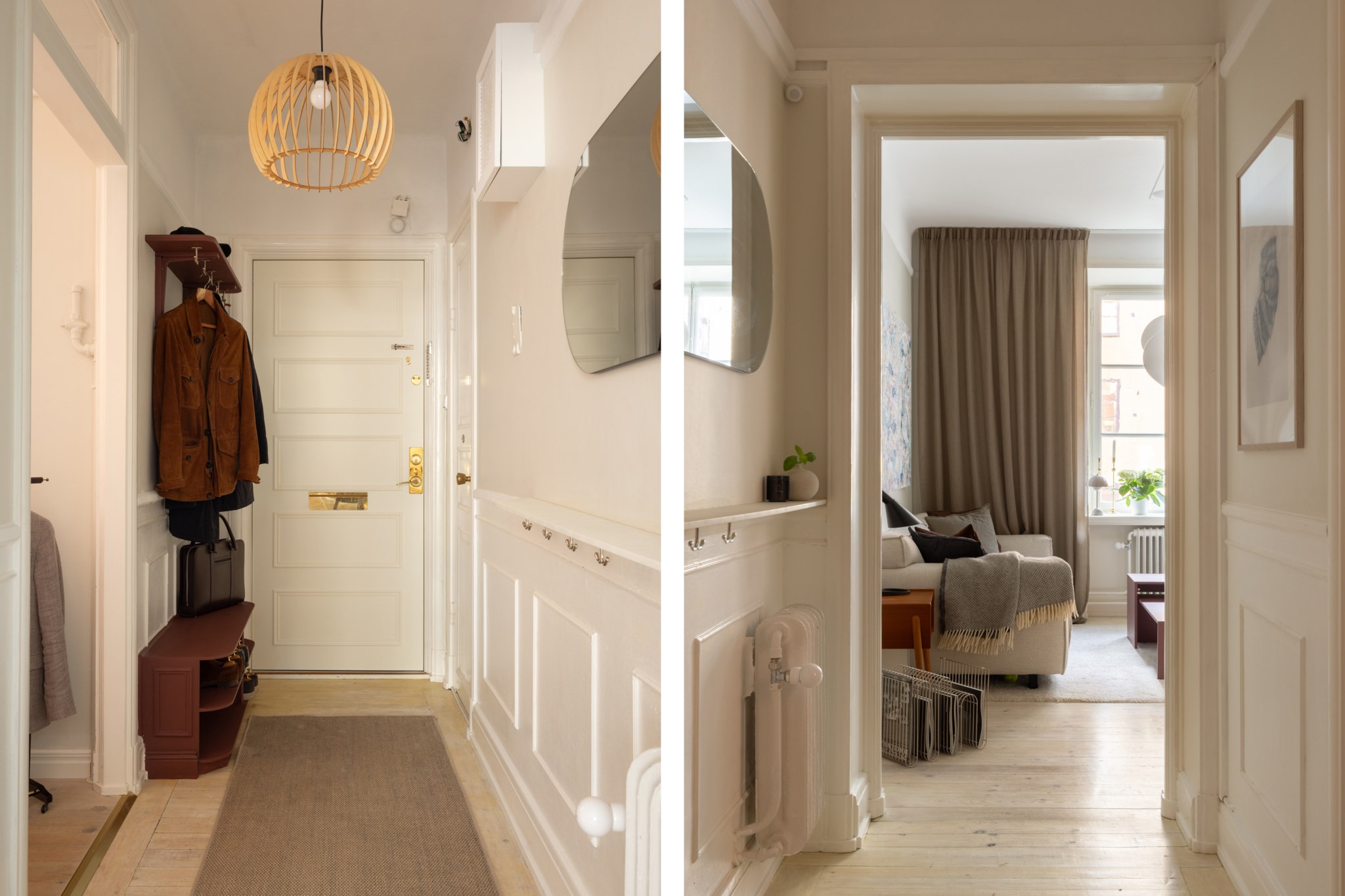 Välkomnande hall med plats för avhängning, skoställ samt mindre avlastningsmöblemang efter smak och behov. Tidlösa ytskikt bestående av ljusa väggar, bröstpanel och ljust trägolv.